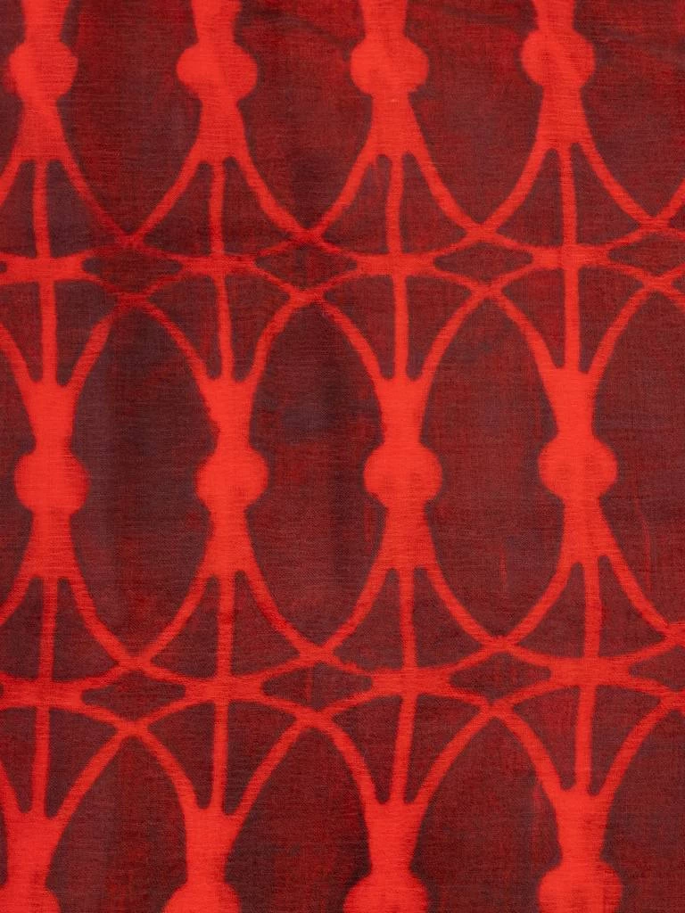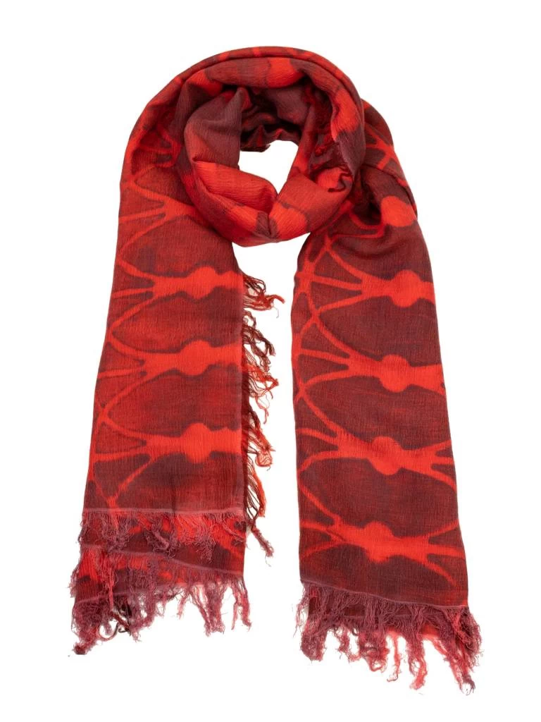 Large knit scarf with print throughout and fringed edges.