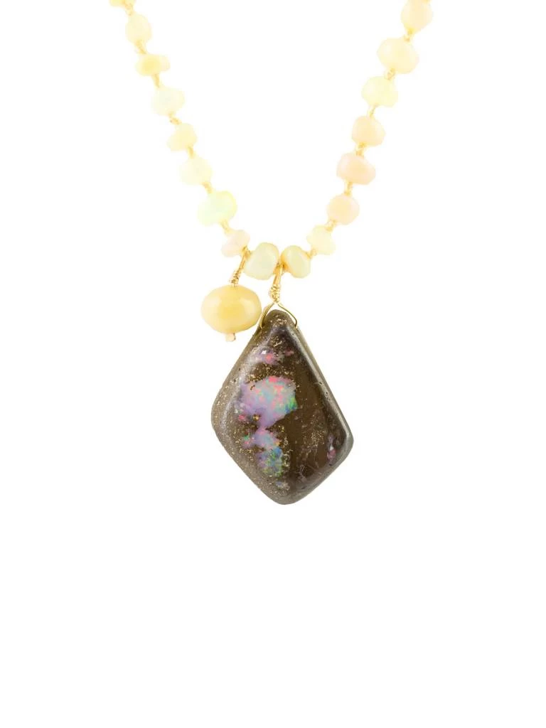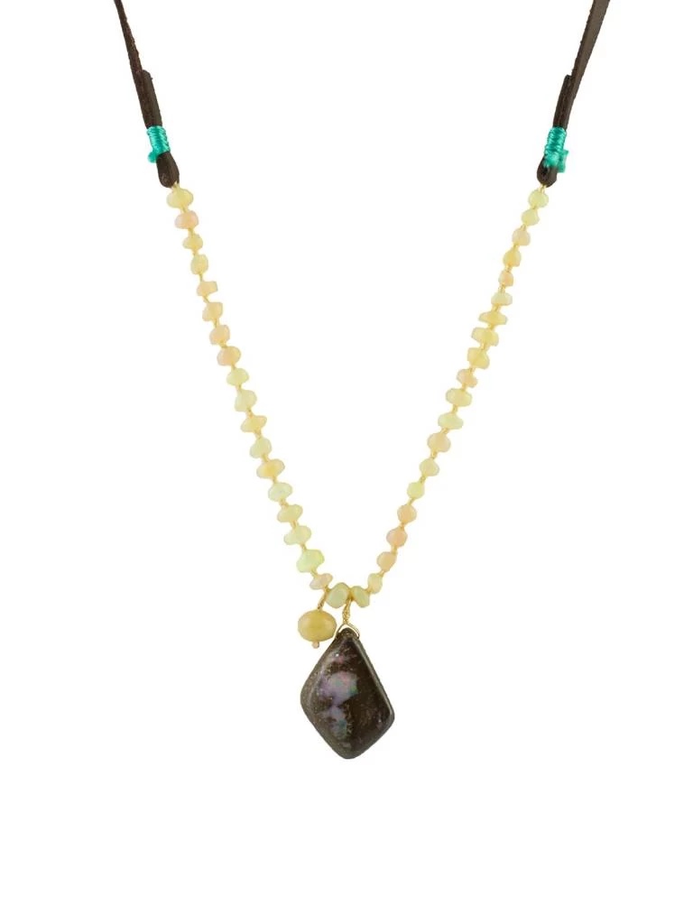 A deerskin strap necklace Ethiopian opal beads with a boulder opal drop pendant.