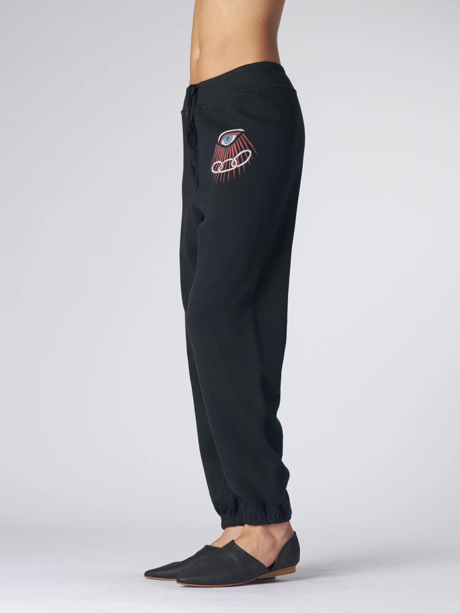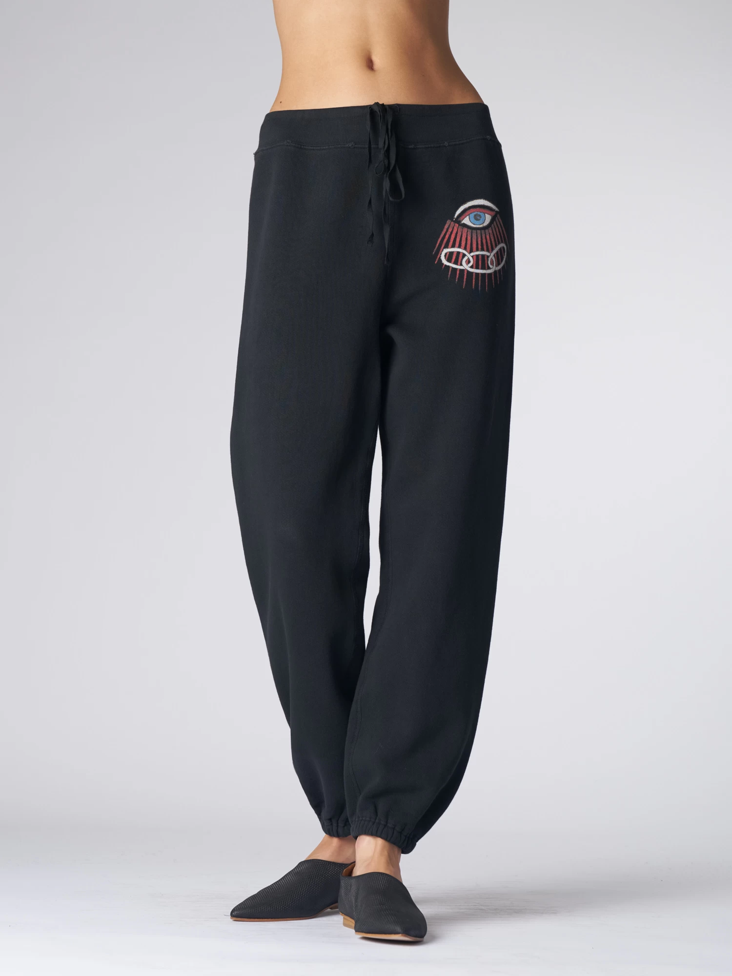 Very comfortable pants feature a laid-back fit with an easy drawstring waist and evil eye motif.