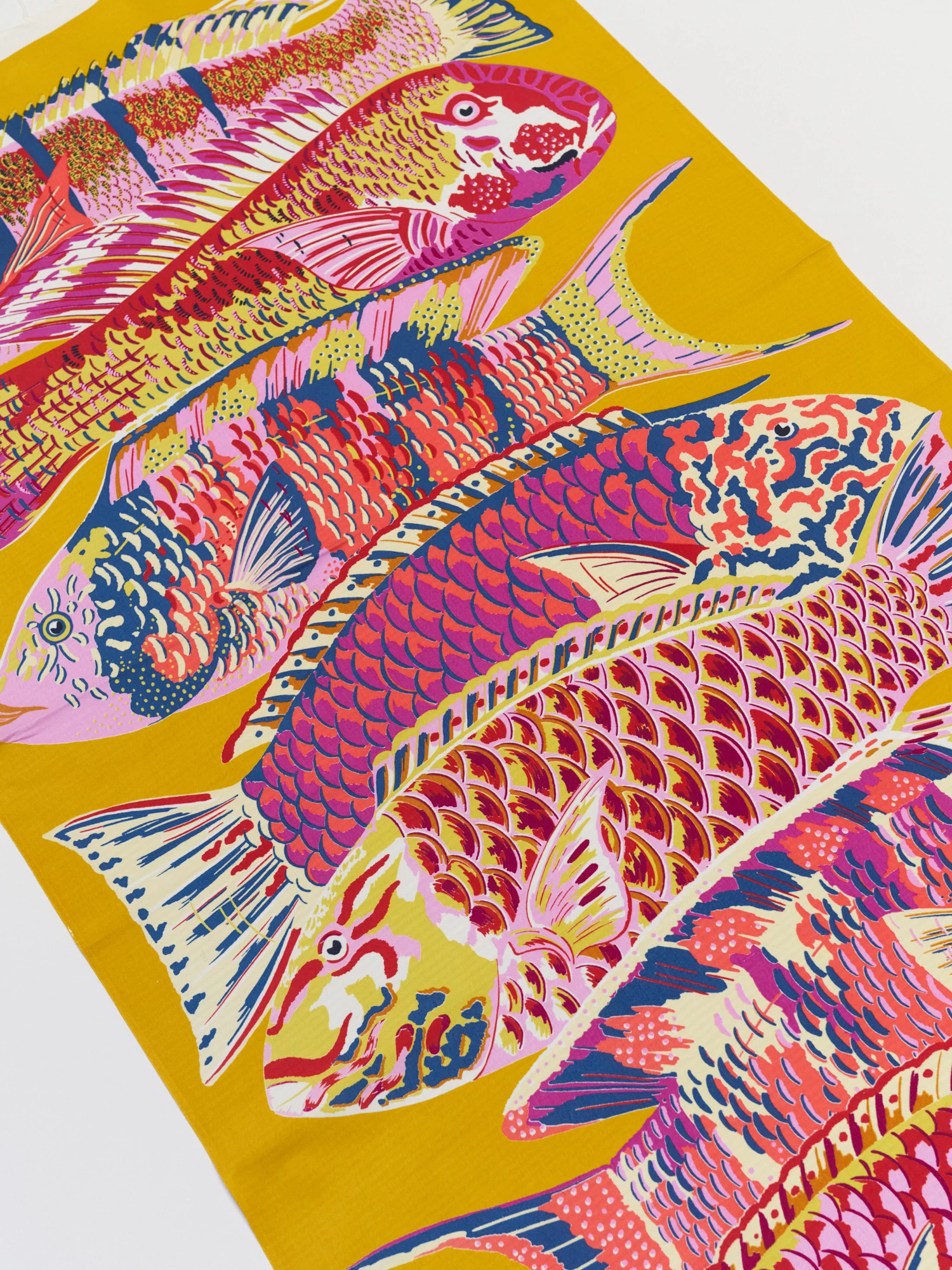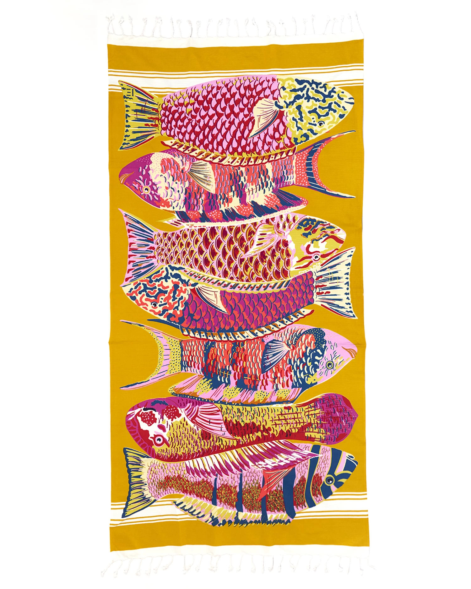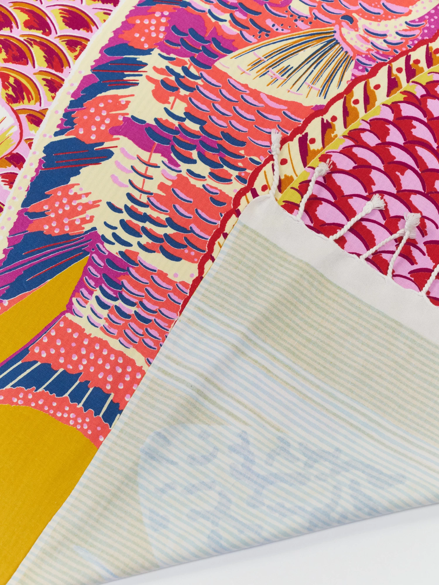 The Fouta in a sturdy cotton weave is illustrated with patterns full of colors. Use it as a sarong, beach towel, pareo, bed throw, or tablecloth.