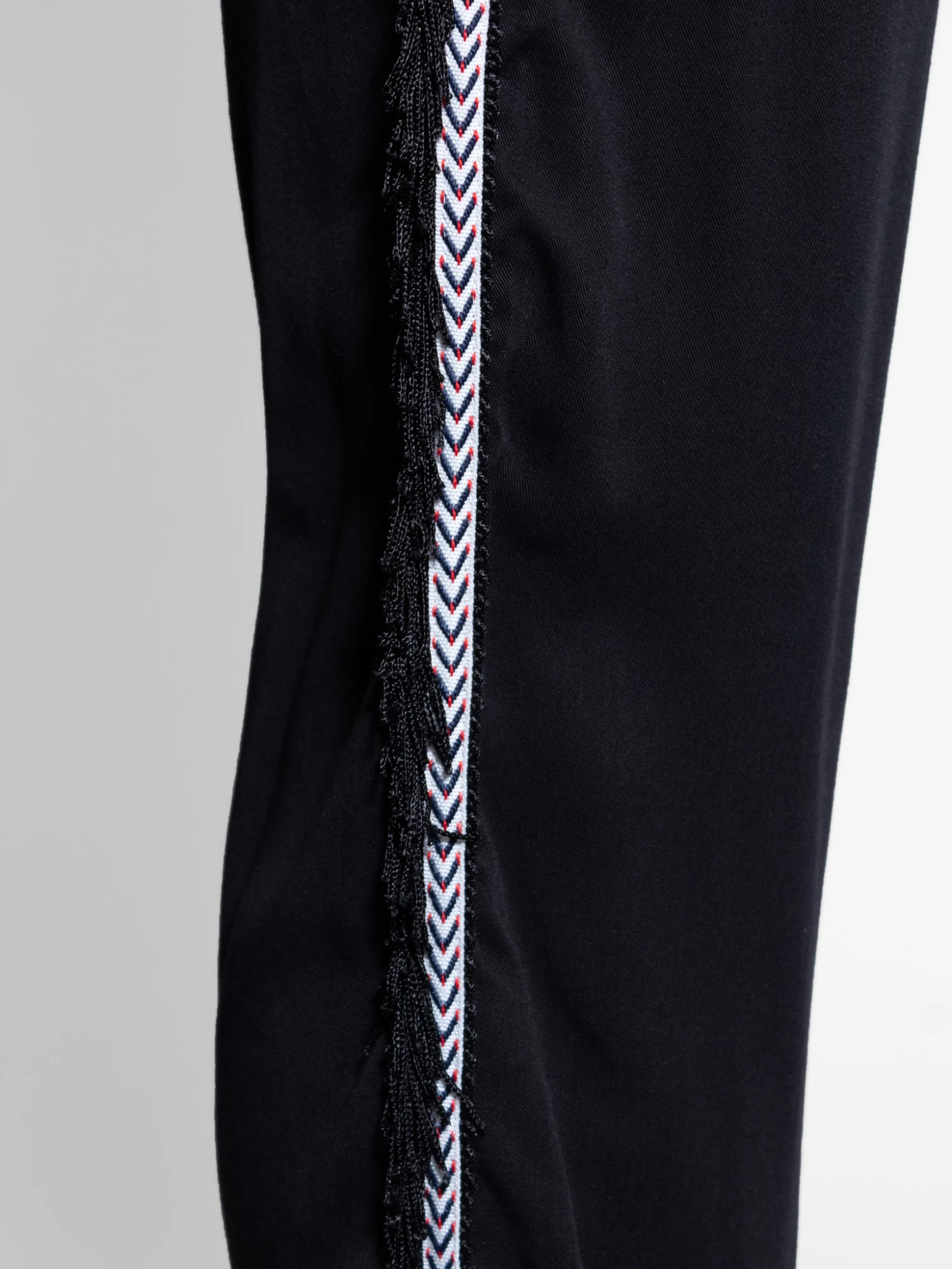 Pull on pants with an elasticized waist and two front pockets features a printed ribbon and fringed detail on sides.