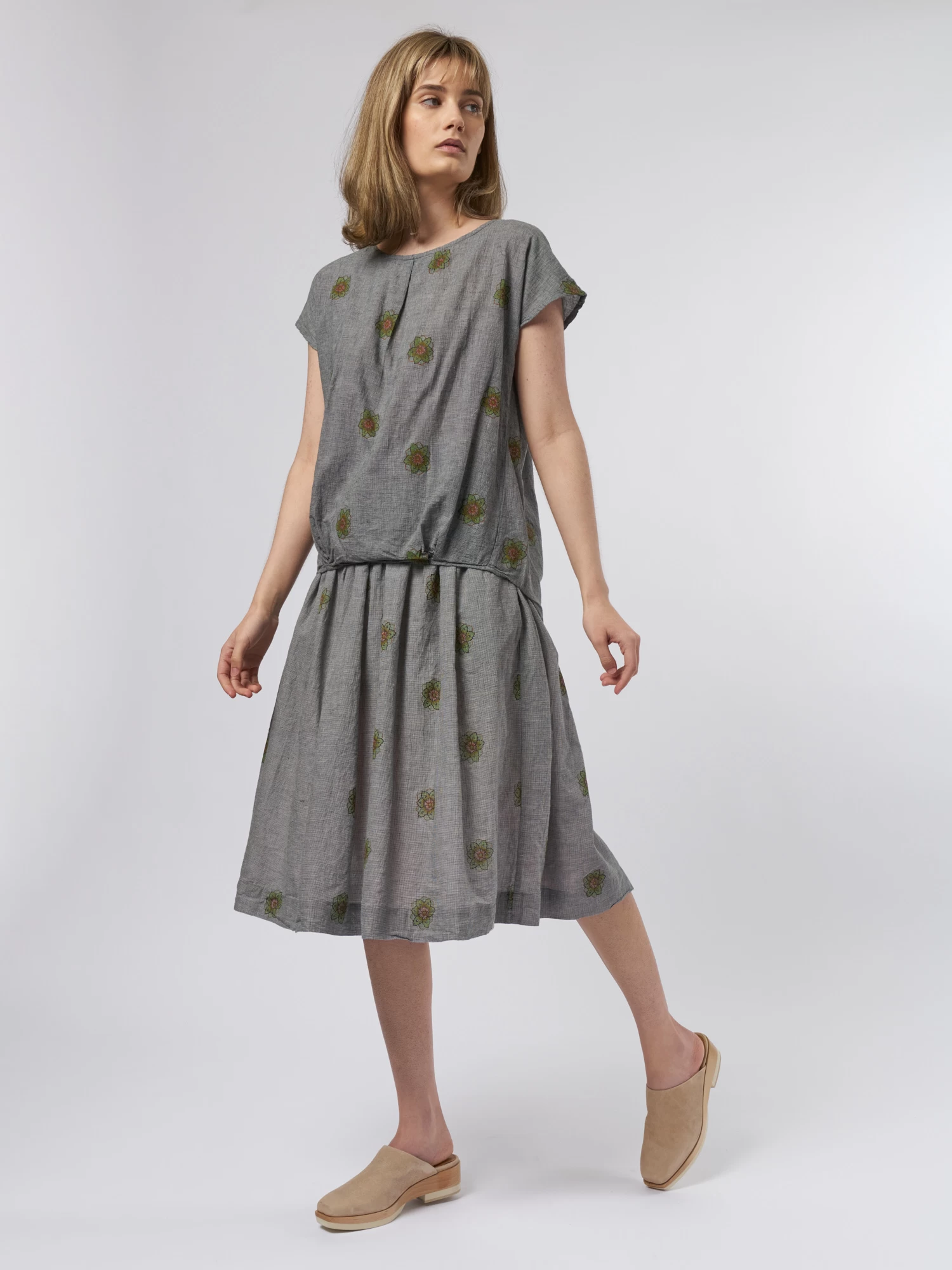 A knee-length Khadi Cotton skirt in Massai has two side pockets and pleats at elasticized waistband with a hidden inner drawstring.