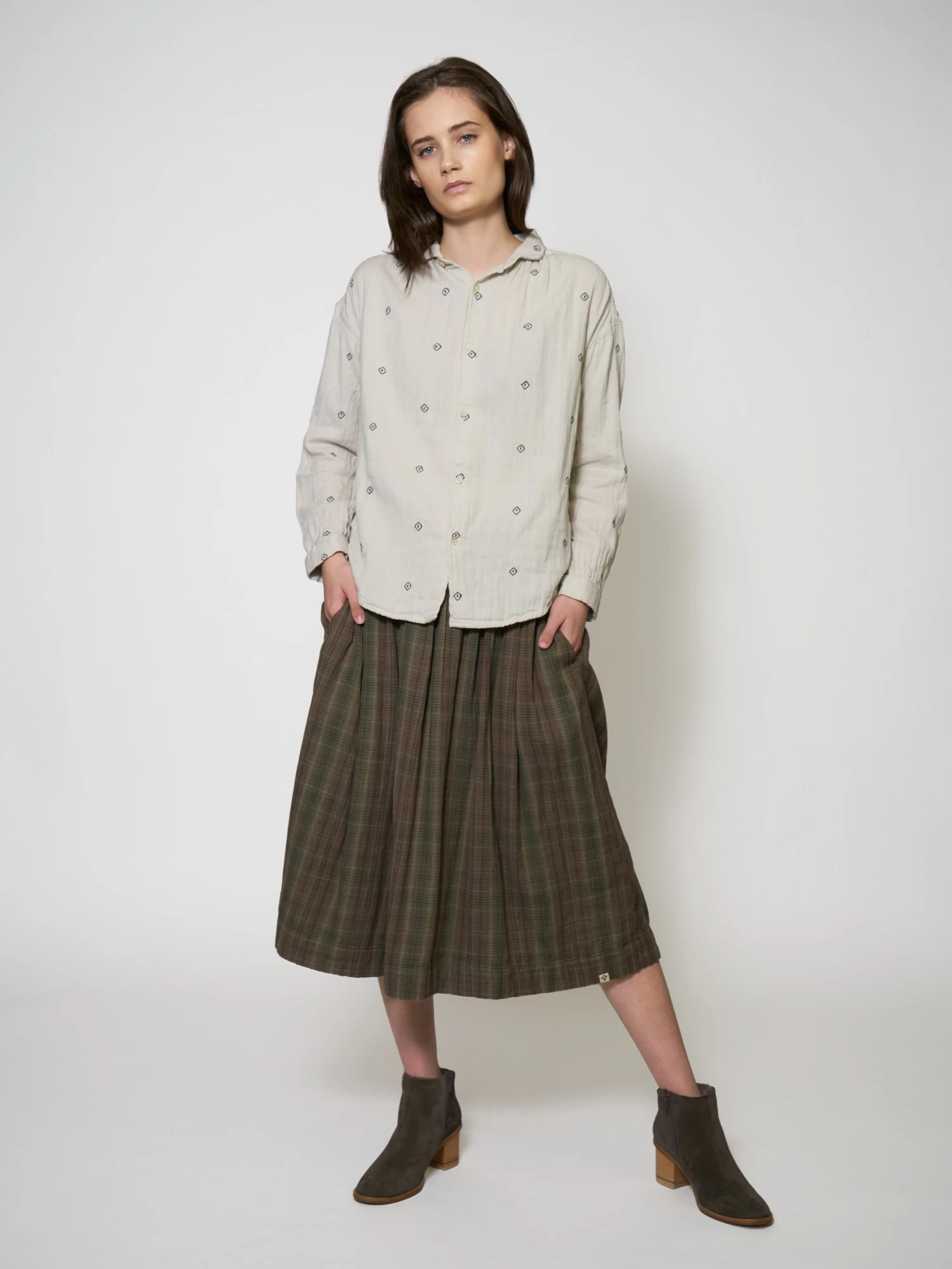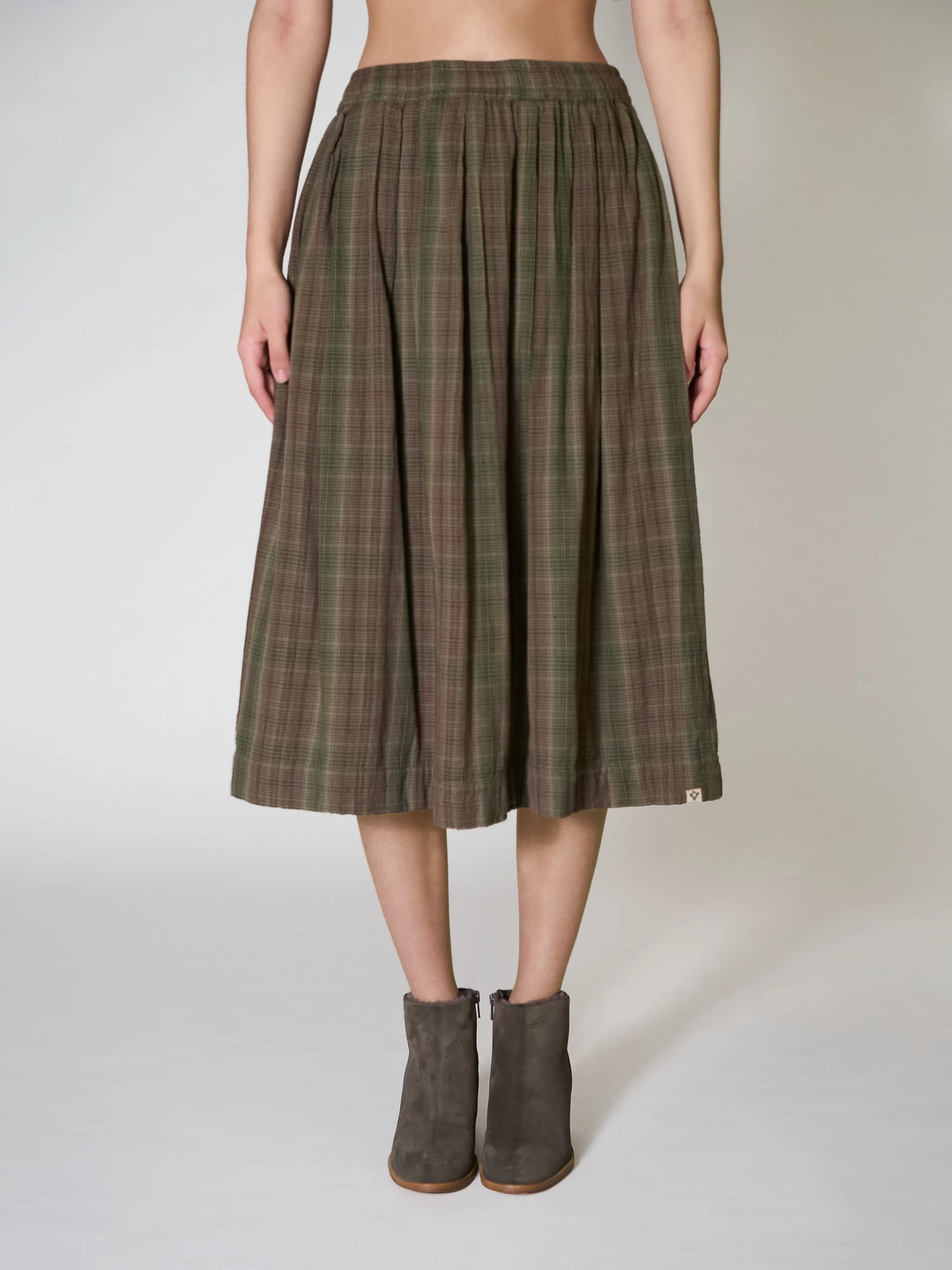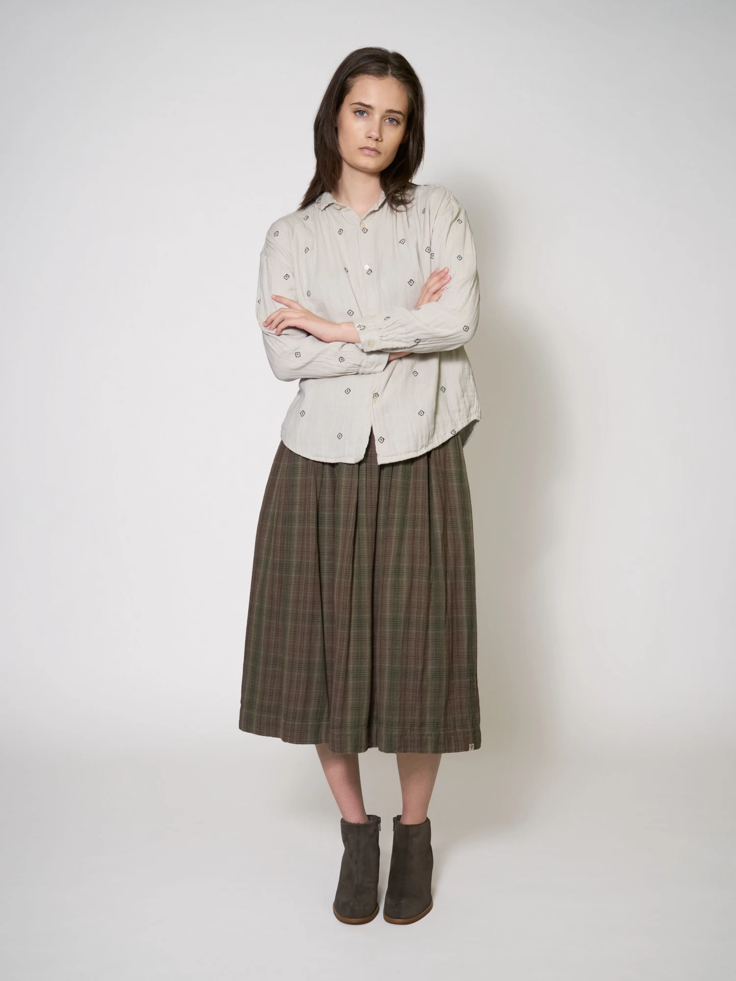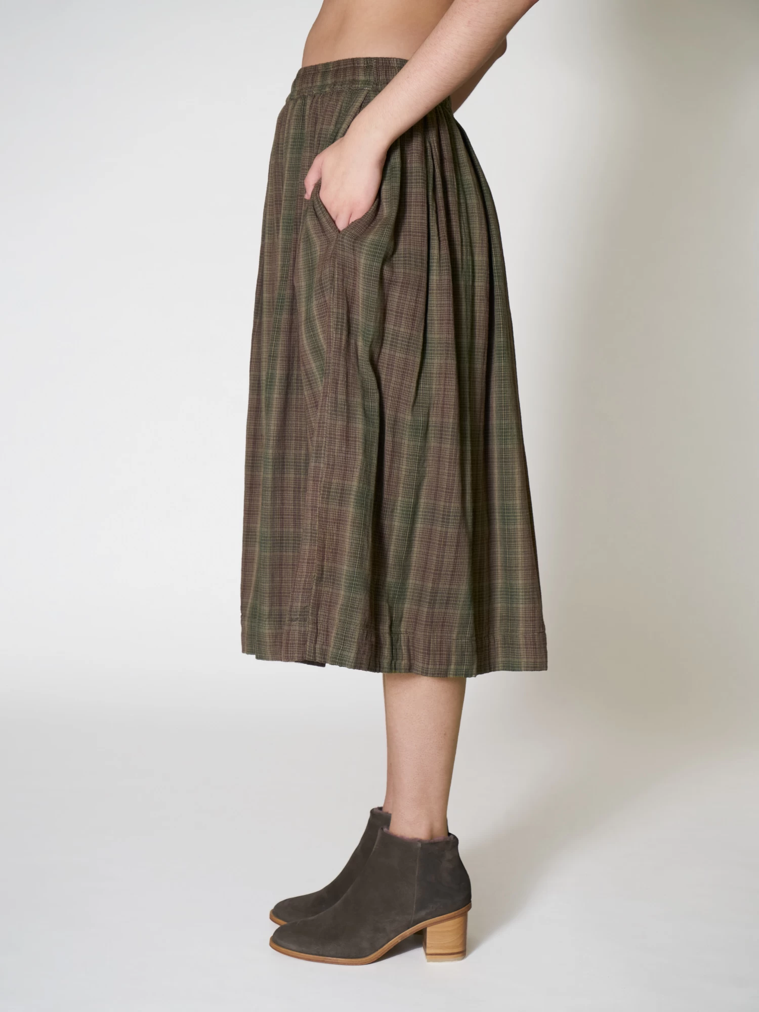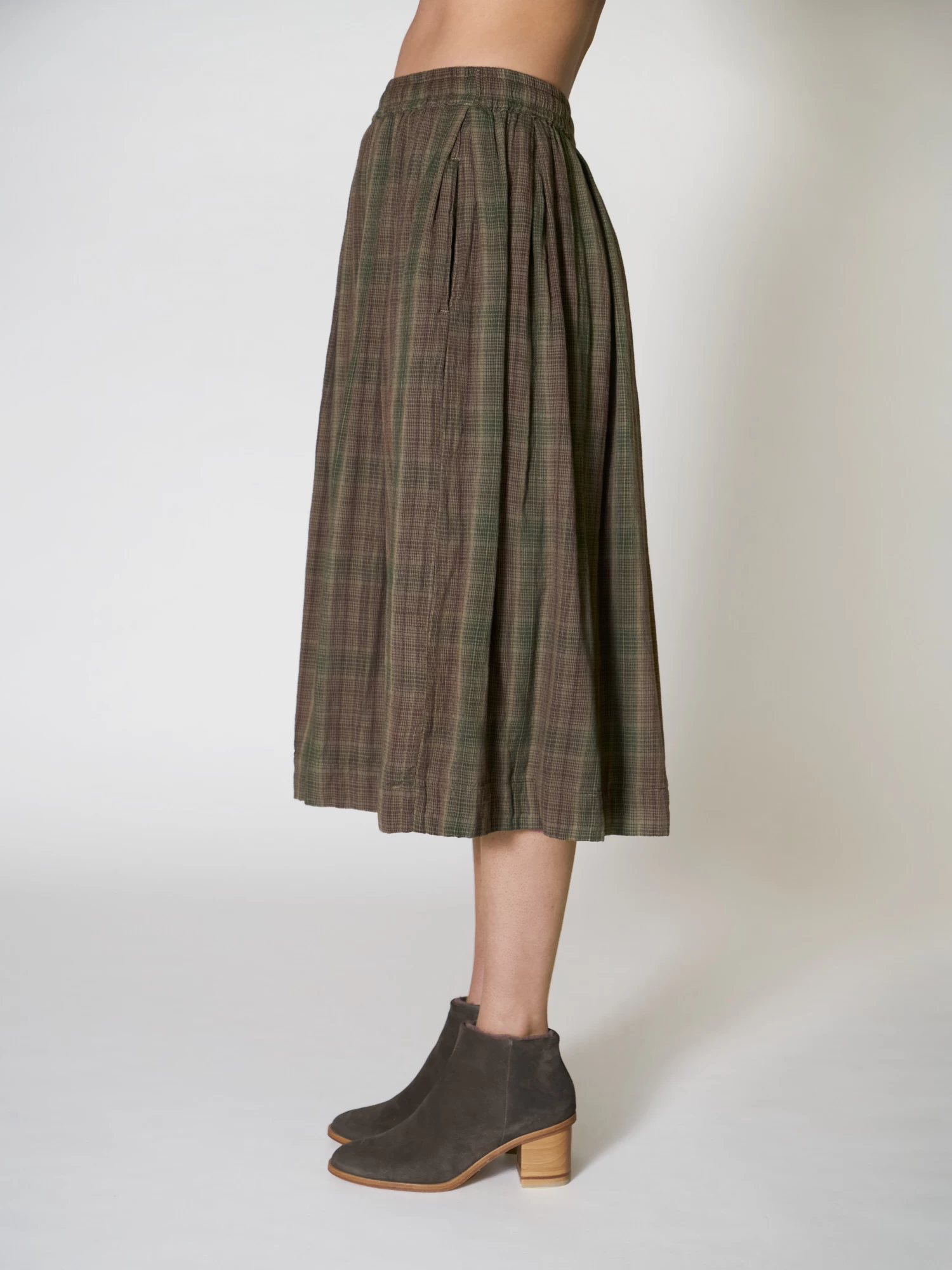 Knee-length cotton skirt with two side pockets and pleats at elasticized waistband with hidden inner drawstring.