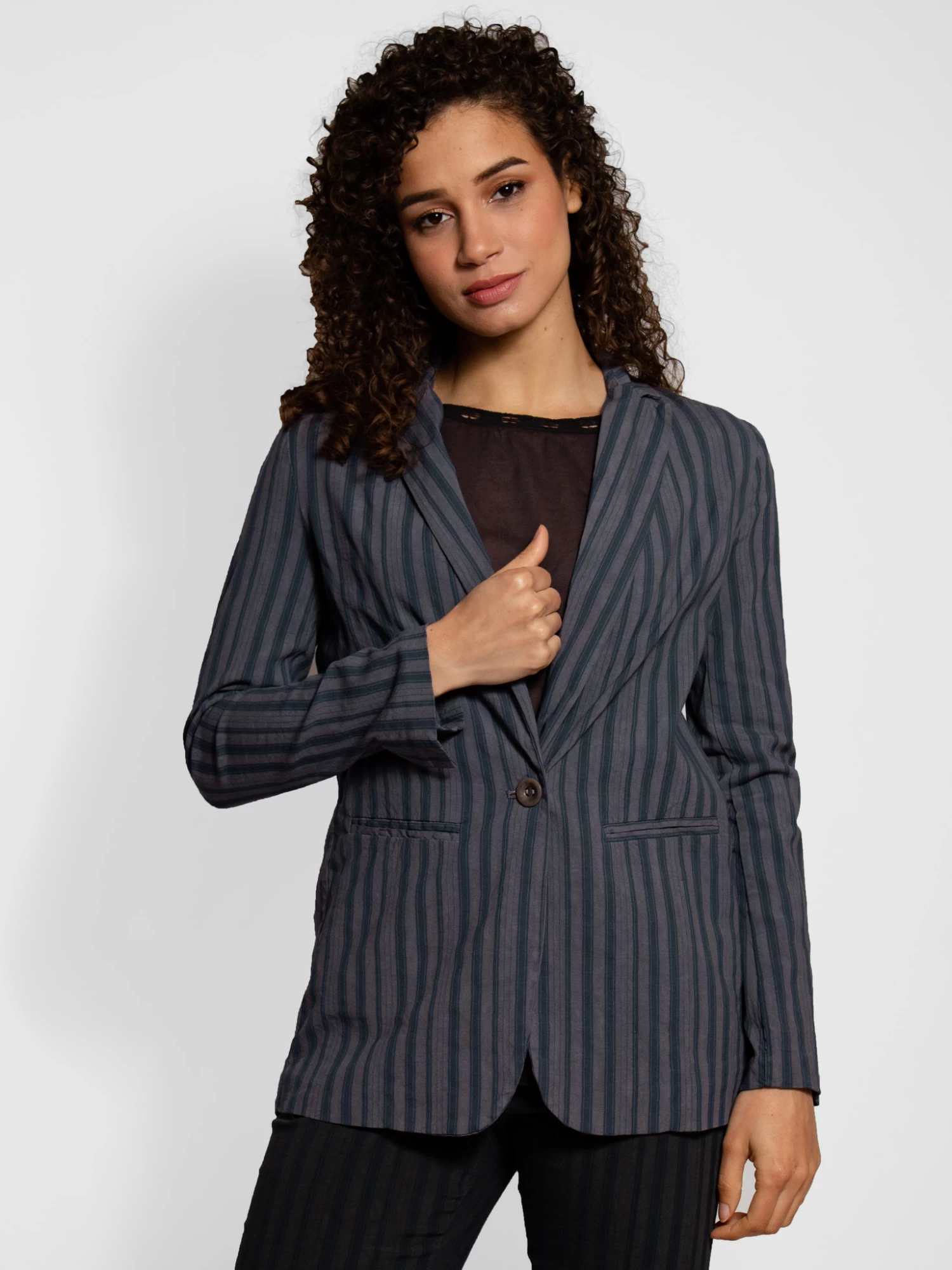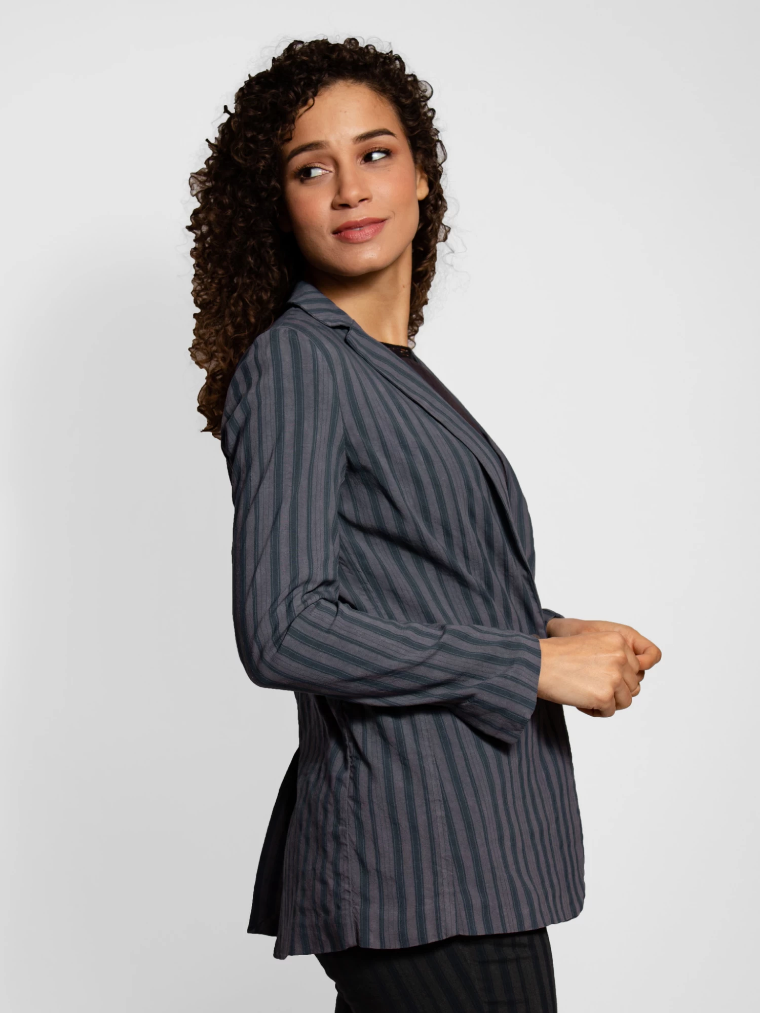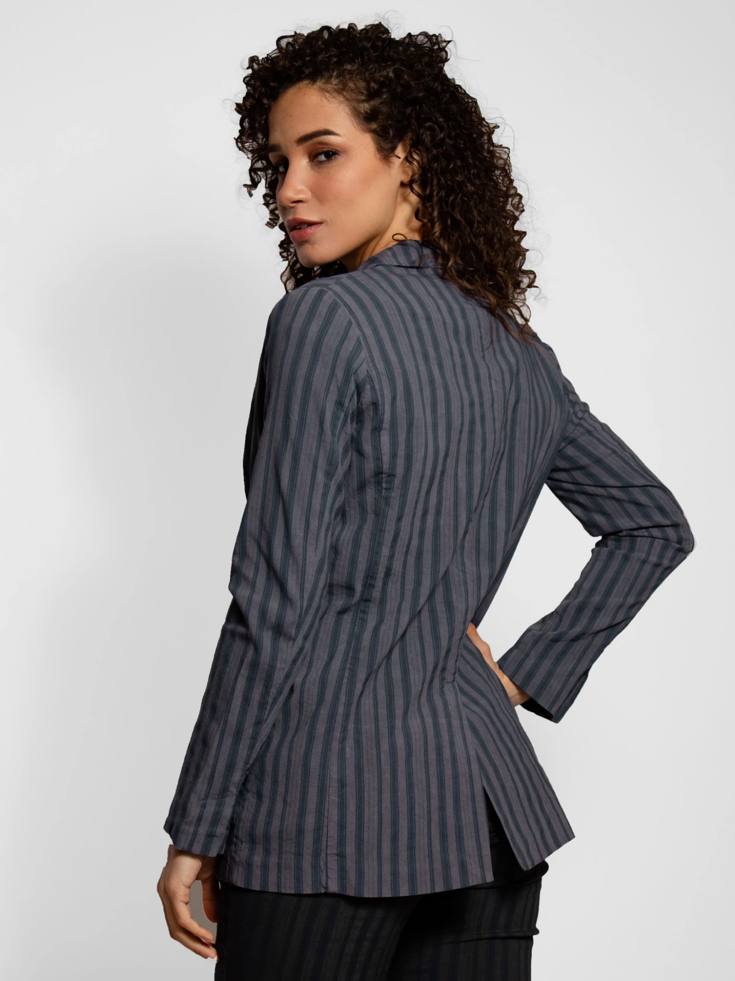 A collared front button closure stripe jacket with two front hidden pockets in grey.