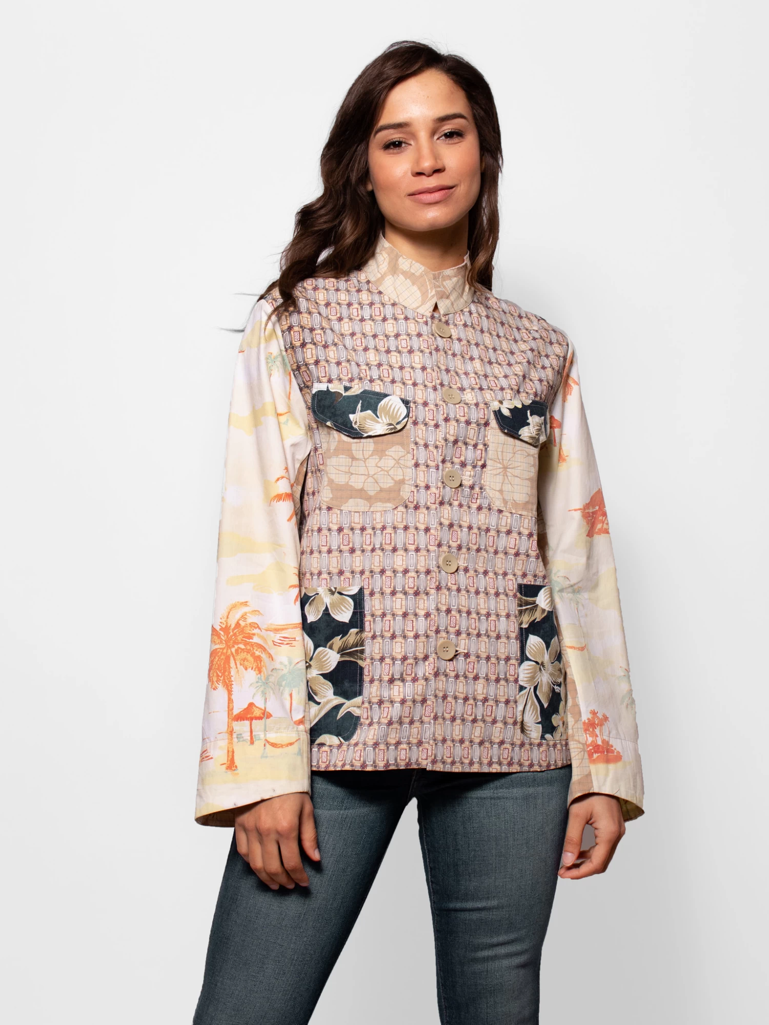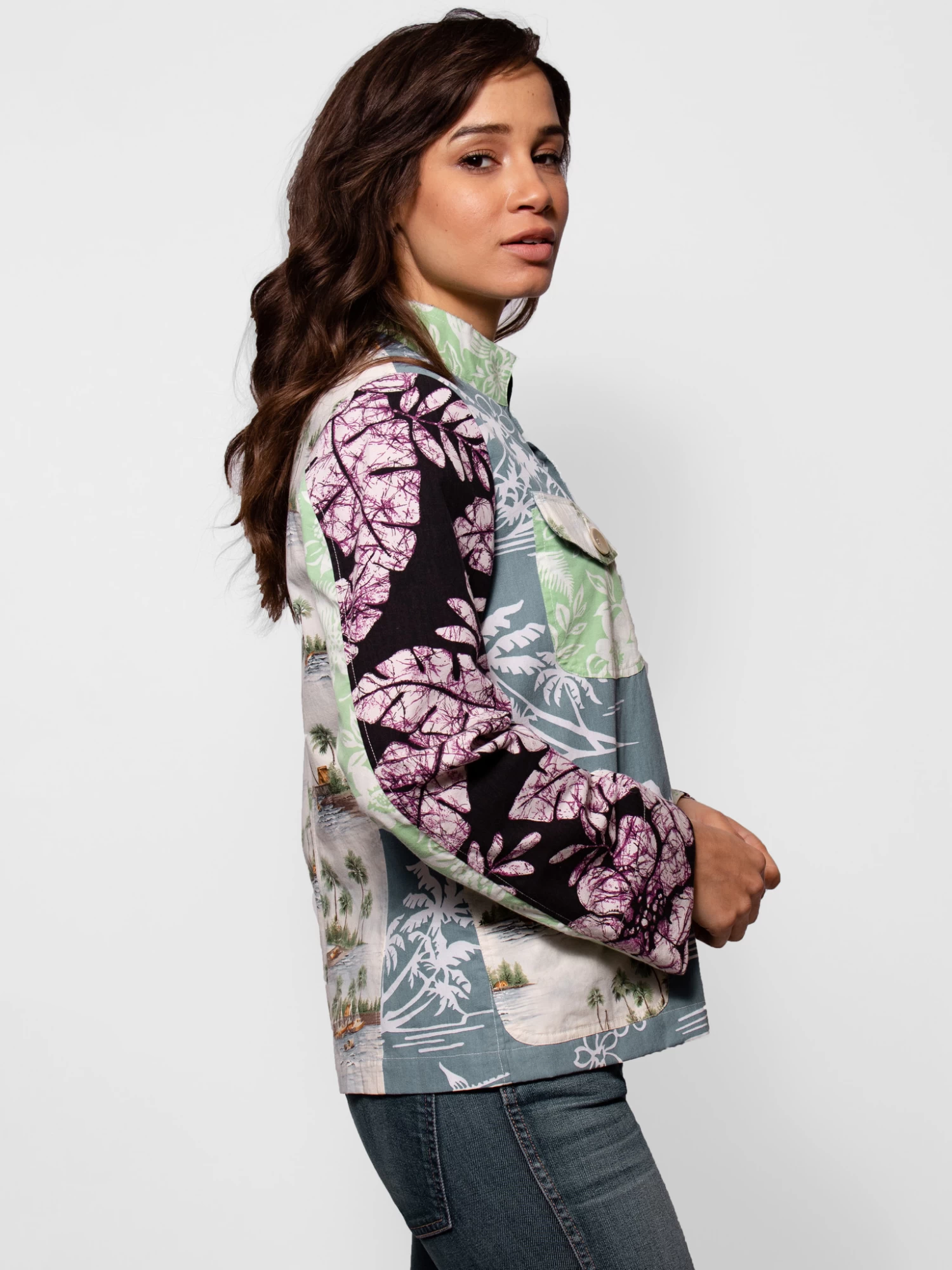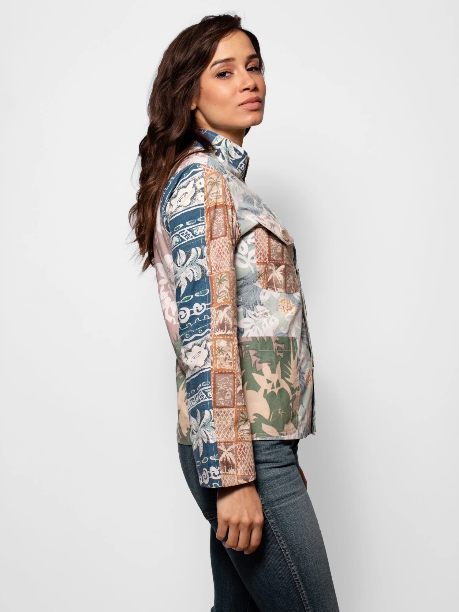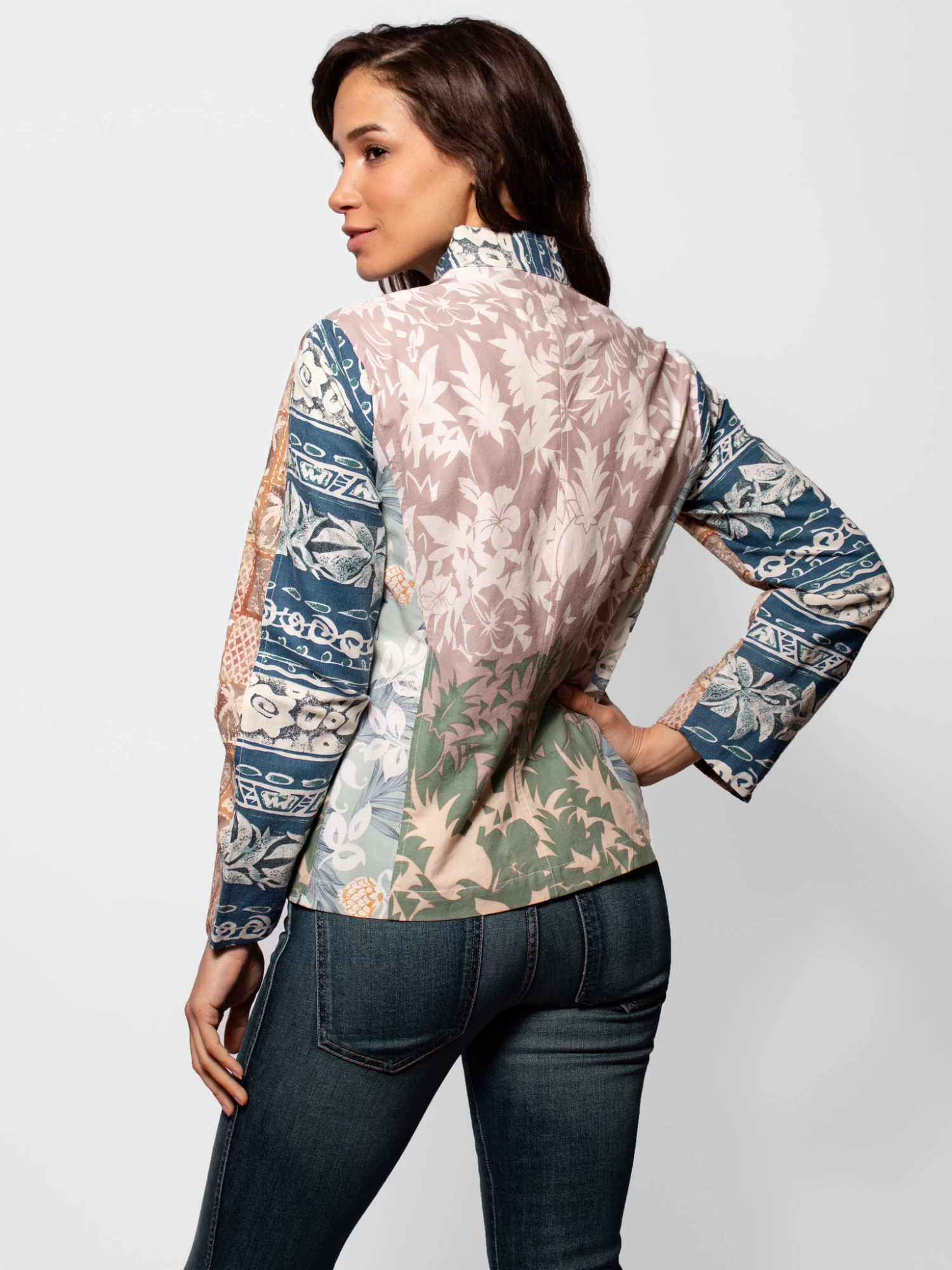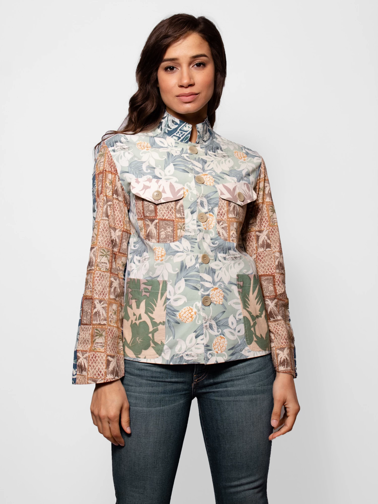 Vintage cotton Gilligan top / jacket multi color Hawaiian prints.