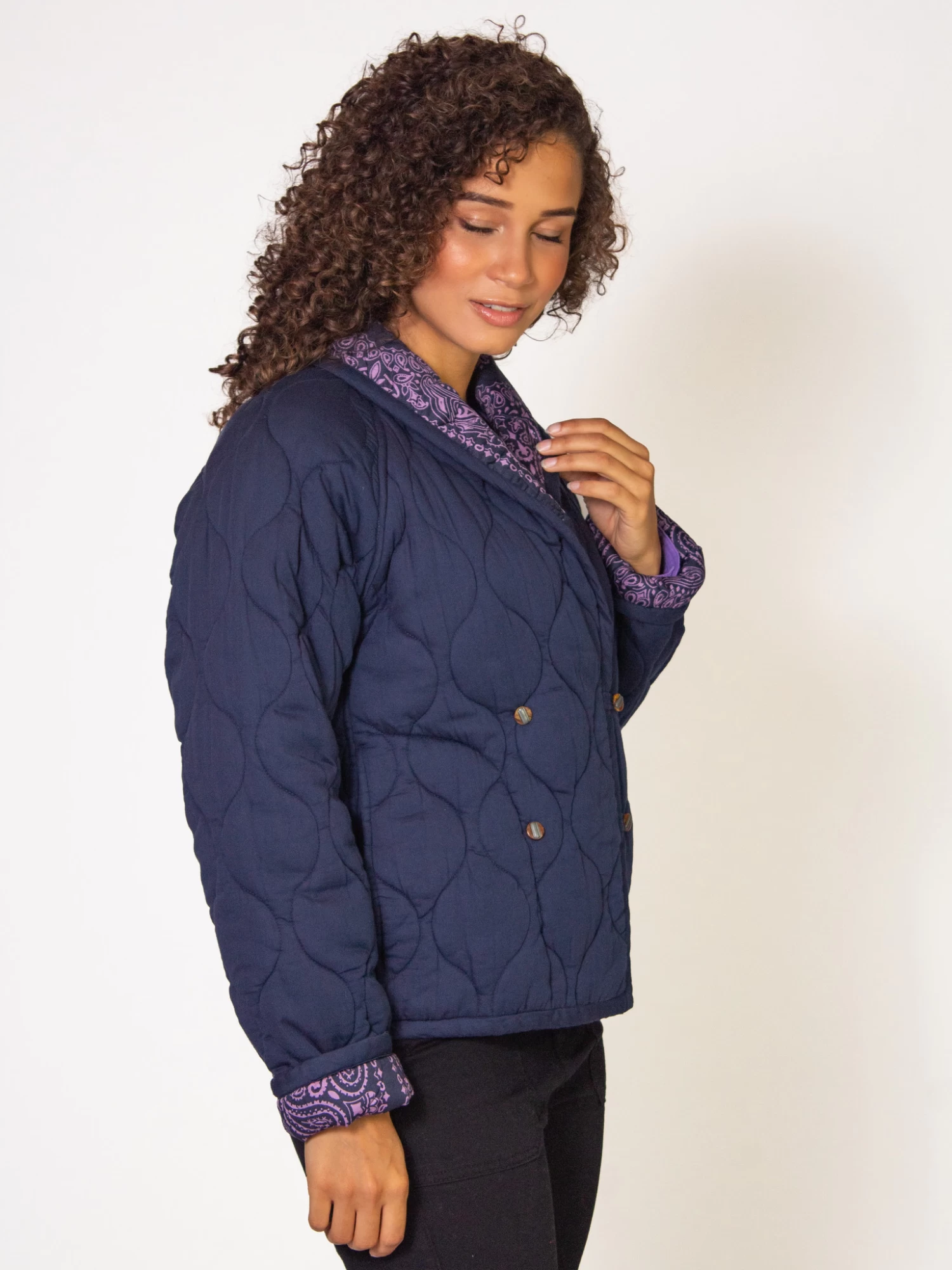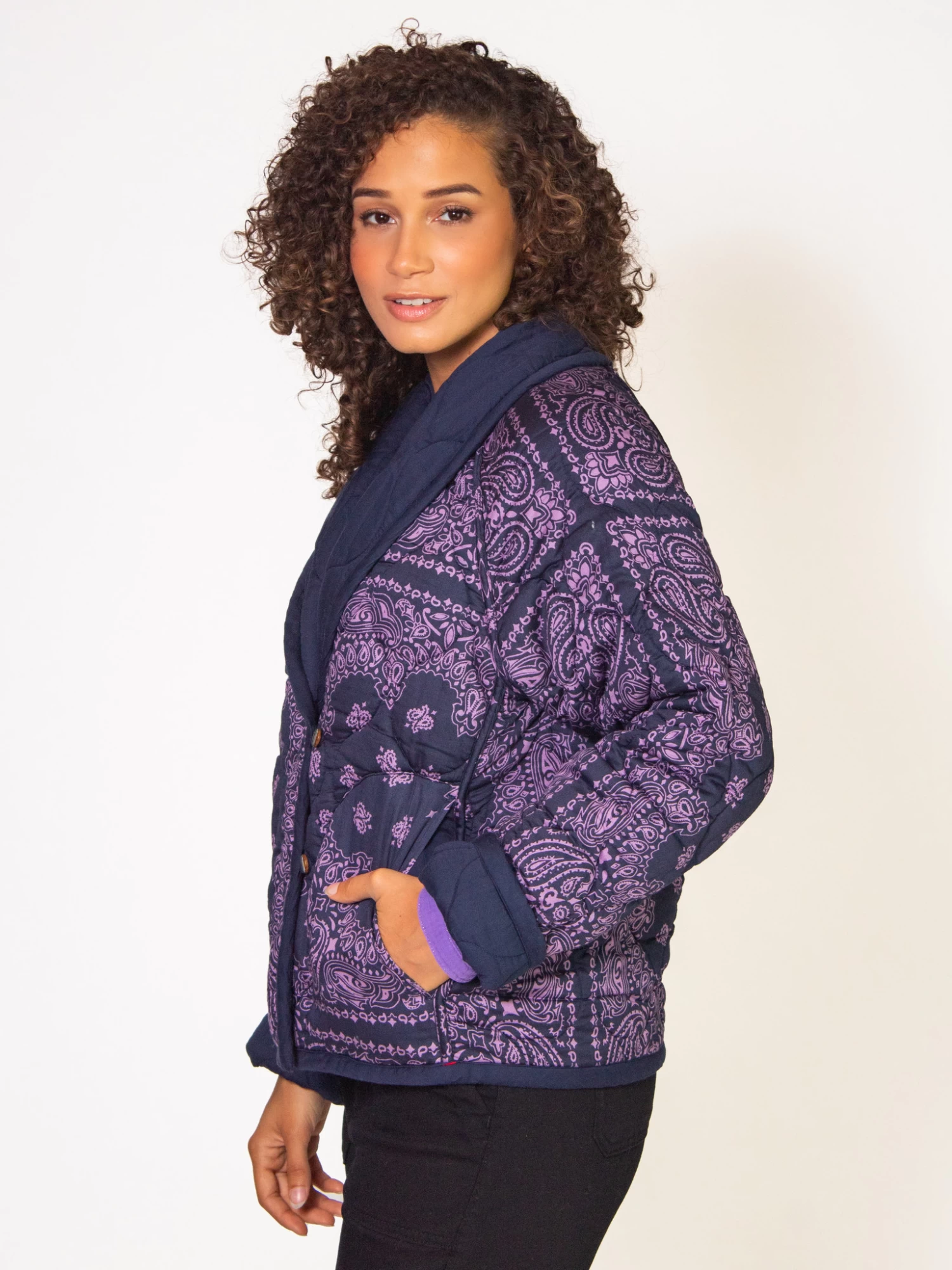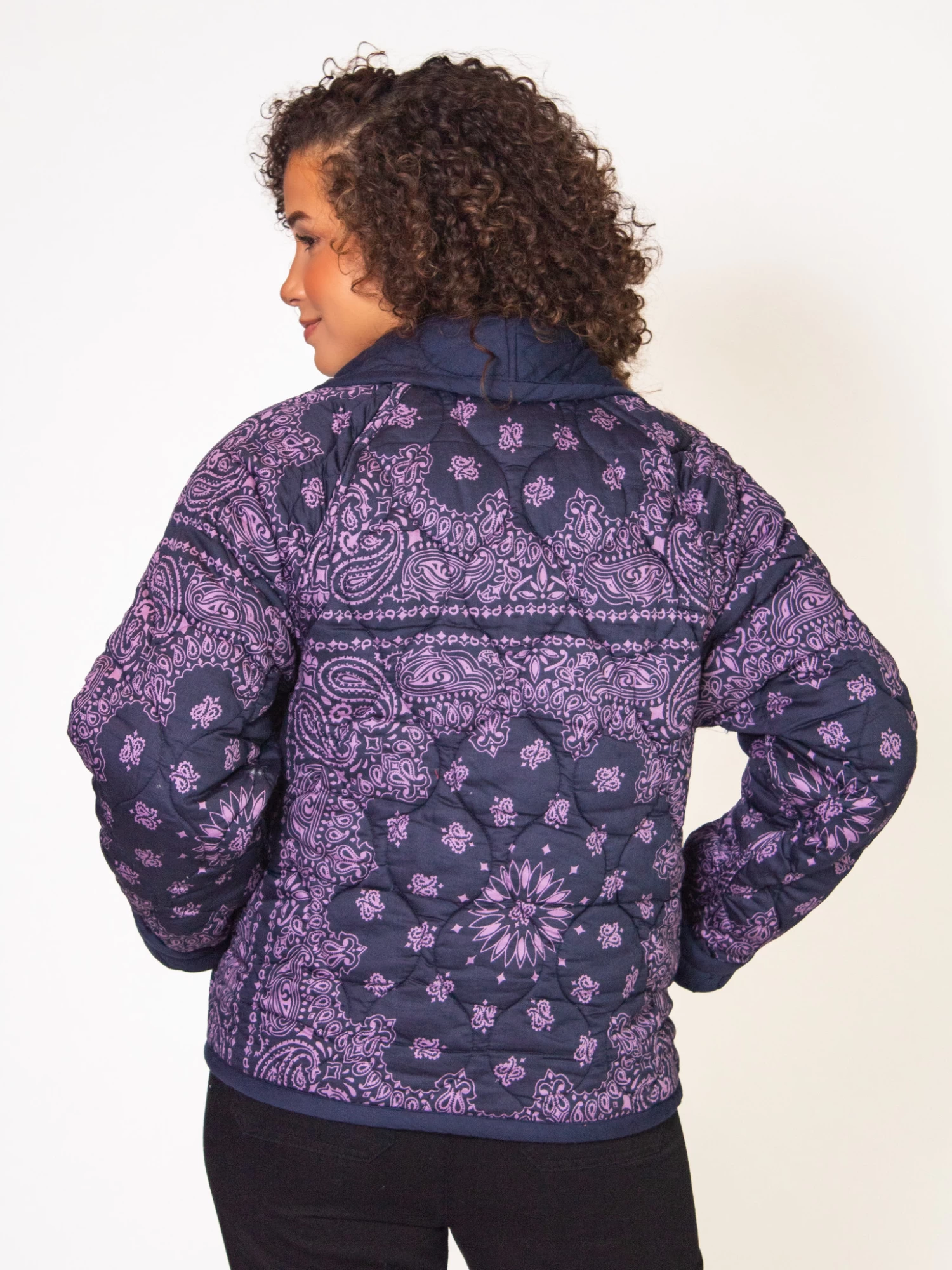 Cozy Harlowe Jacket cut in Wyatt Quilt and quilted with a reversible bandana print,