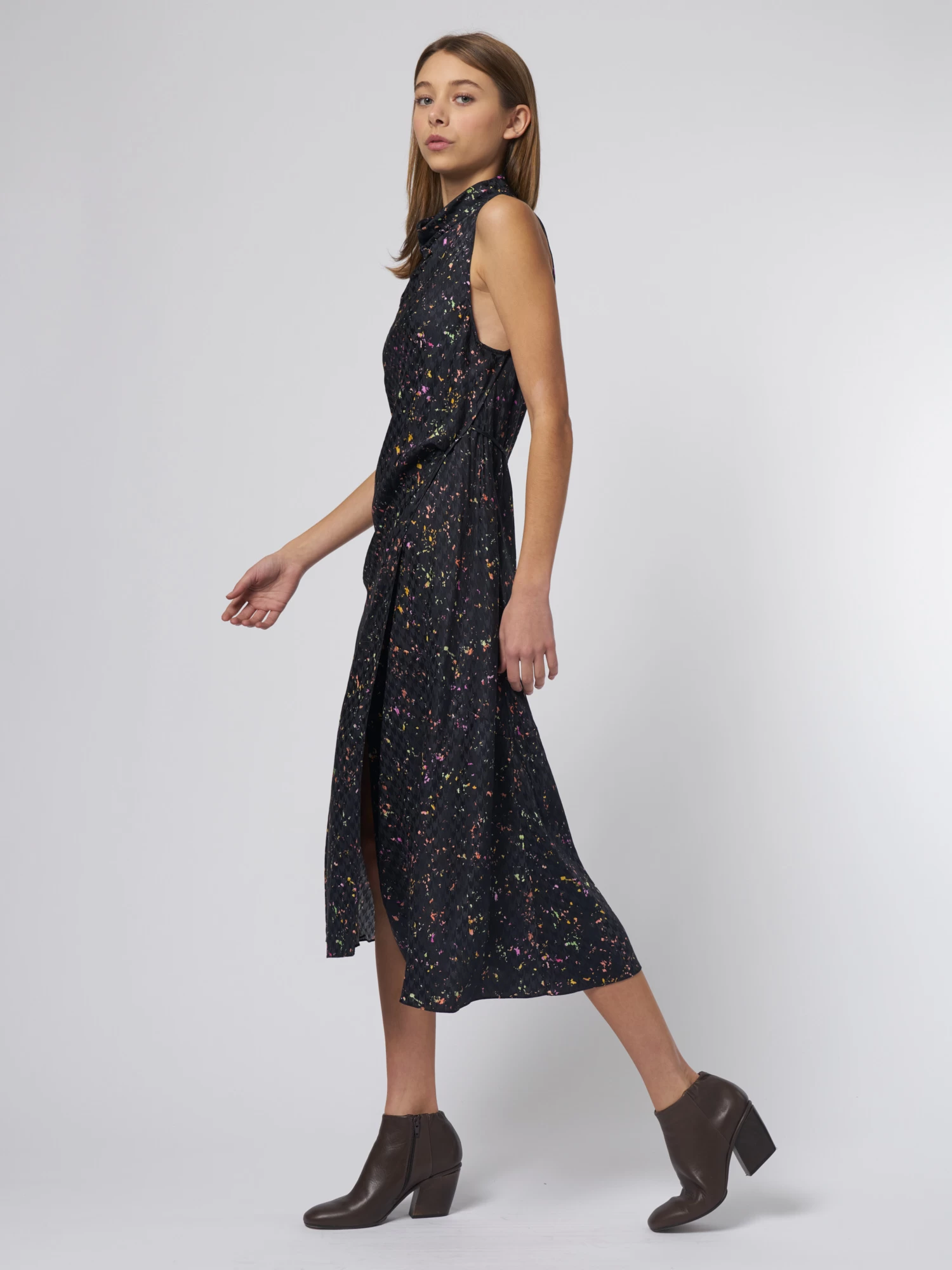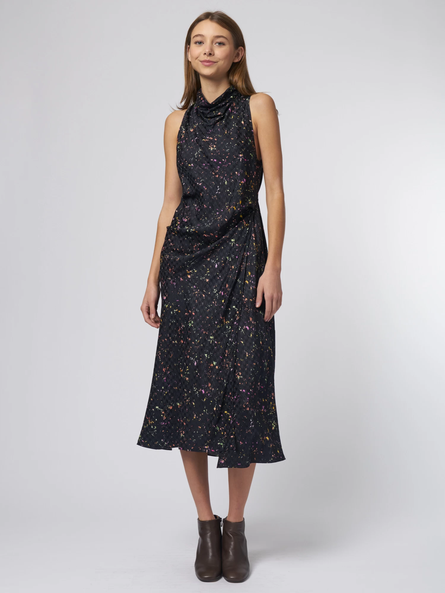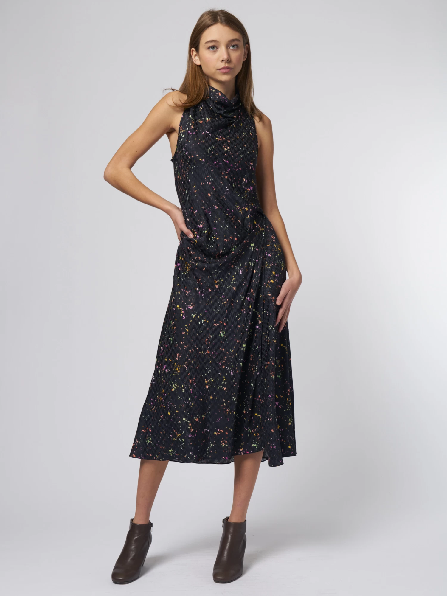 Infinity print sleeveless wrap dress fluidly skims the body in a bias cut with a high cowl neck.