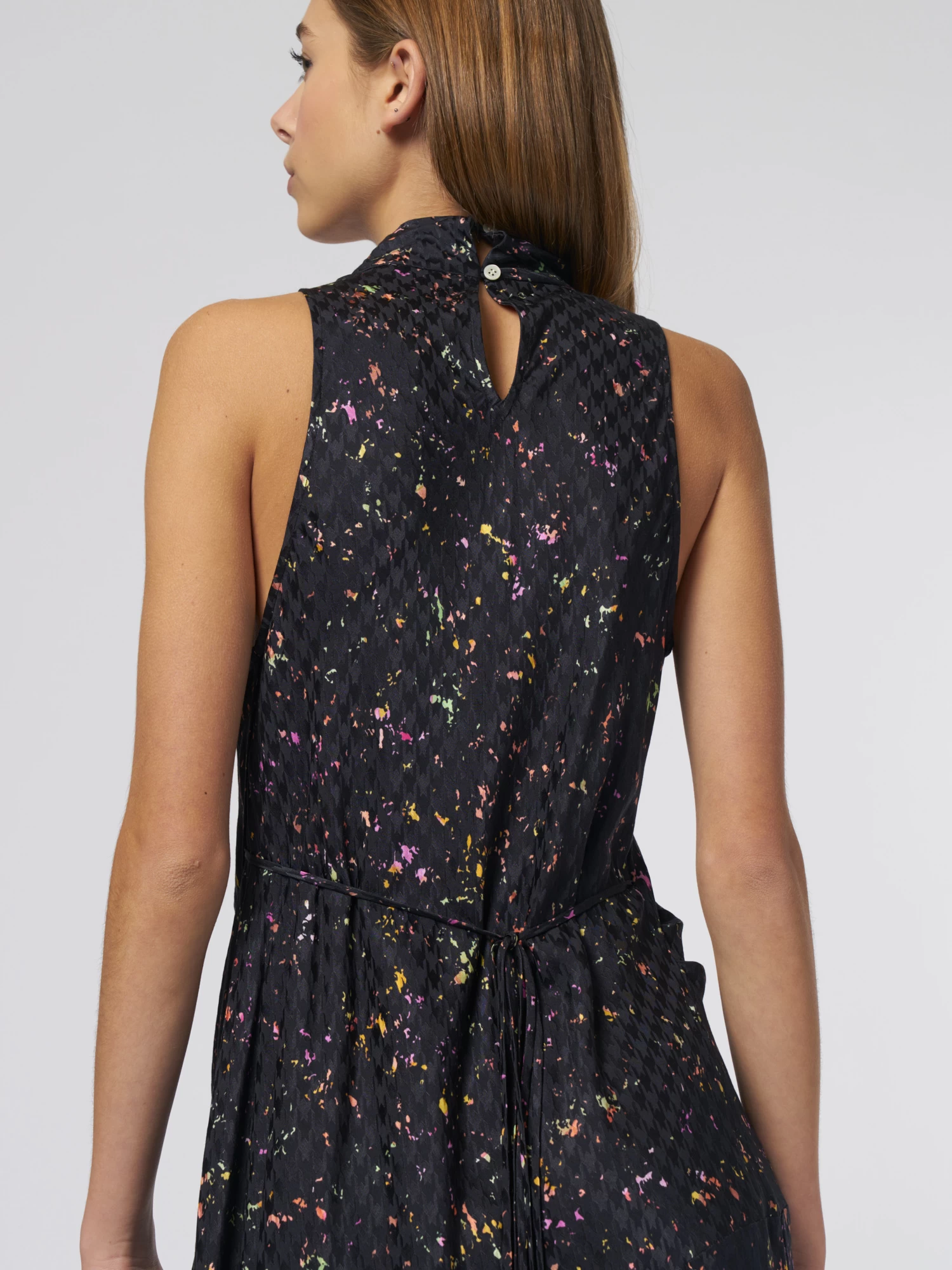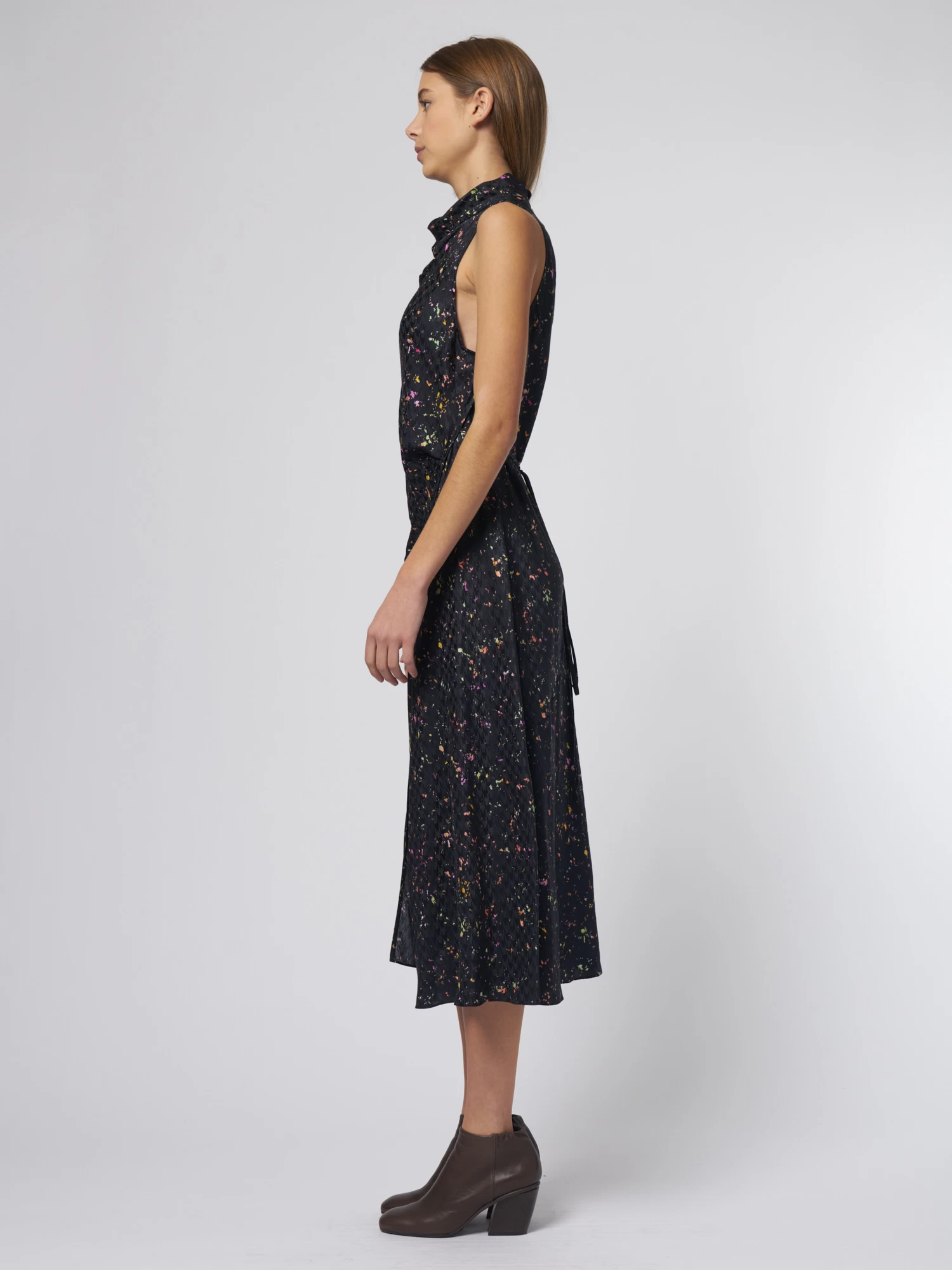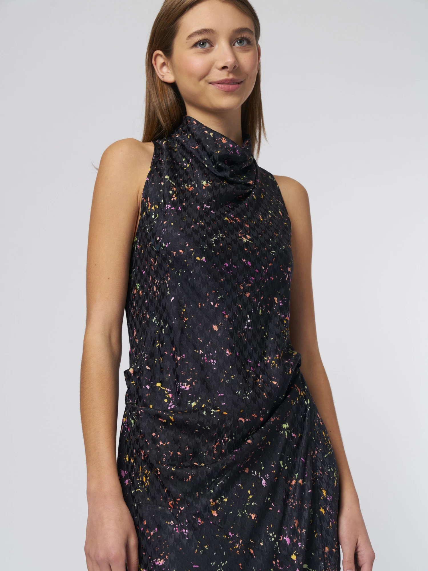 Infinity print sleeveless wrap dress fluidly skims the body in a bias cut with a high cowl neck.