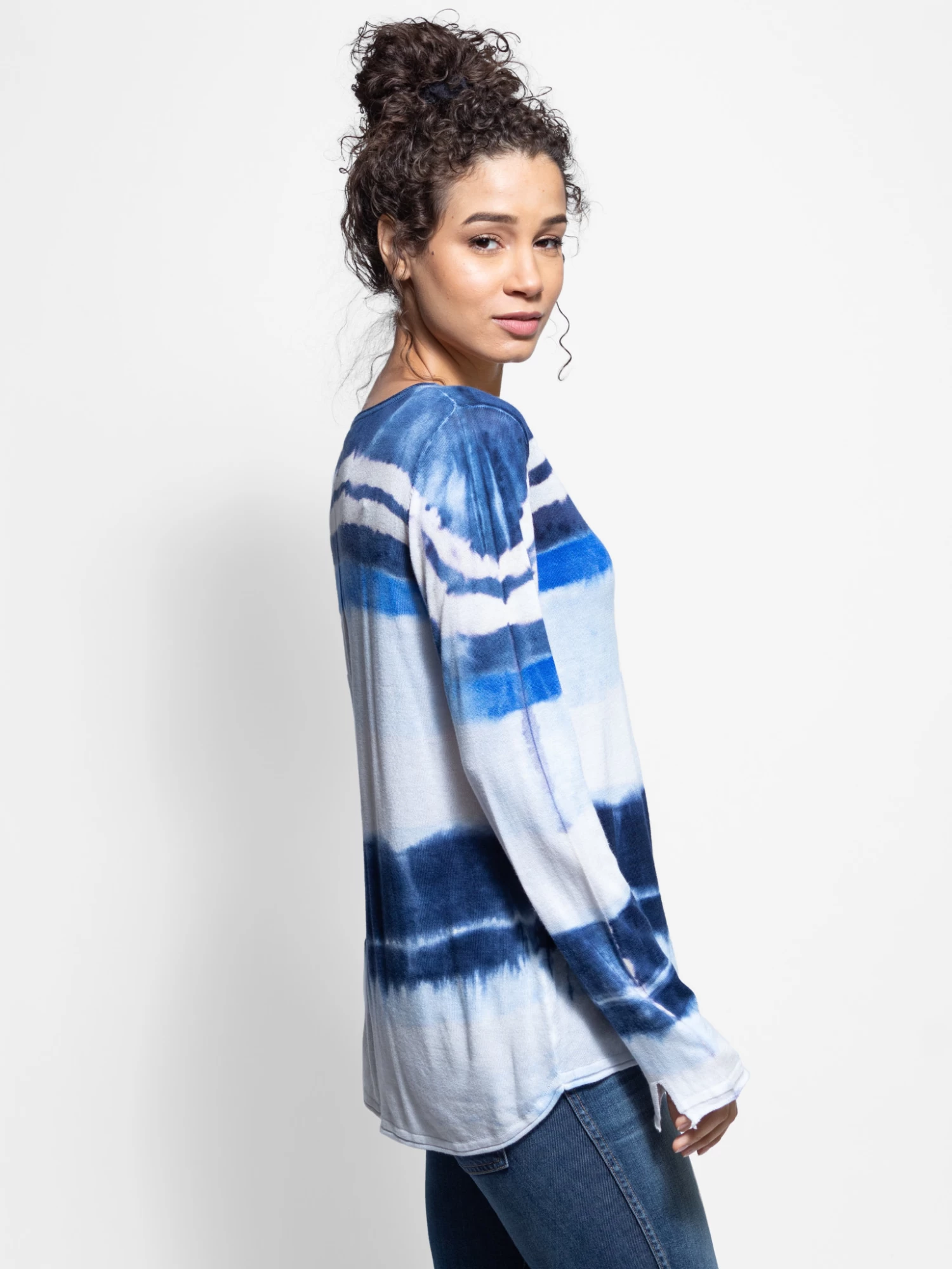 An easy fitting, long sleeve henley top with a hi-lo shirt tail bottom, straight sleeves, and a small slit at back of cuff.