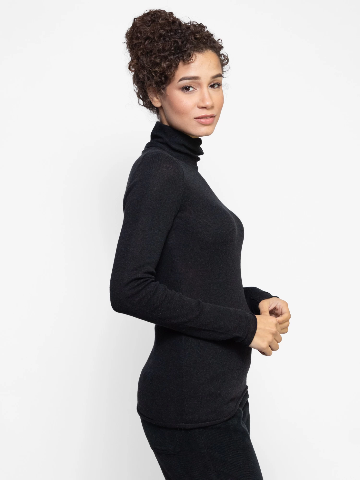 A cotton turtleneck with a slim fit, sheer neck detail, and small ribbed trims in a two tone graphite black.