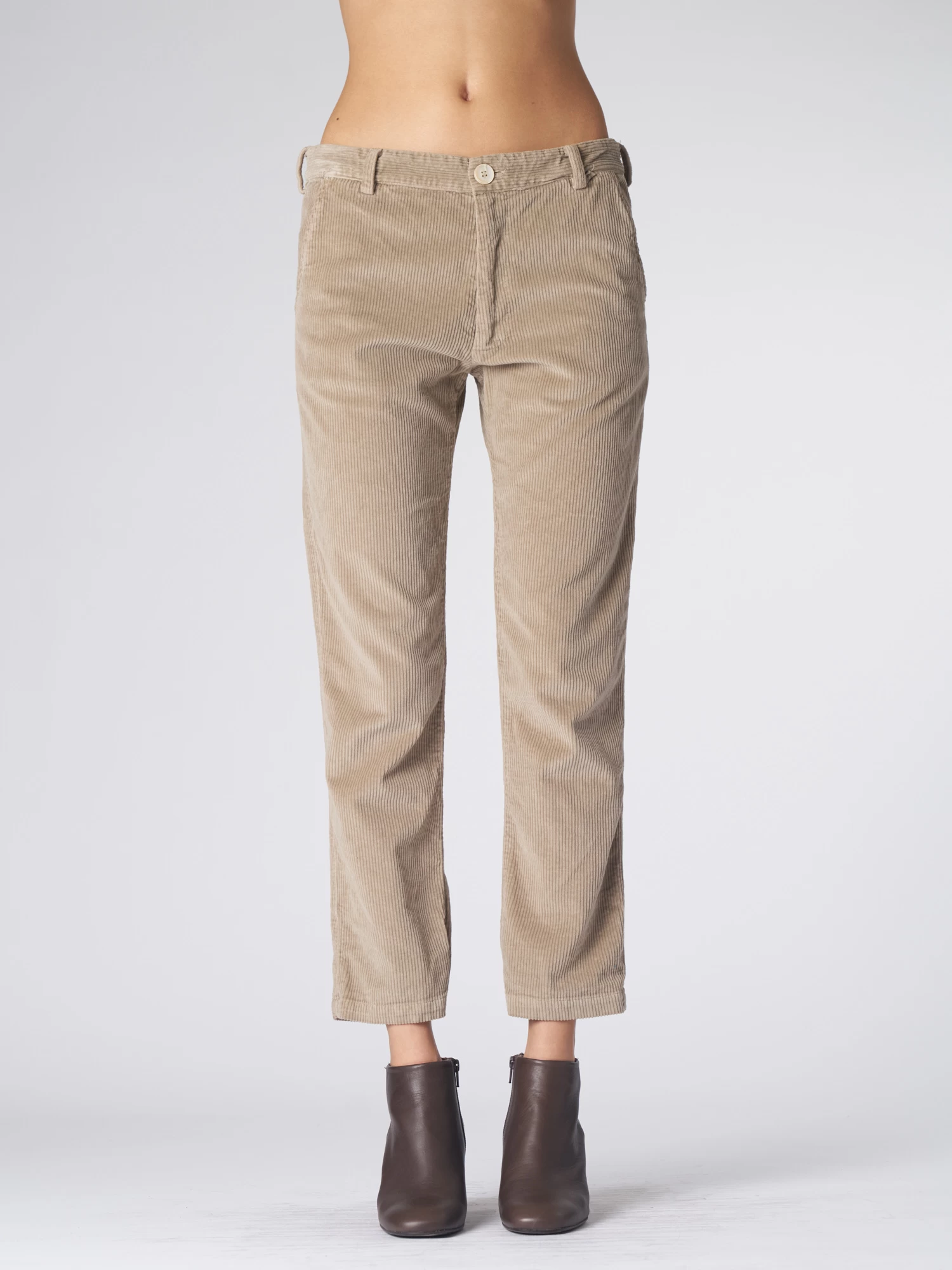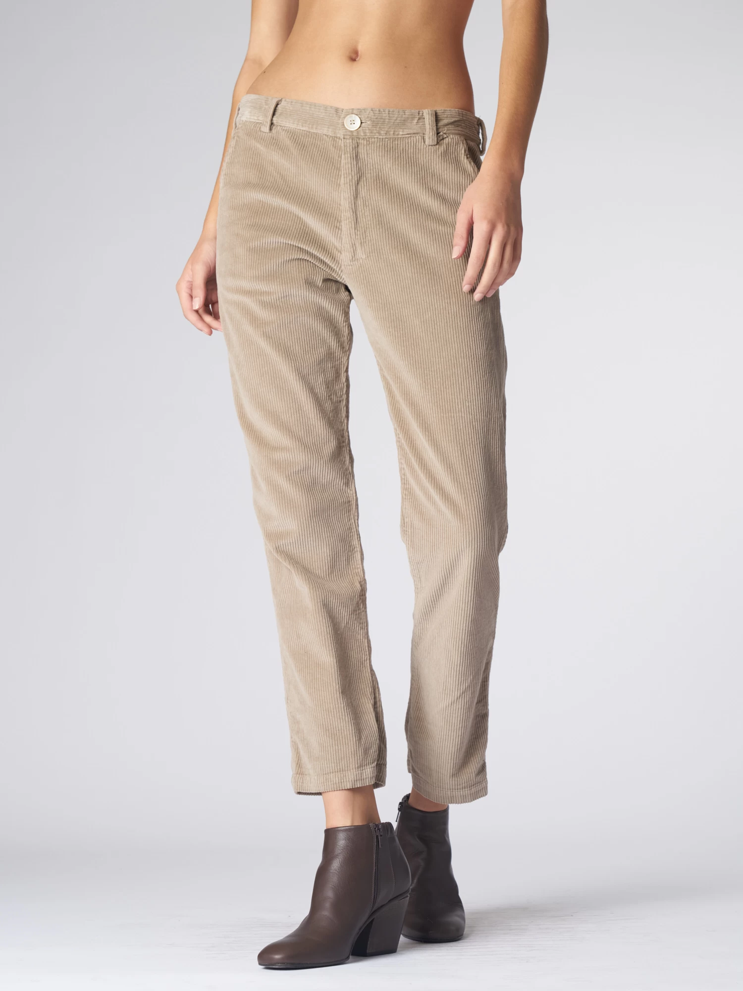 Slightly boyfriend-fit corduroy pants have two pockets in the front and two in the back.