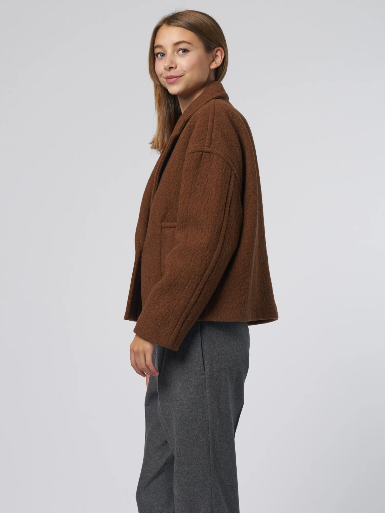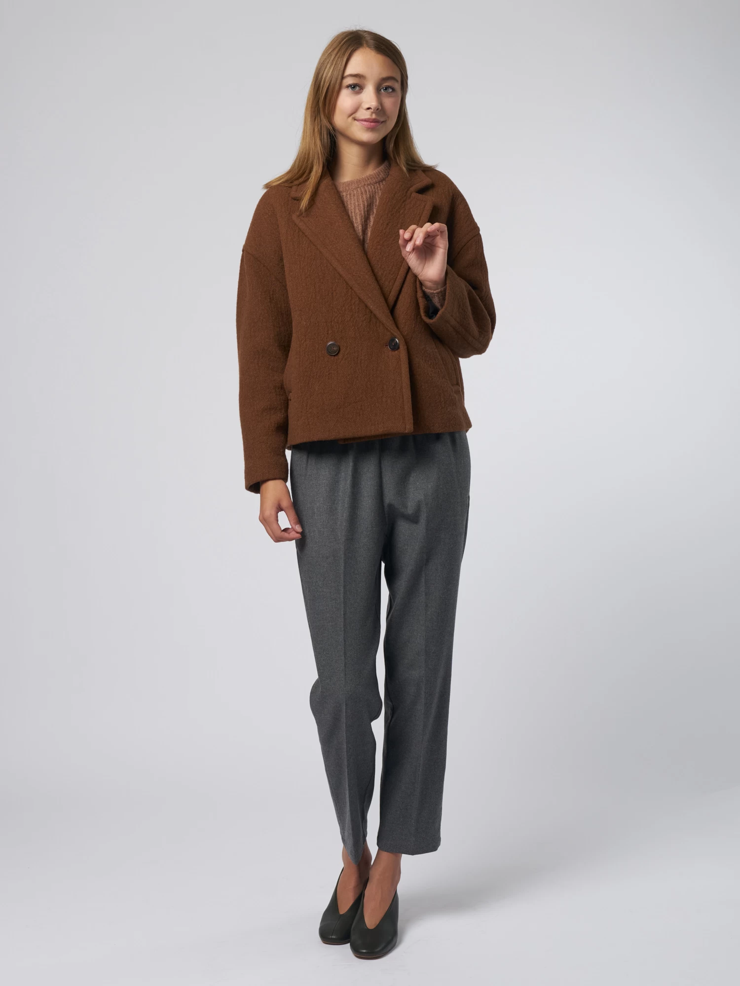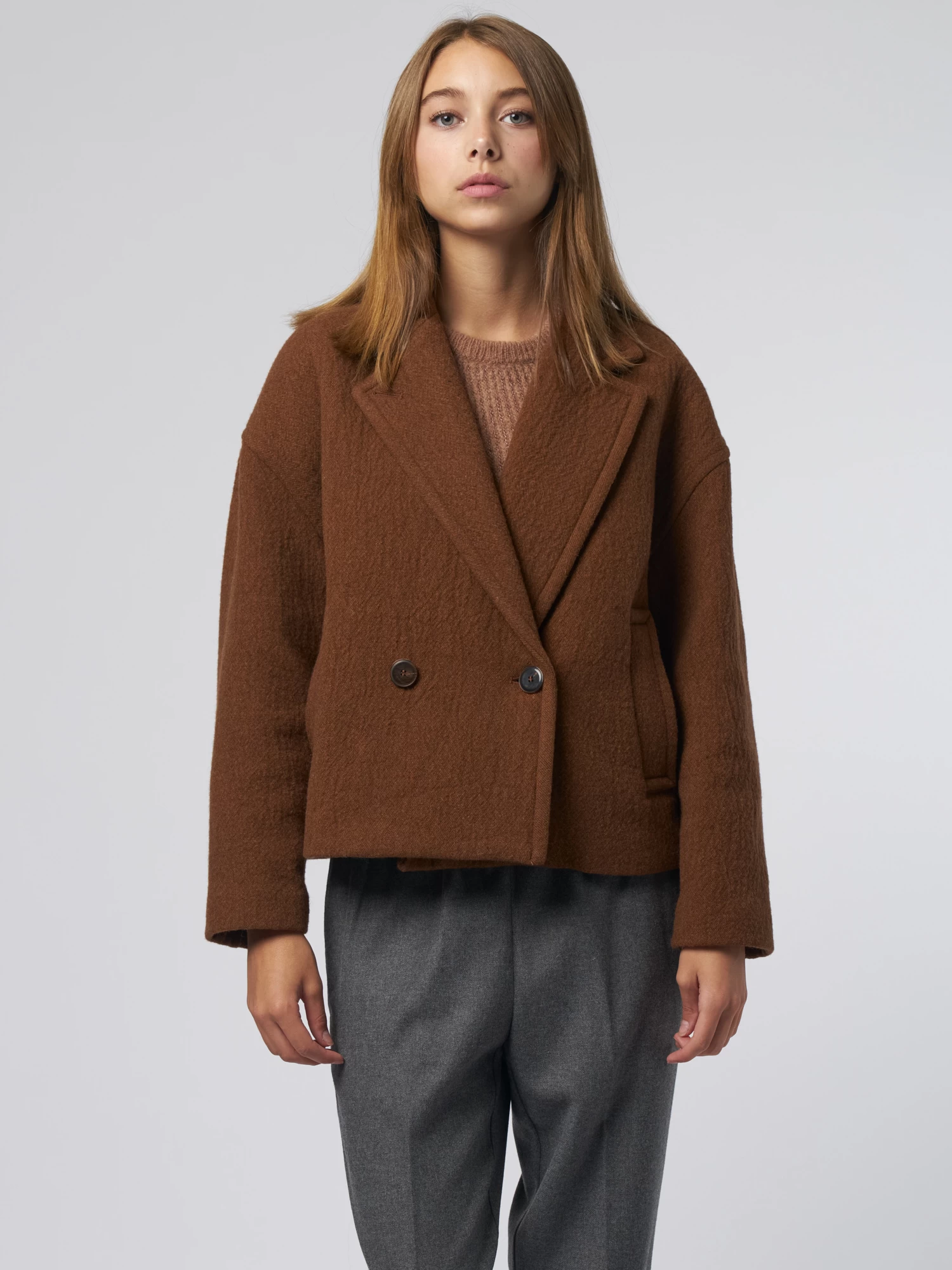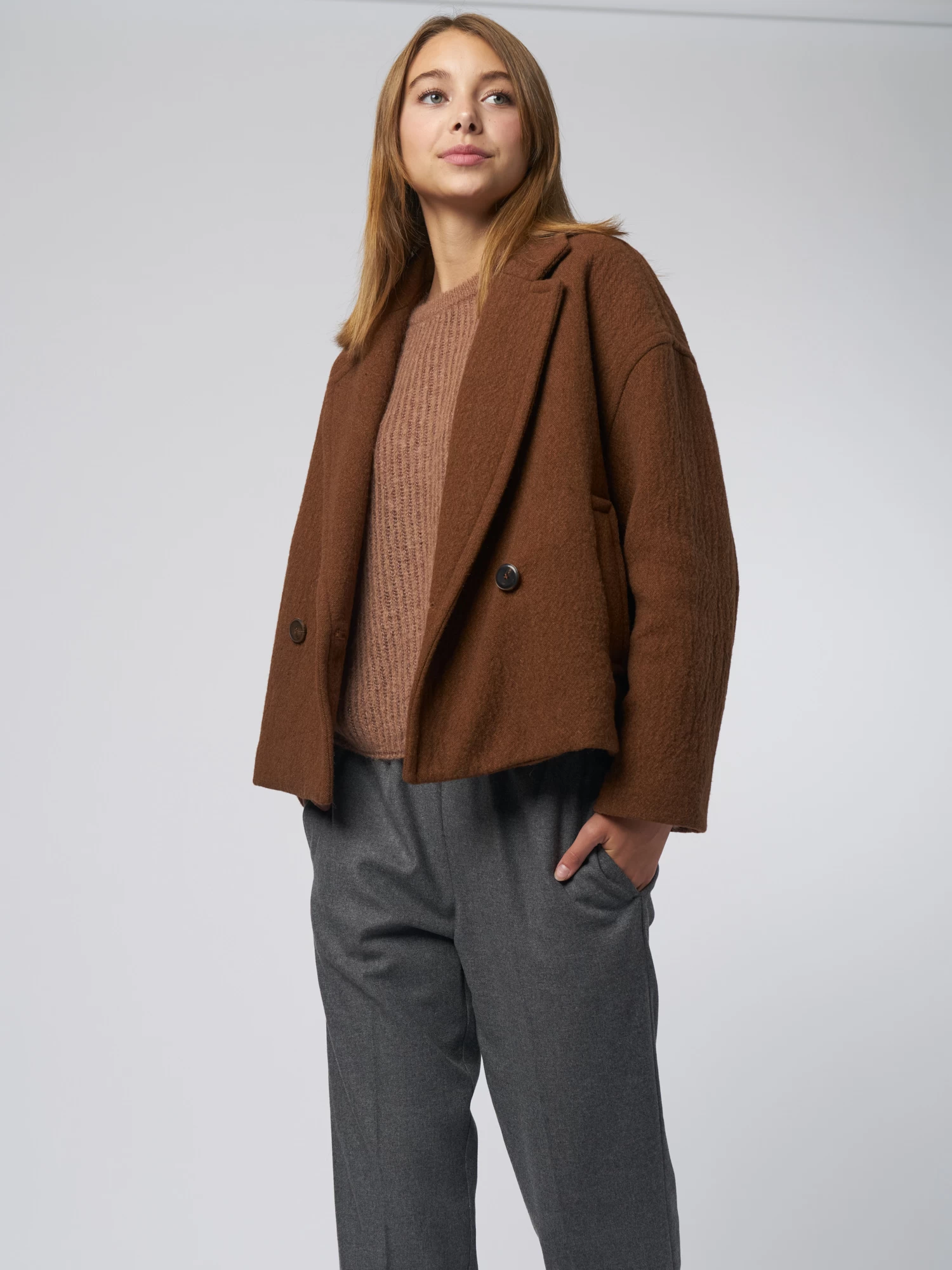 The double-breasted jacket has a collar with lapels, slightly dropped shoulders, and side pockets.