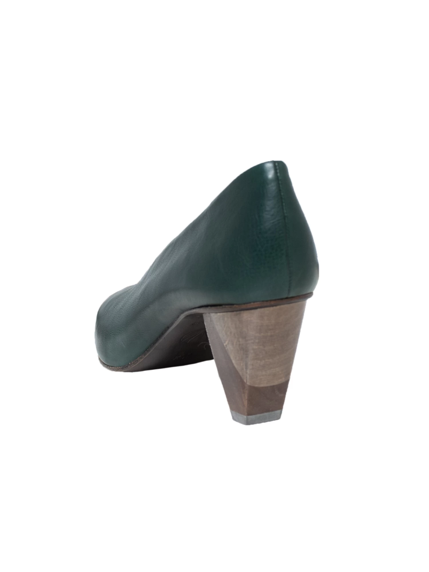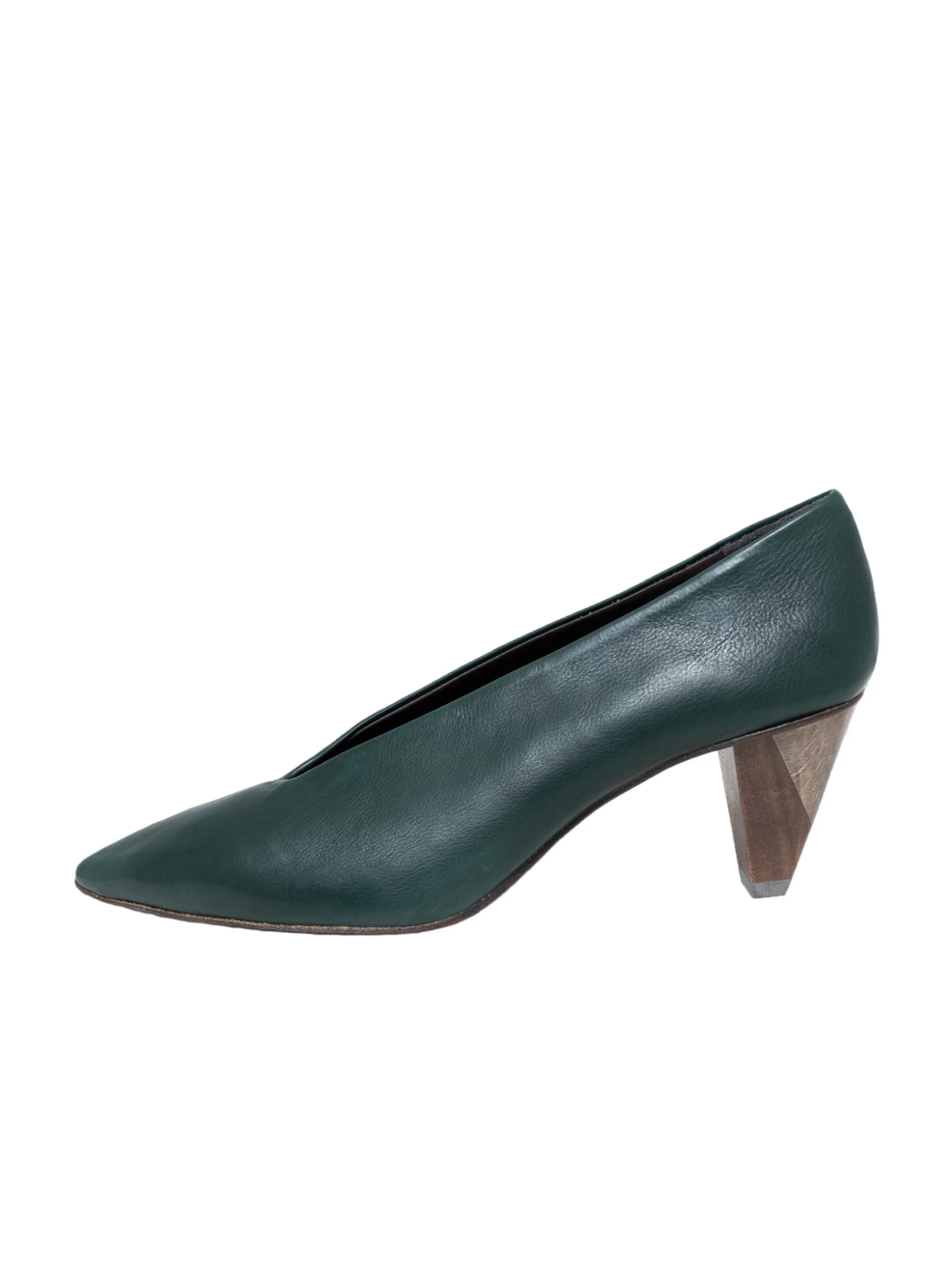 A classic pointed pump with a deep-v throat line and a color-blocked wood heel in green leather.