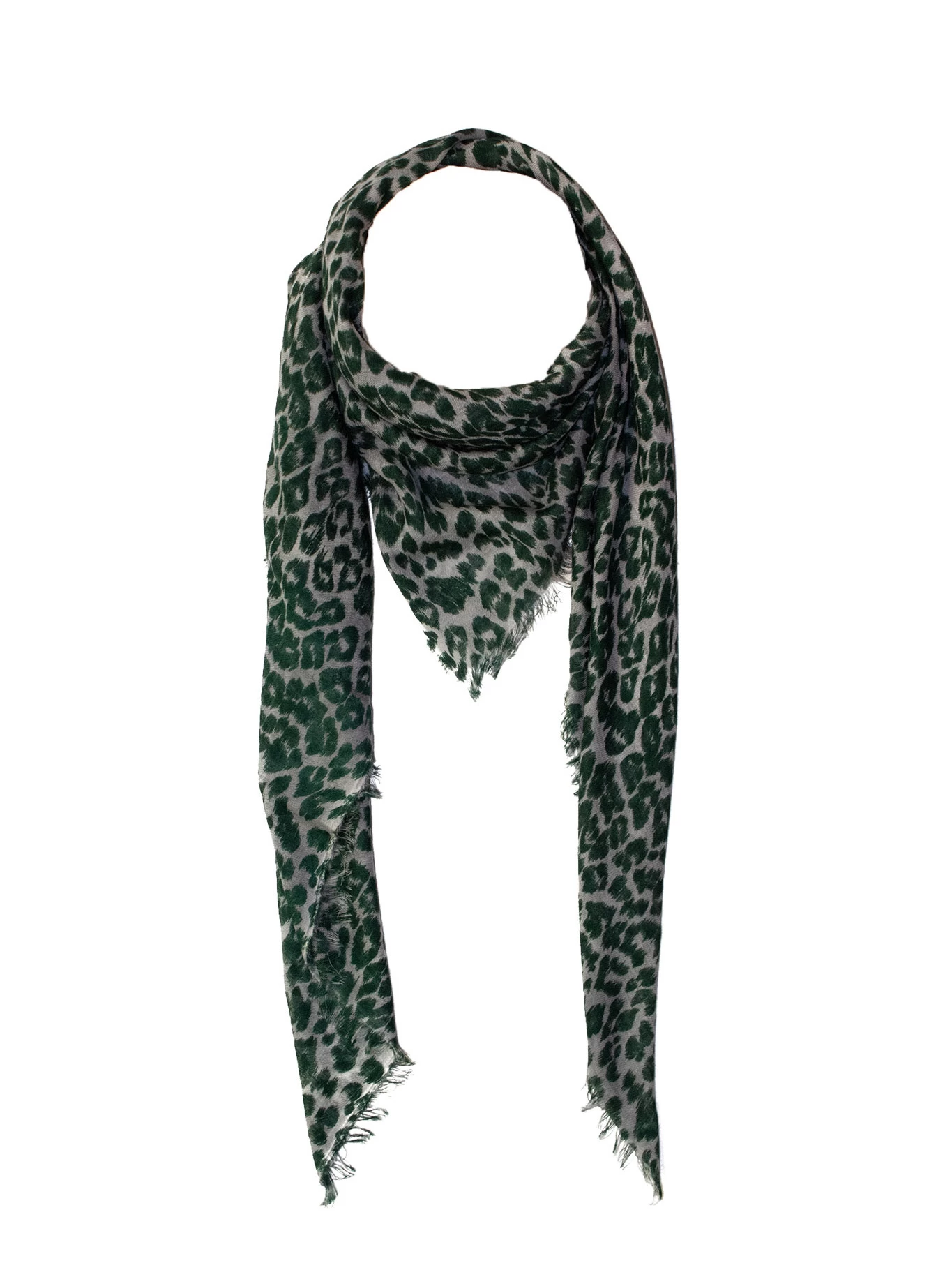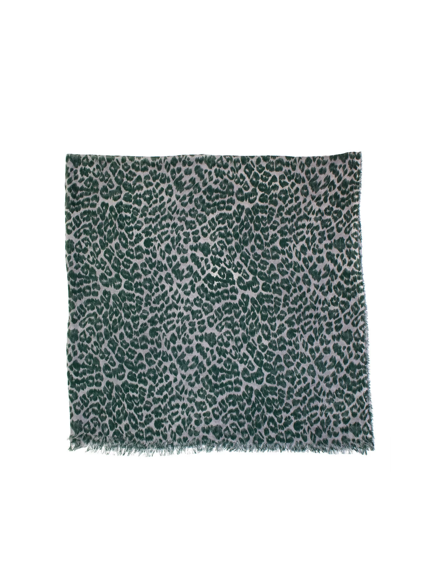 Wool, silk, and cashmere blend scarf with a leopard print and fringe edges.