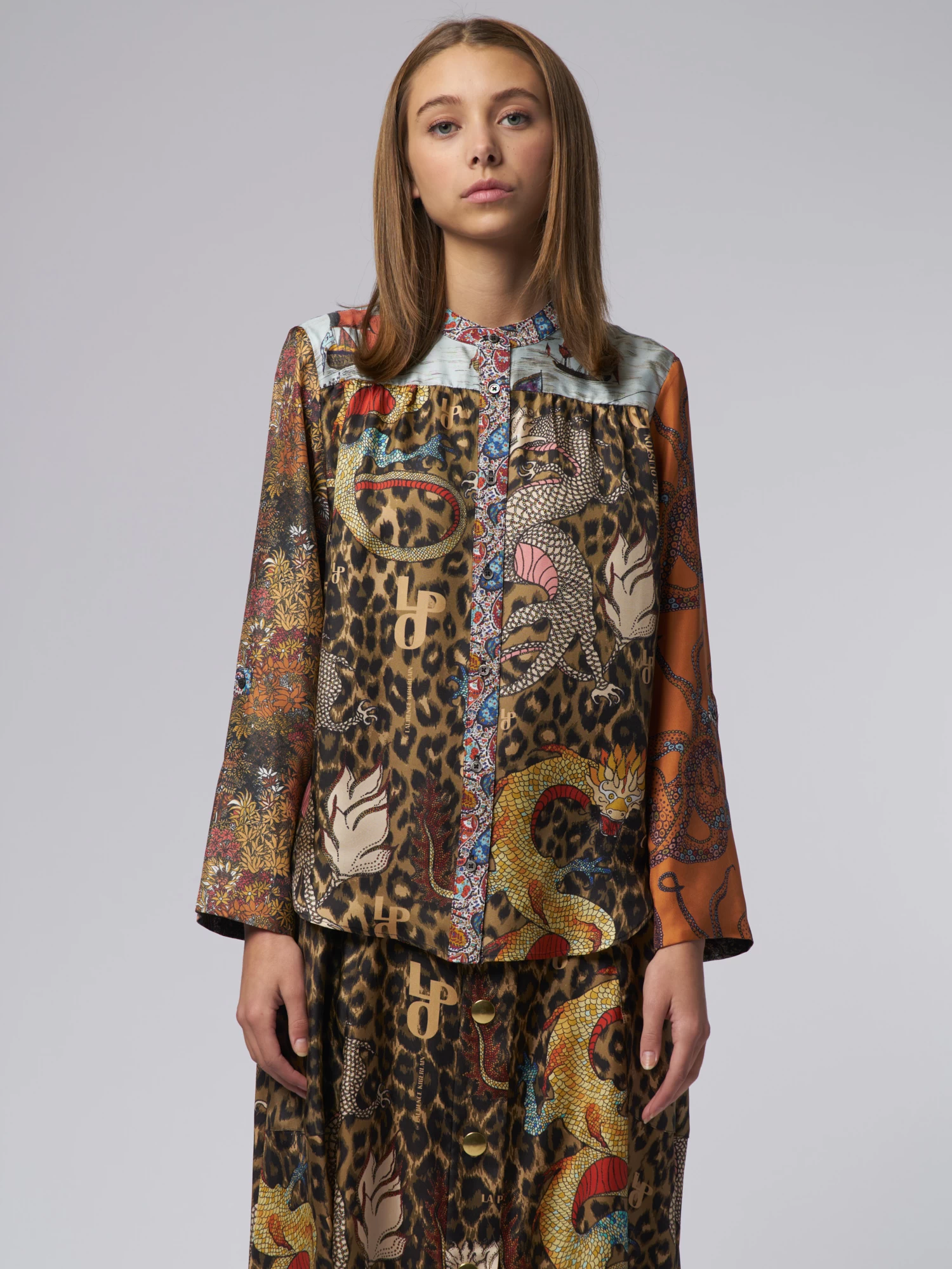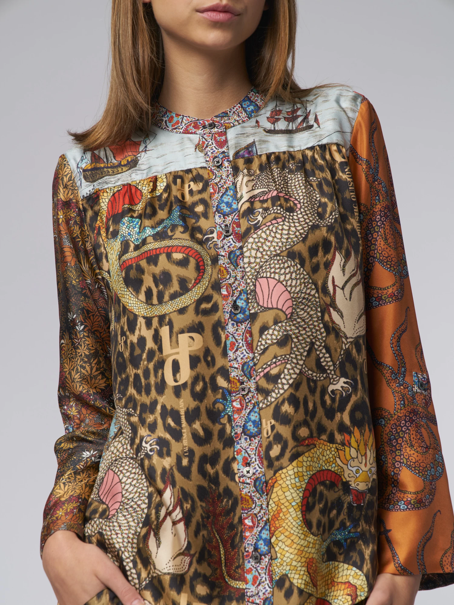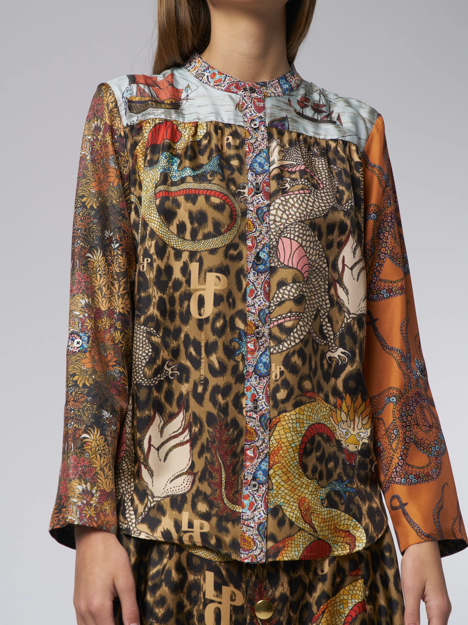 Long-sleeved fully buttoned shirt with mao collar and yoke in Dragons” and “Octopus” prints with details in Liberty Cotton.