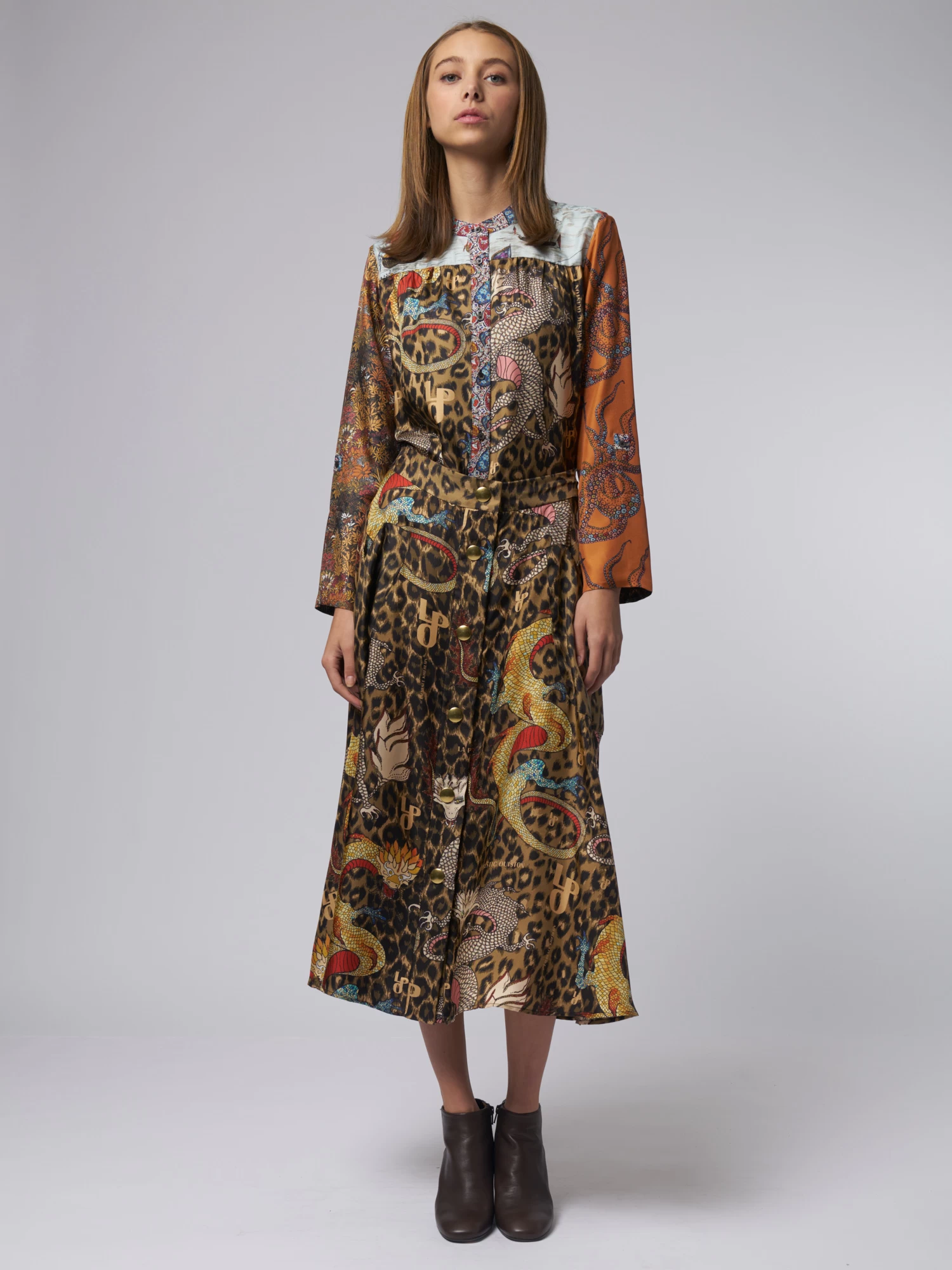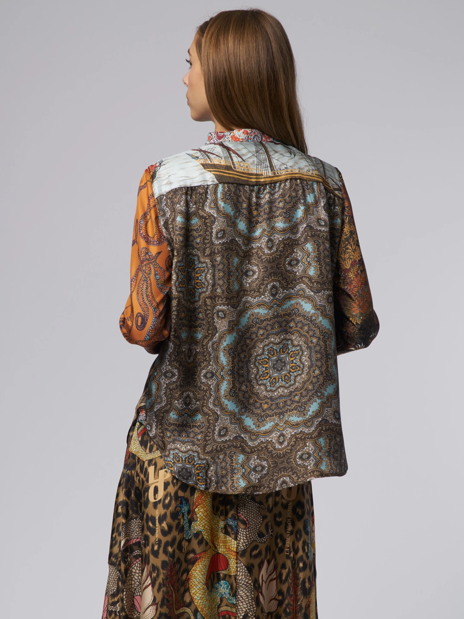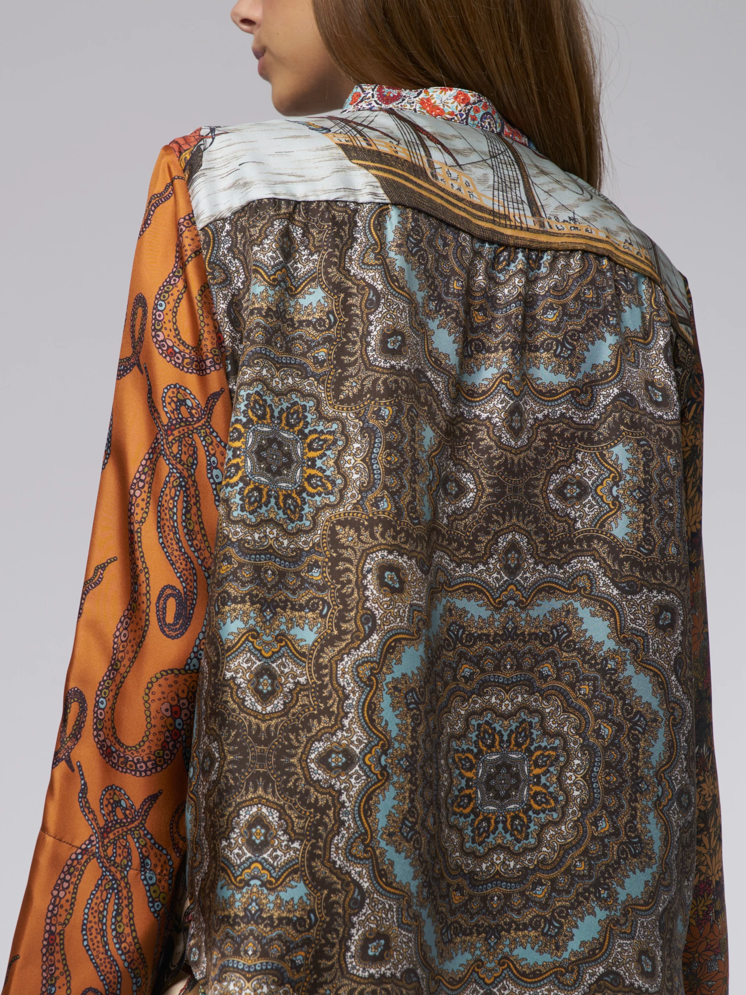 Long-sleeved fully buttoned shirt with mao collar and yoke in Dragons” and “Octopus” prints with details in Liberty Cotton.