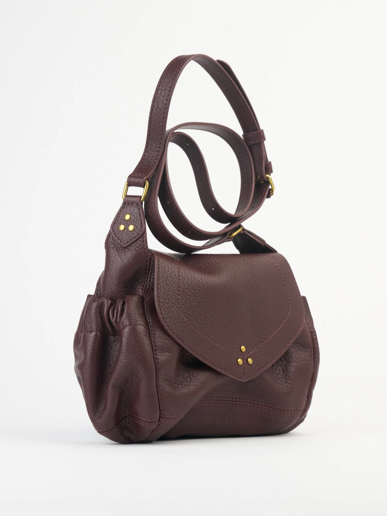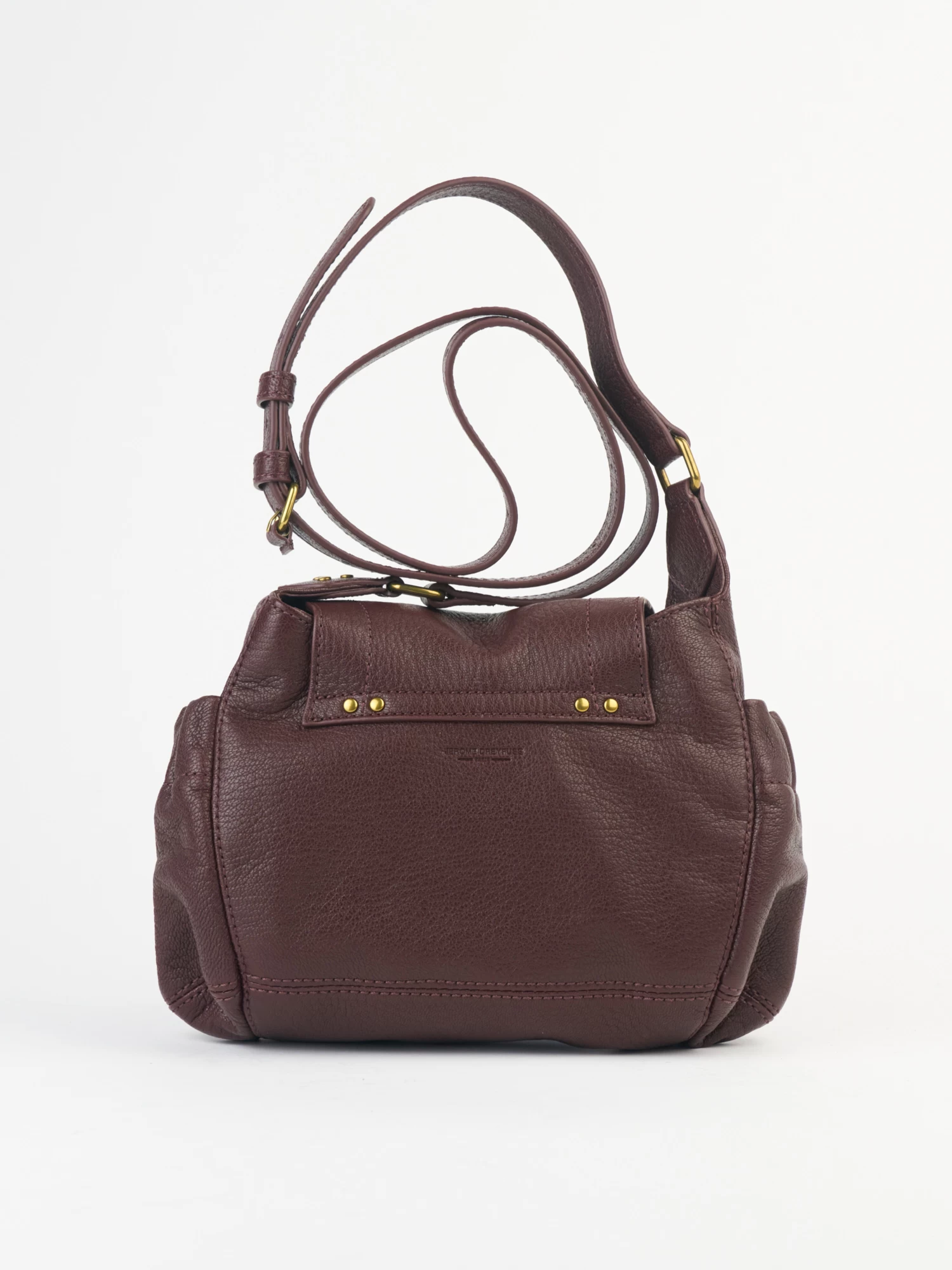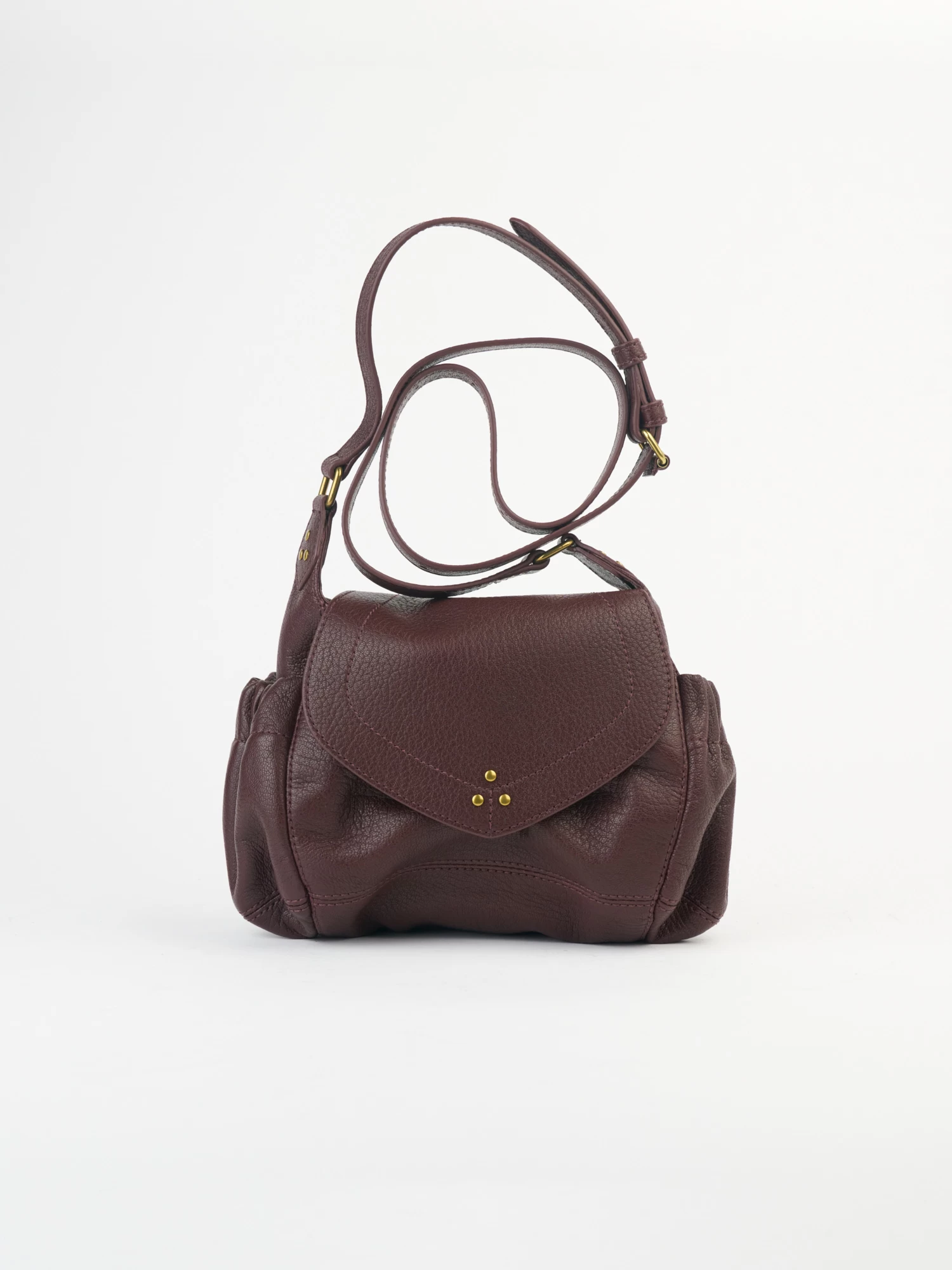 The mini messenger bag with a flap closed by a magnet has an adjustable shoulder strap, two pockets on the outside closed by a snap, and an interior compartment with a patch pocket.