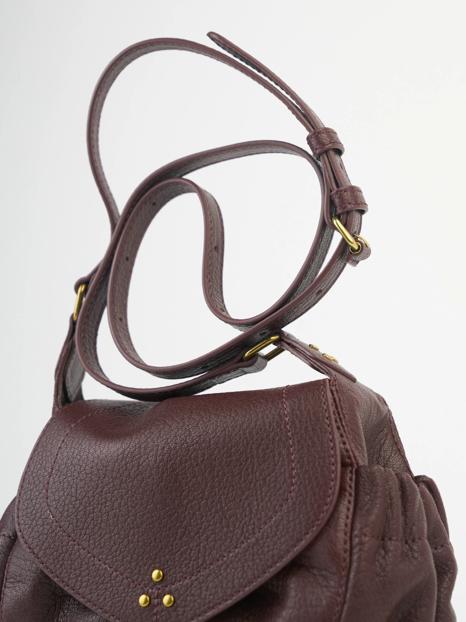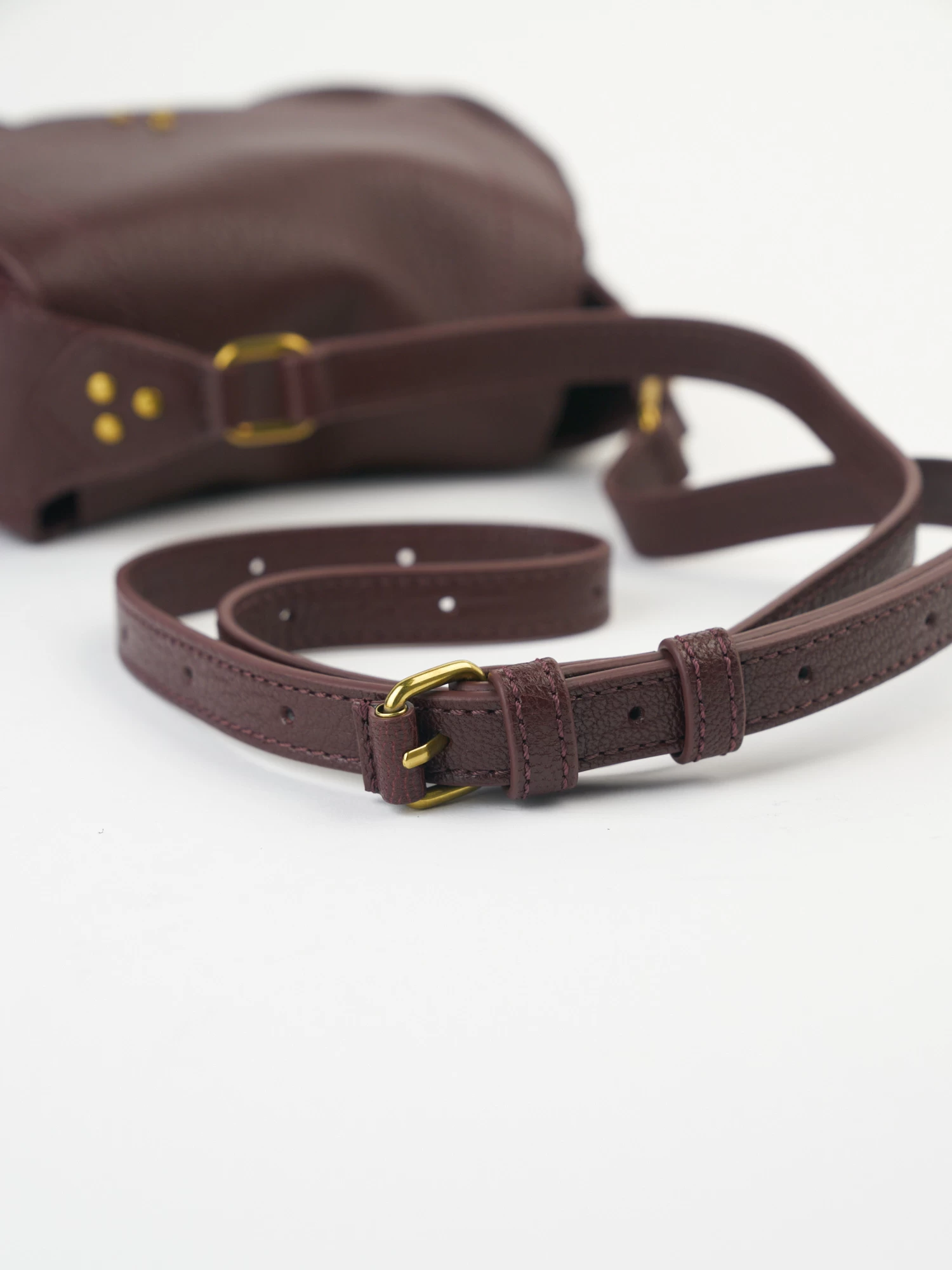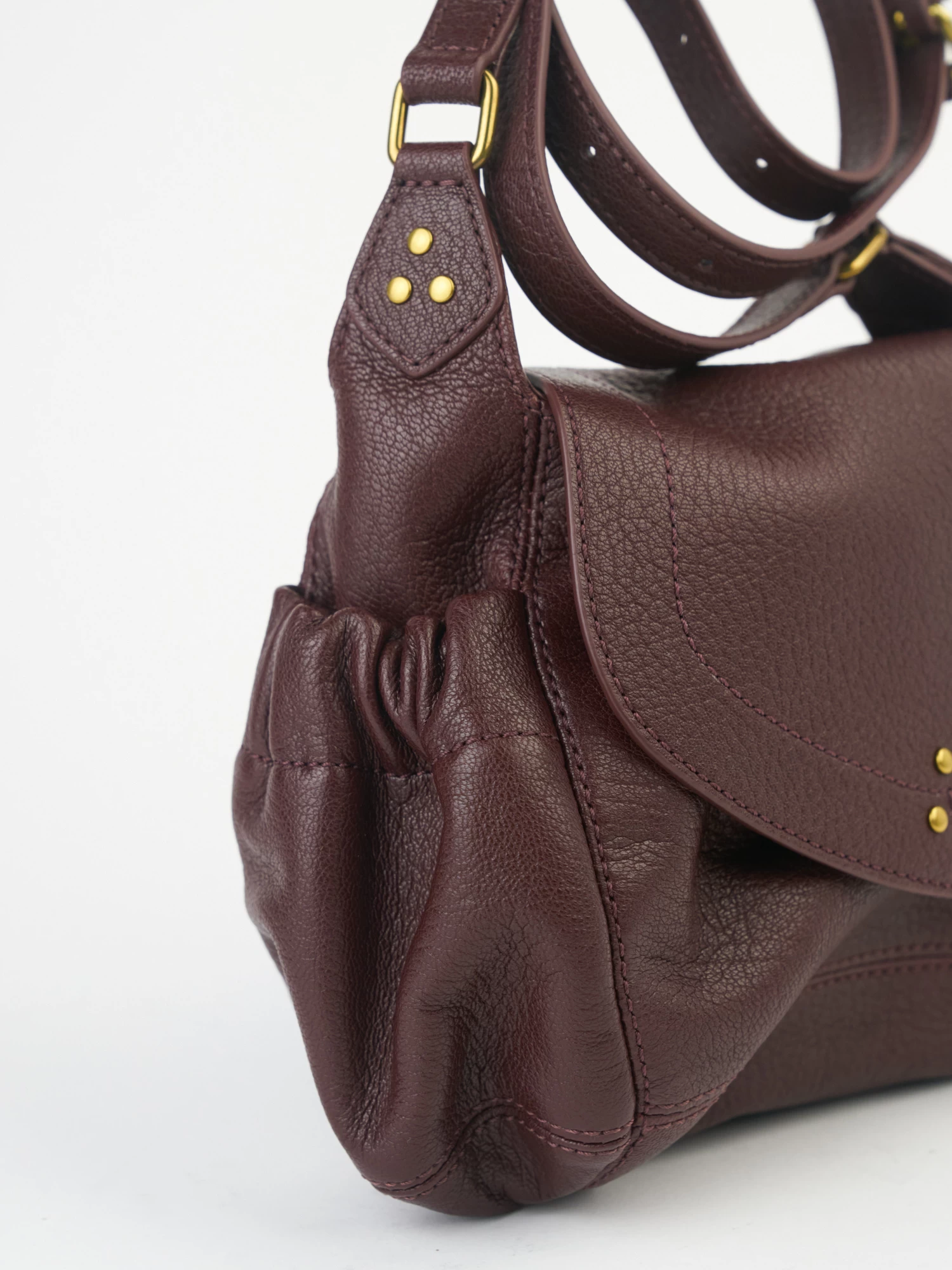 The mini messenger bag with a flap closed by a magnet has an adjustable shoulder strap, two pockets on the outside closed by a snap, and an interior compartment with a patch pocket.