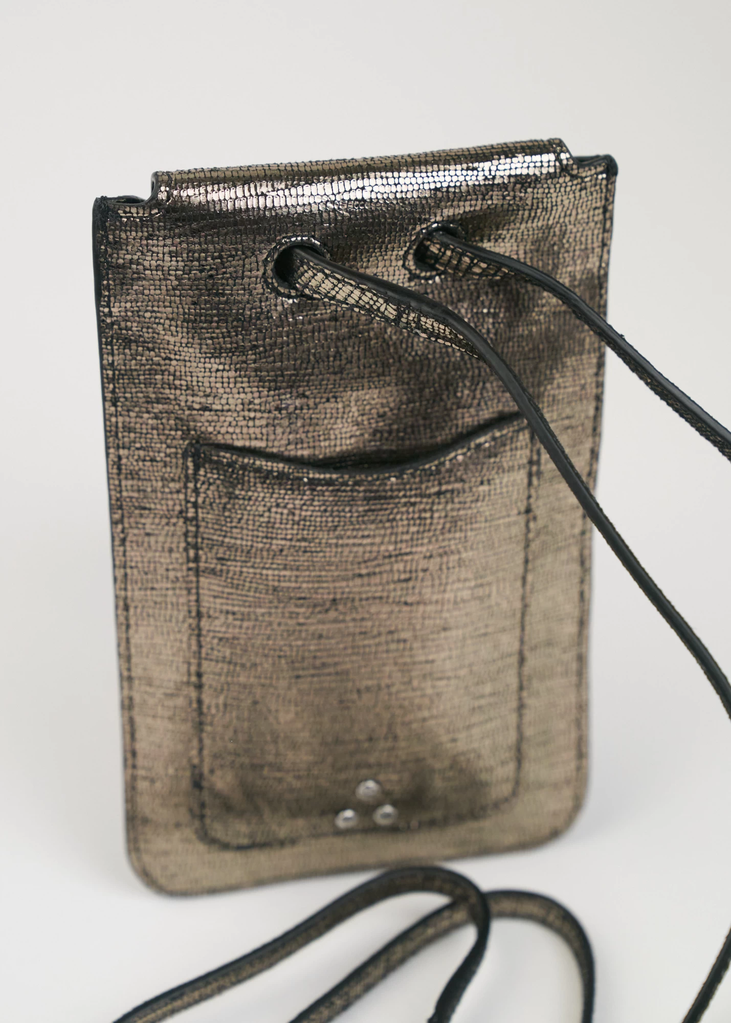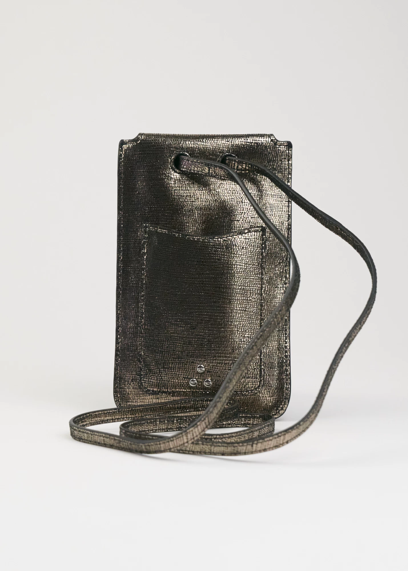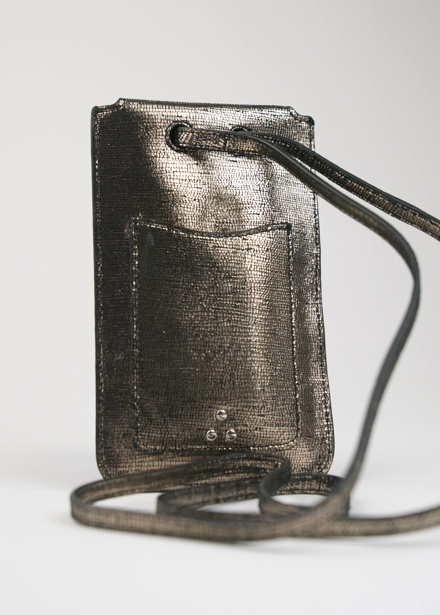 Phone case with cross-body leather shoulder strap.One external patch pocket.