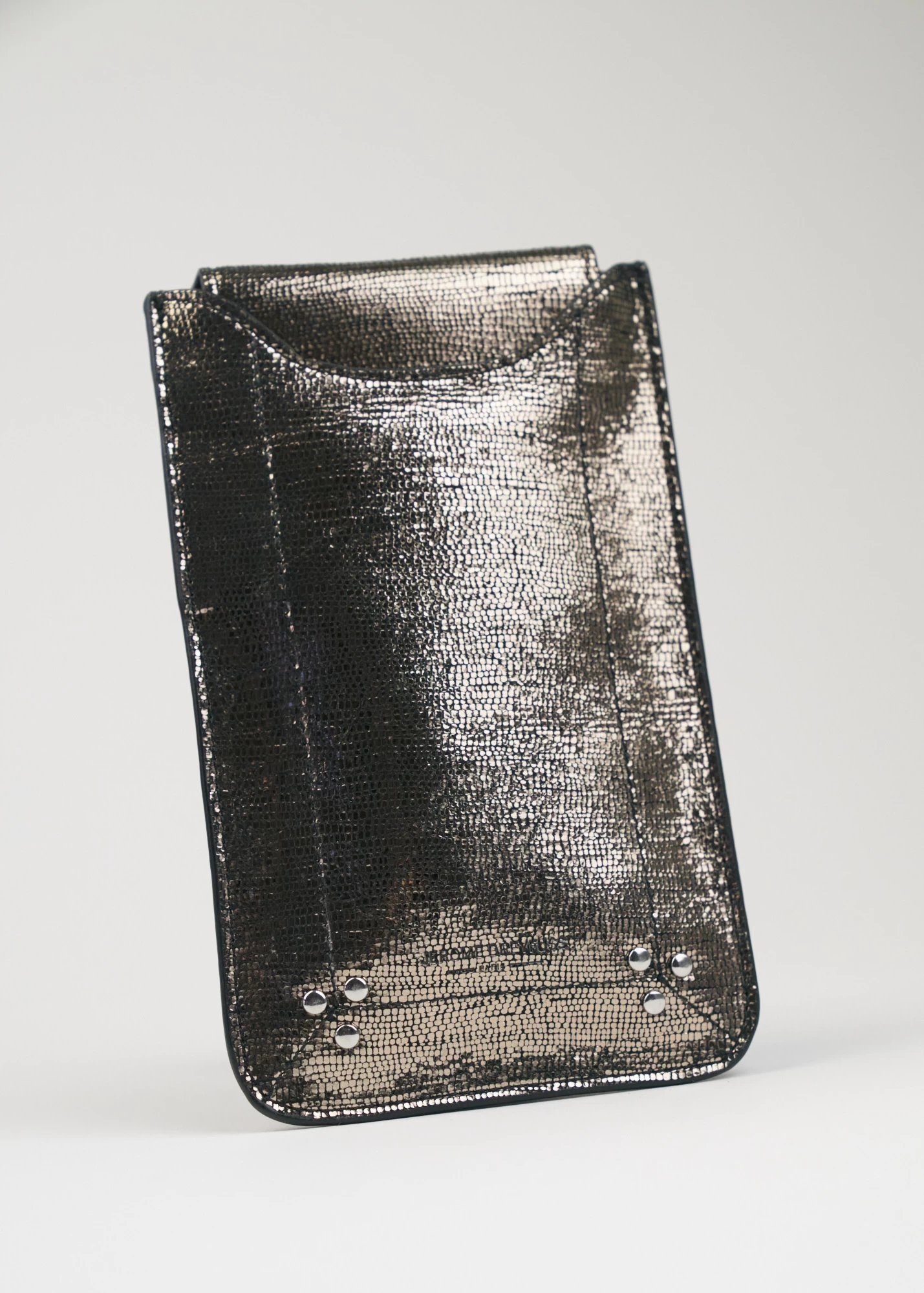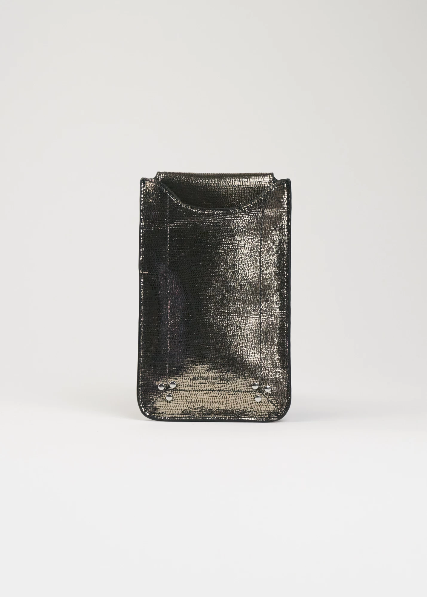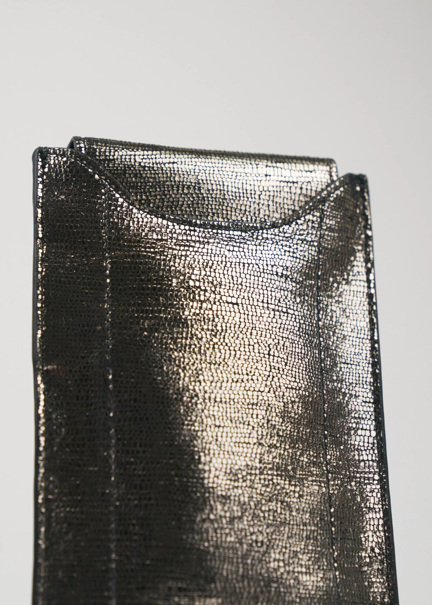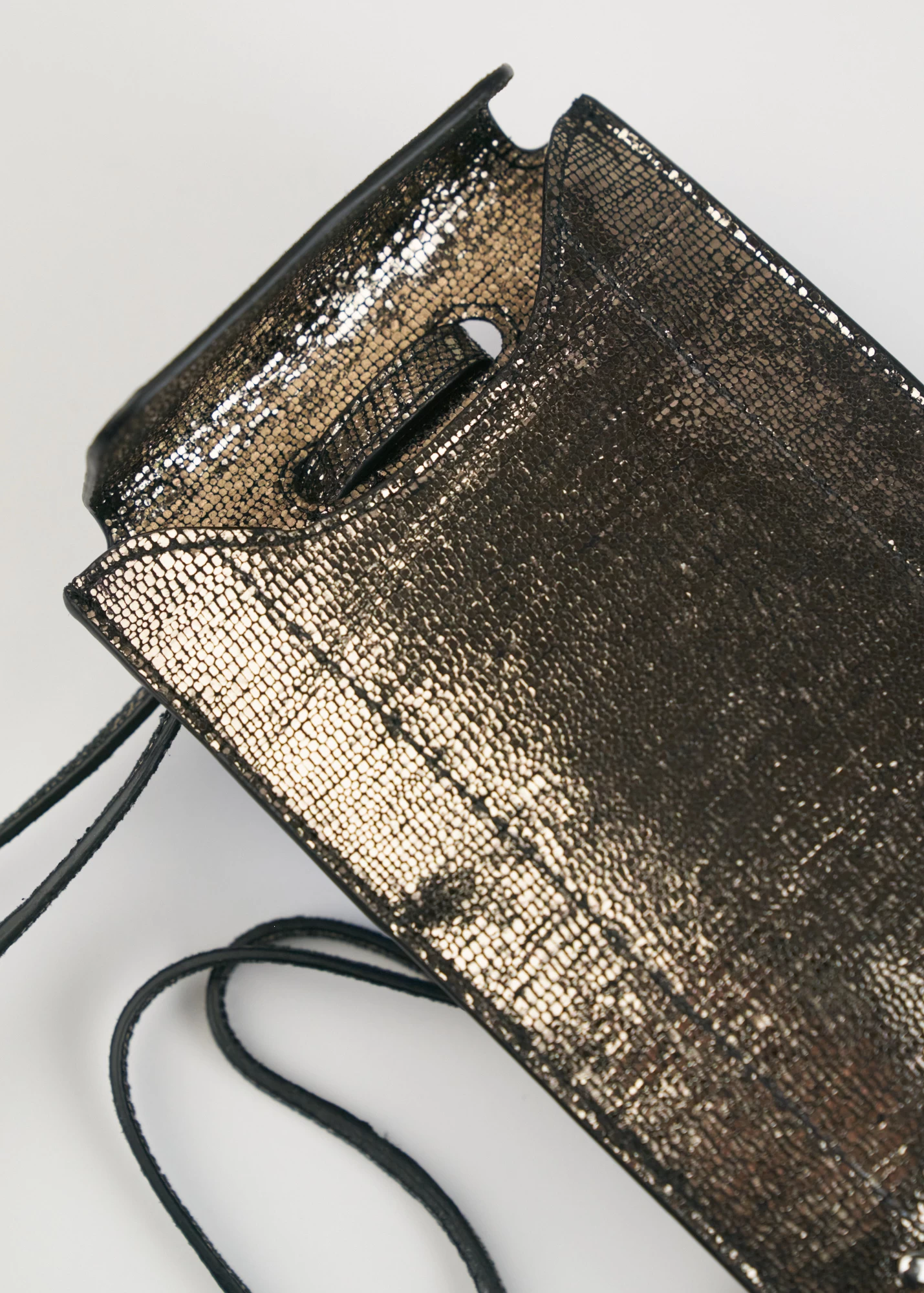 Phone case with cross-body leather shoulder strap.One external patch pocket.