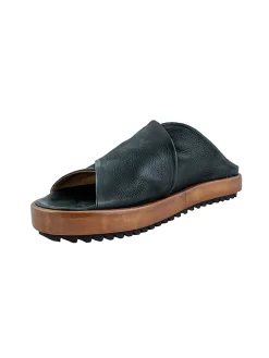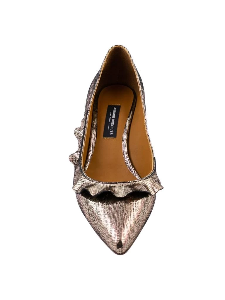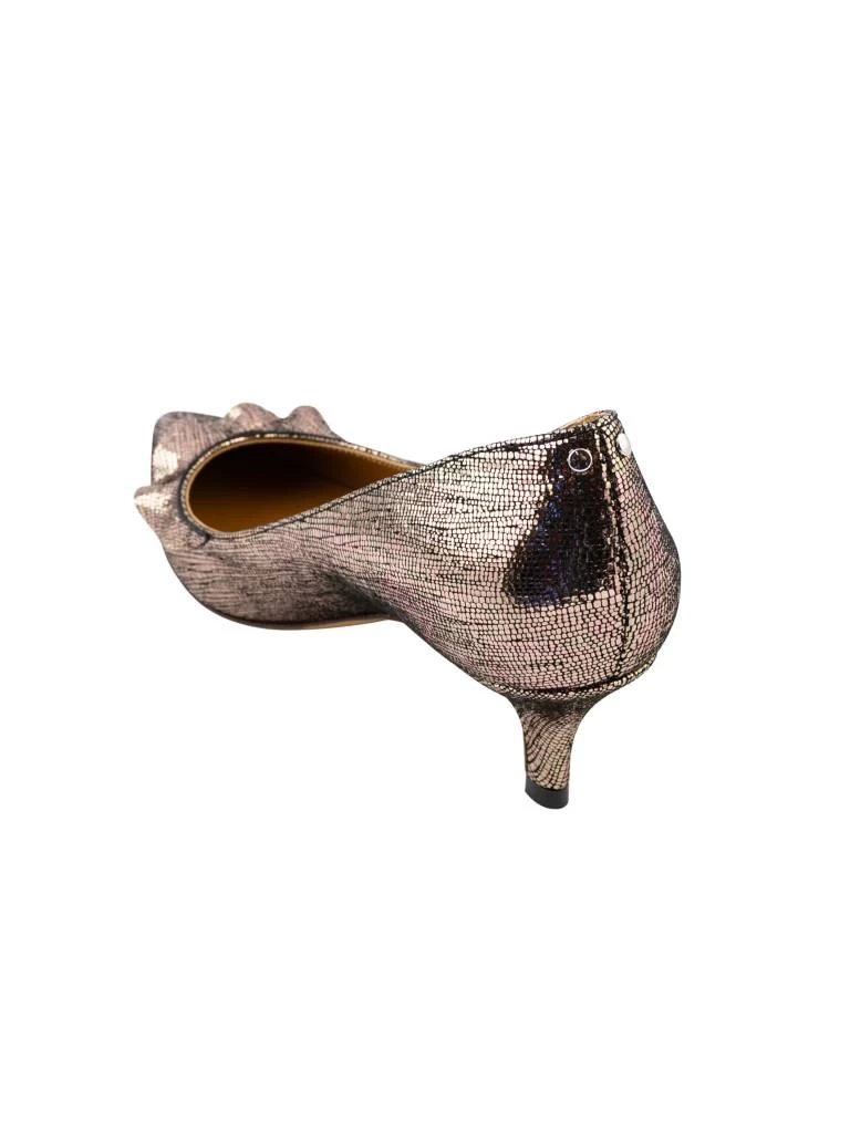 A sleek kitten heel with a ruffled detail and metallic lizard-like texture.