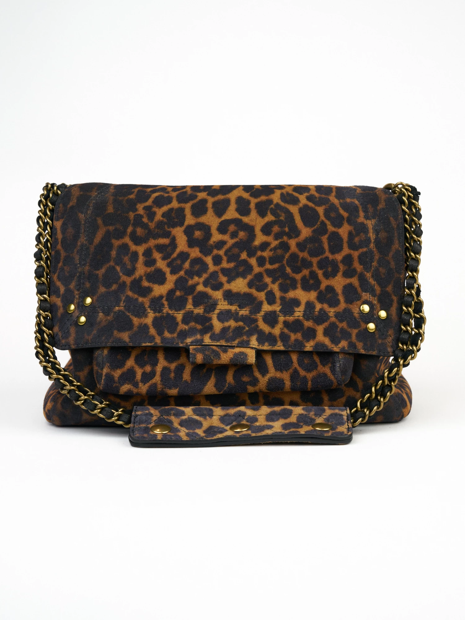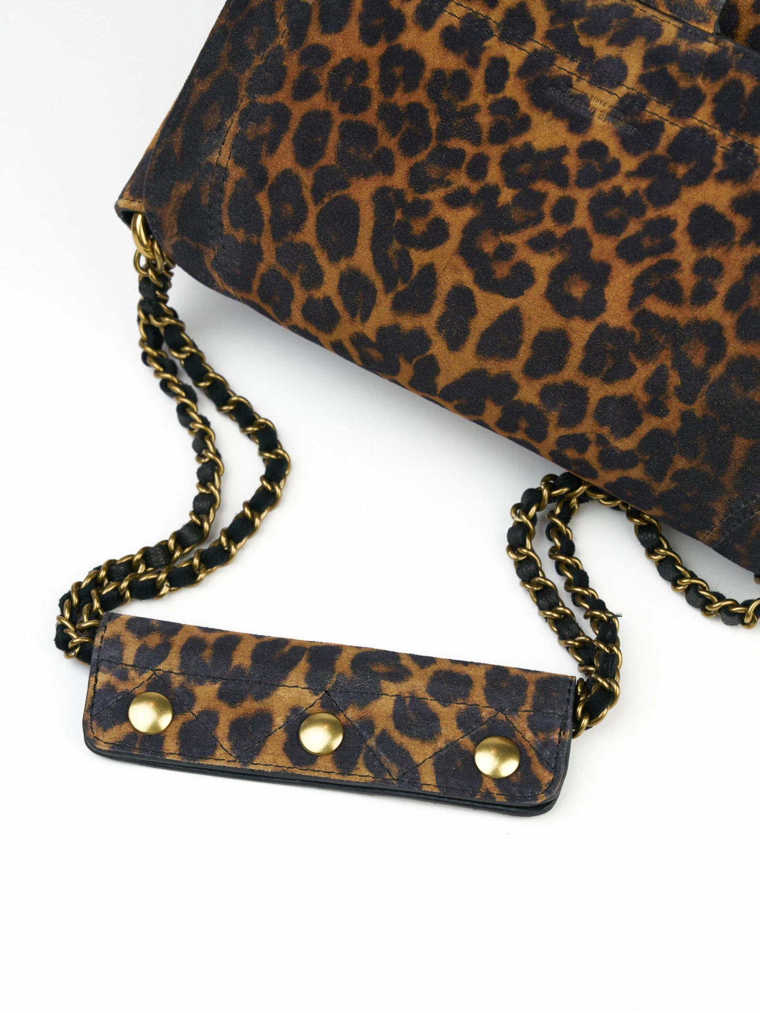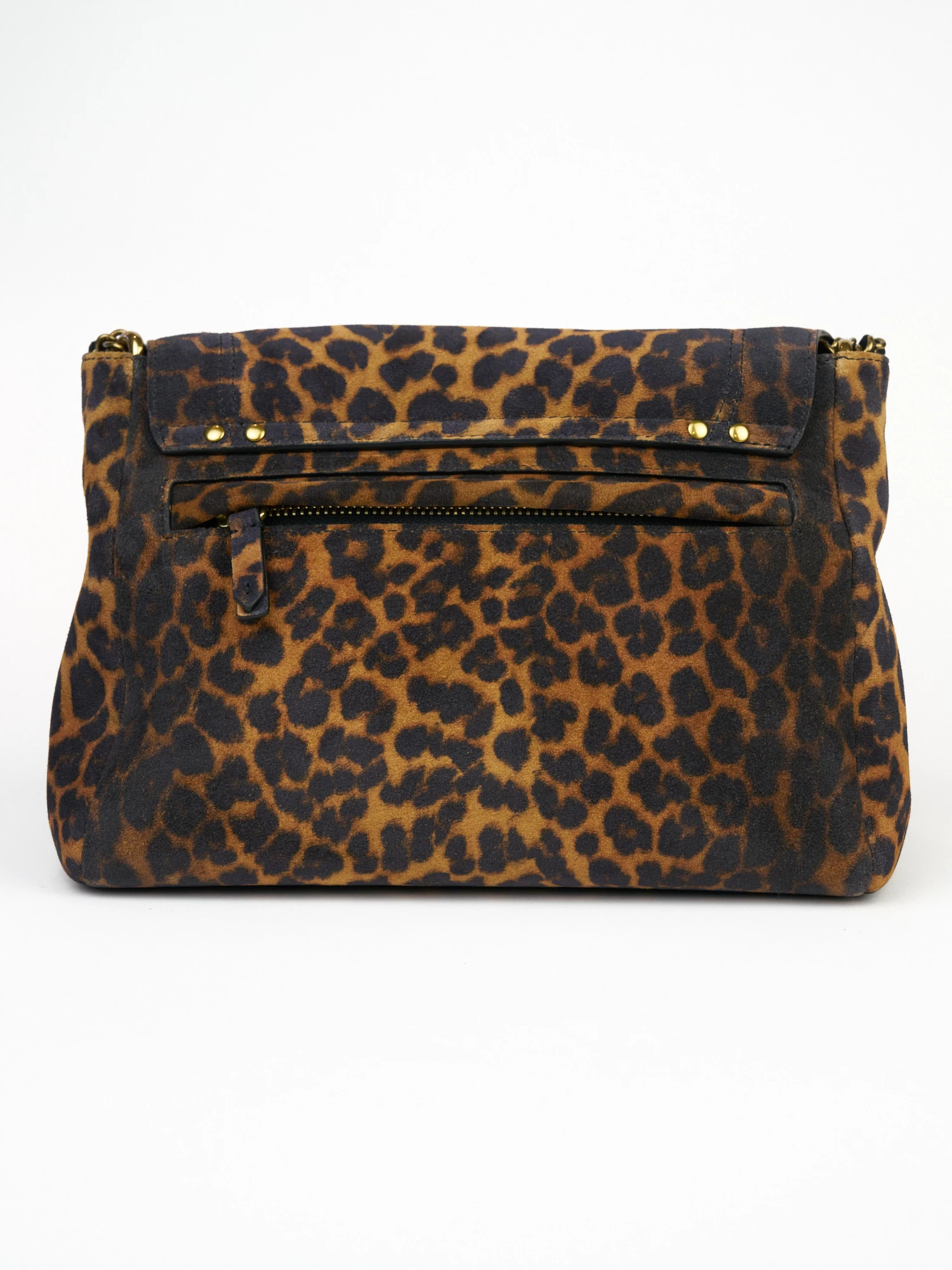A messenger bag to wear over the shoulder or cross-body with an adjustable chain and leather shoulder strap. It has one small pocket under the flap, one exterior zipped pocket, and one interior pocket.