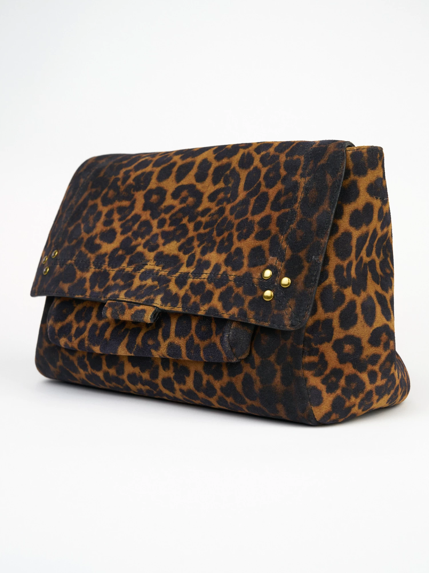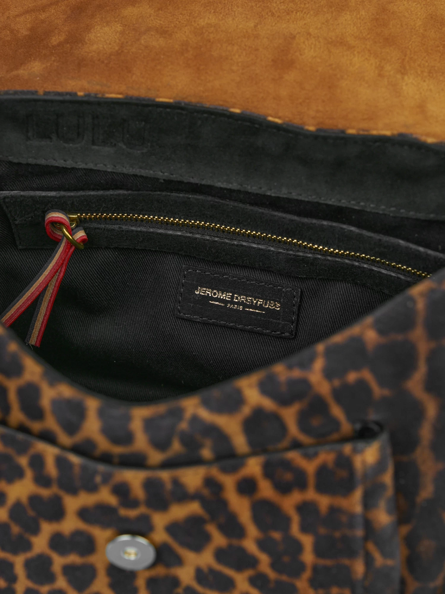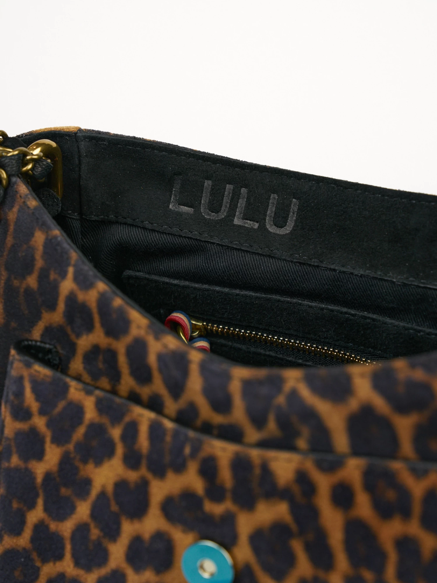 A messenger bag to wear over the shoulder or cross-body with an adjustable chain and leather shoulder strap. It has one small pocket under the flap, one exterior zipped pocket, and one interior pocket.