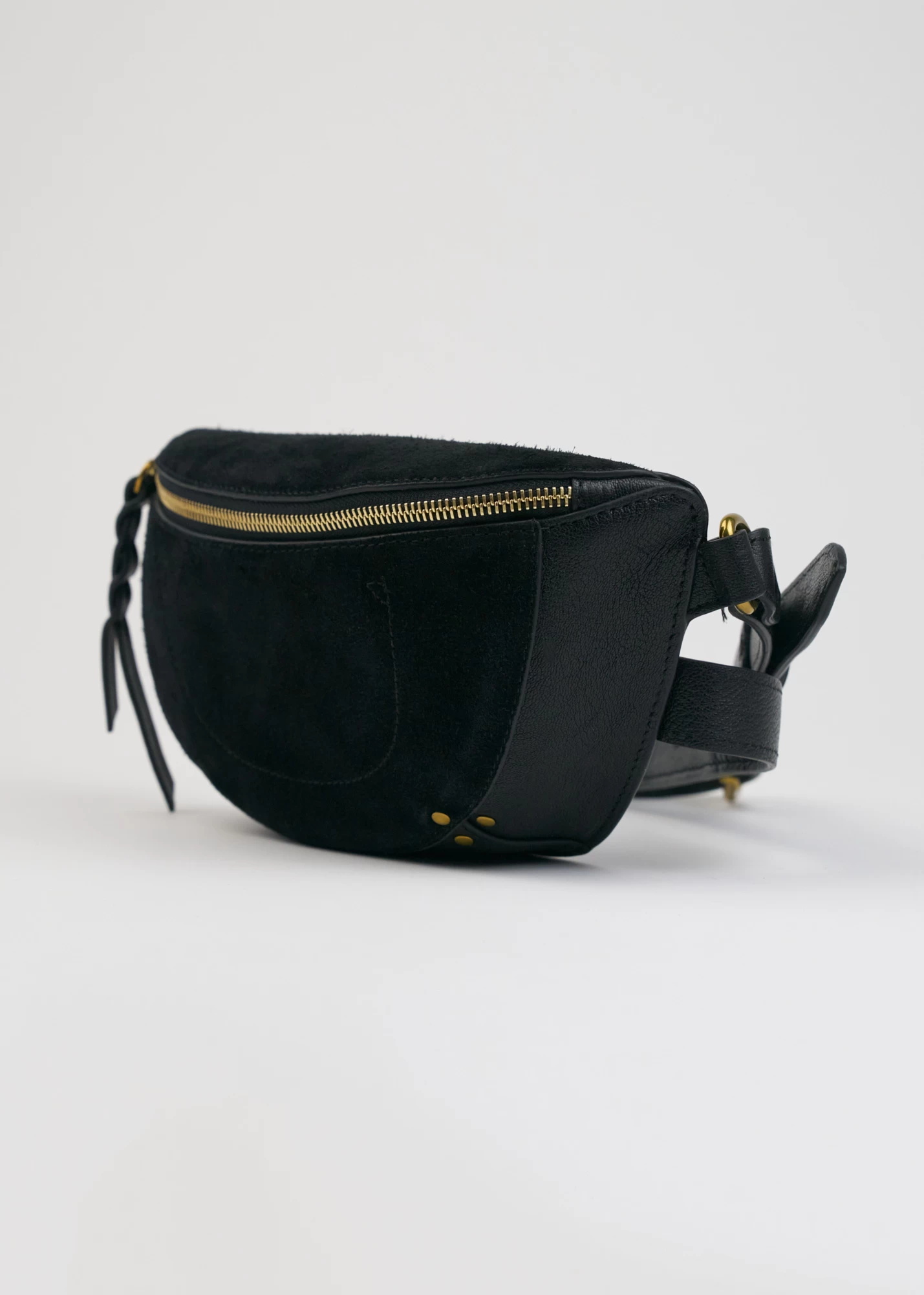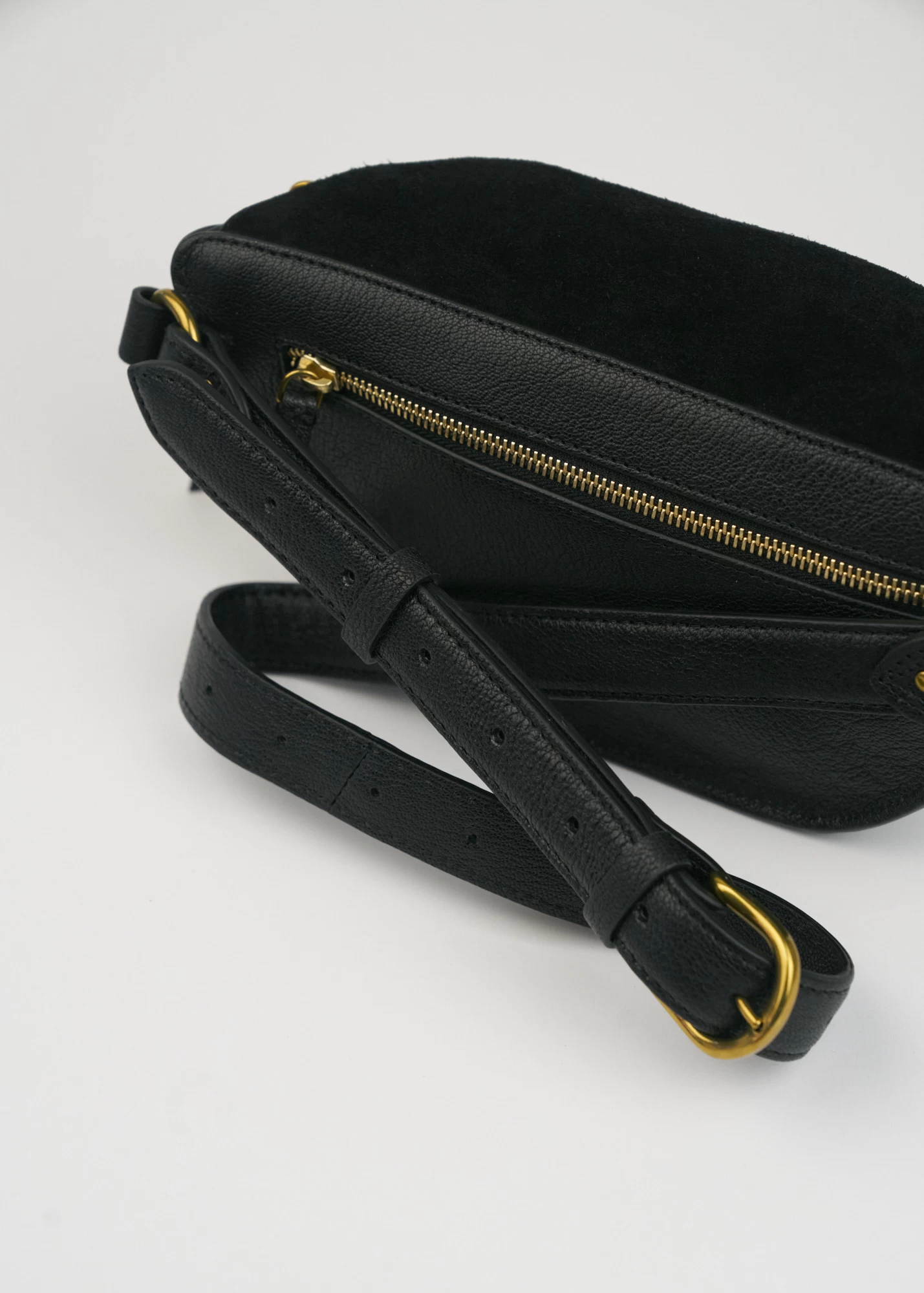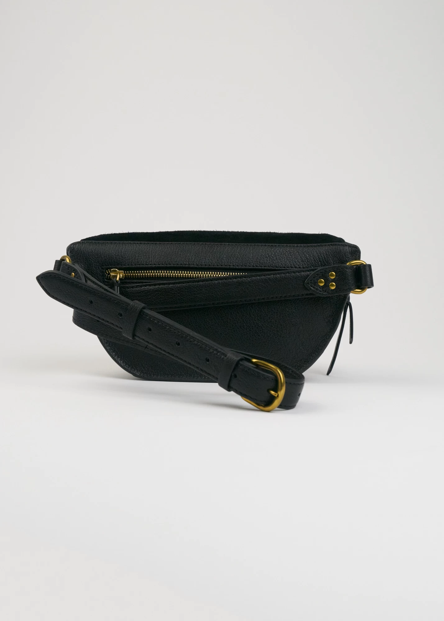 The belt bag is to wear cross-body or at the waist. It has a zipper closure on the top of the bag, an adjustable belt, one inside patch pocket, and an exterior zippered pocket.