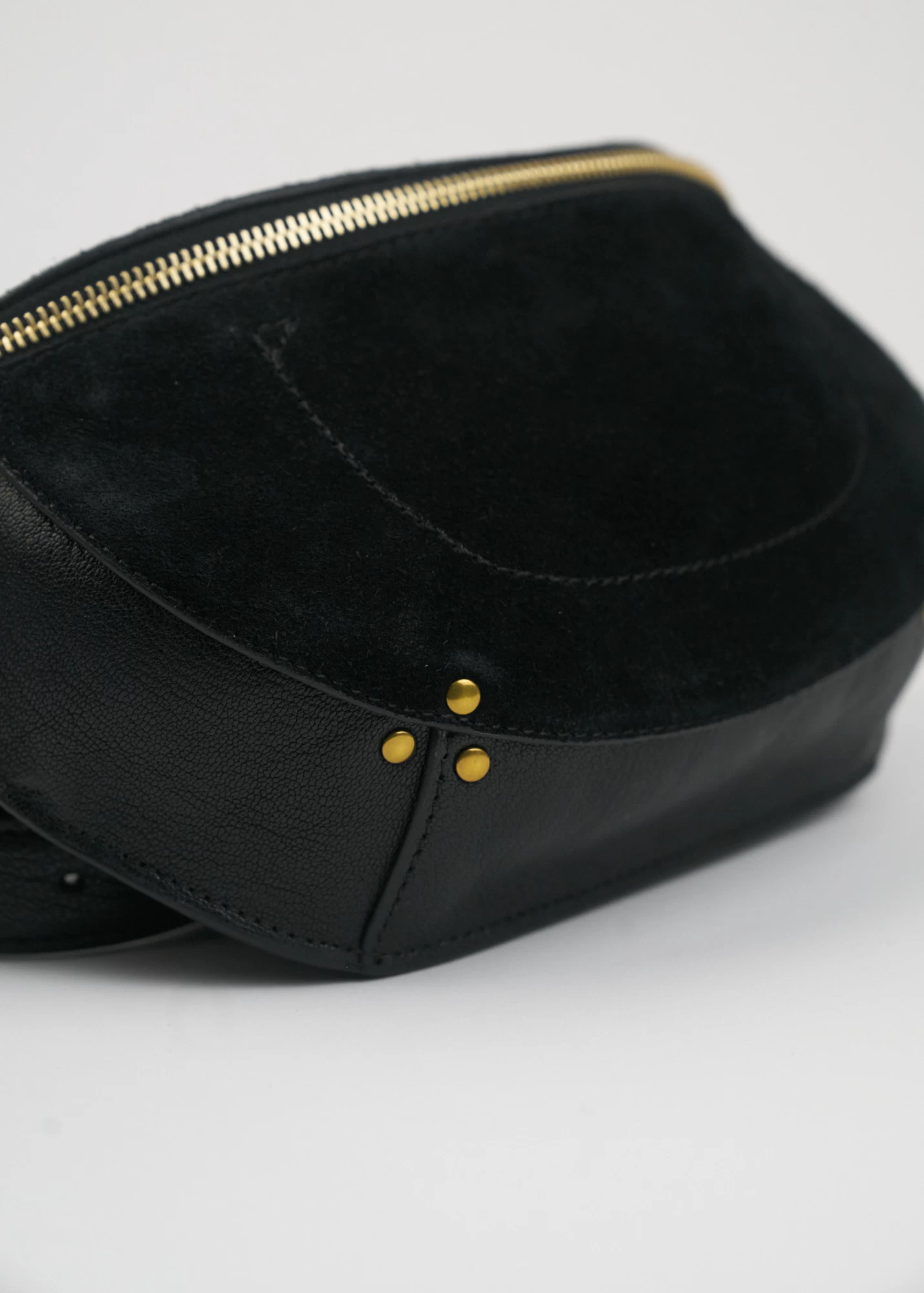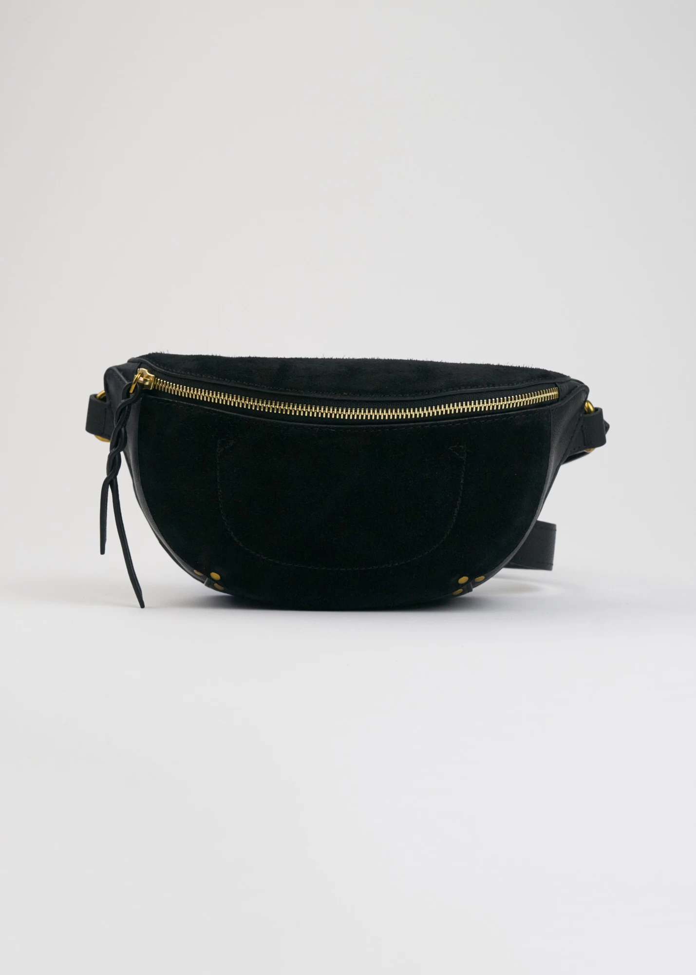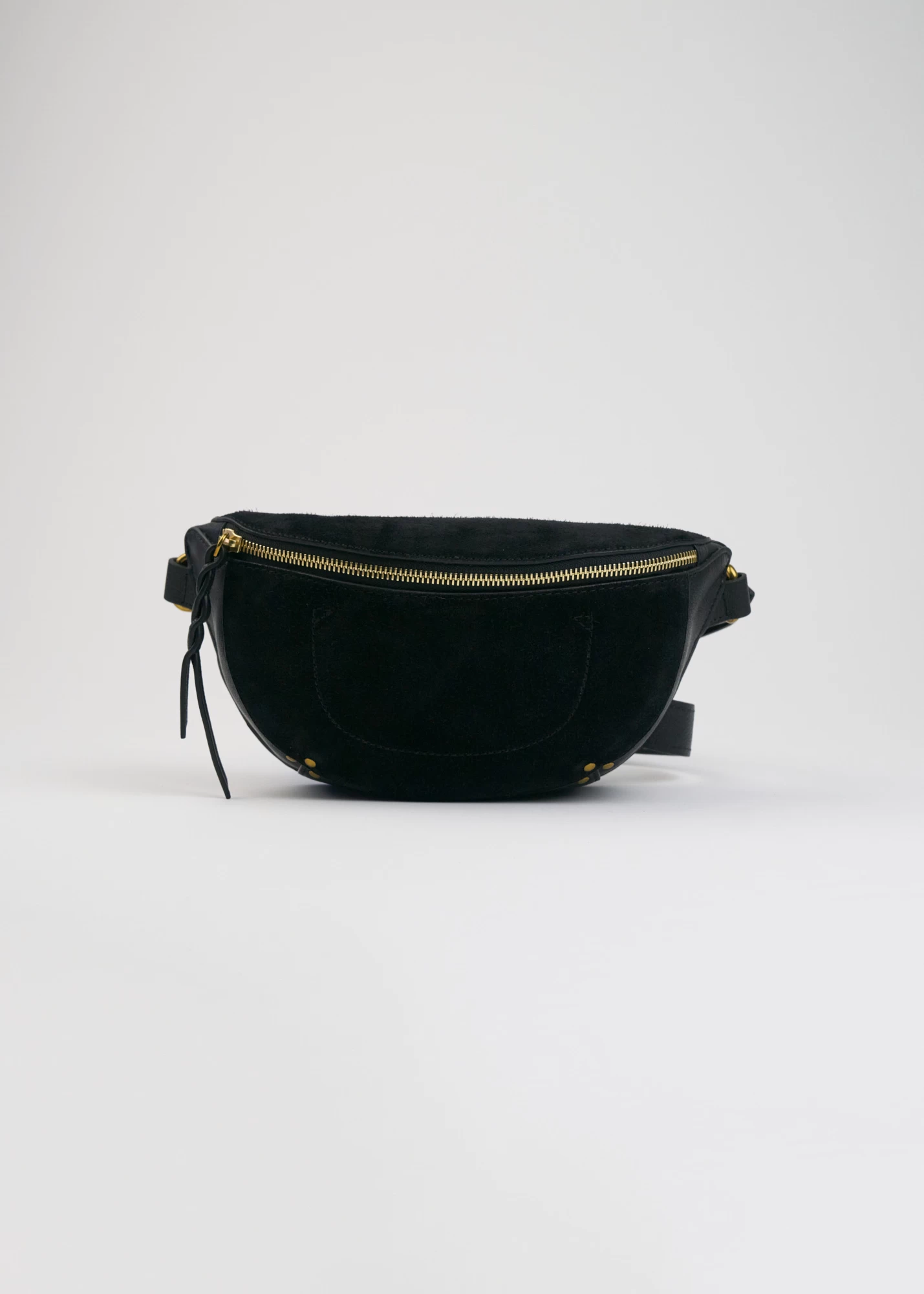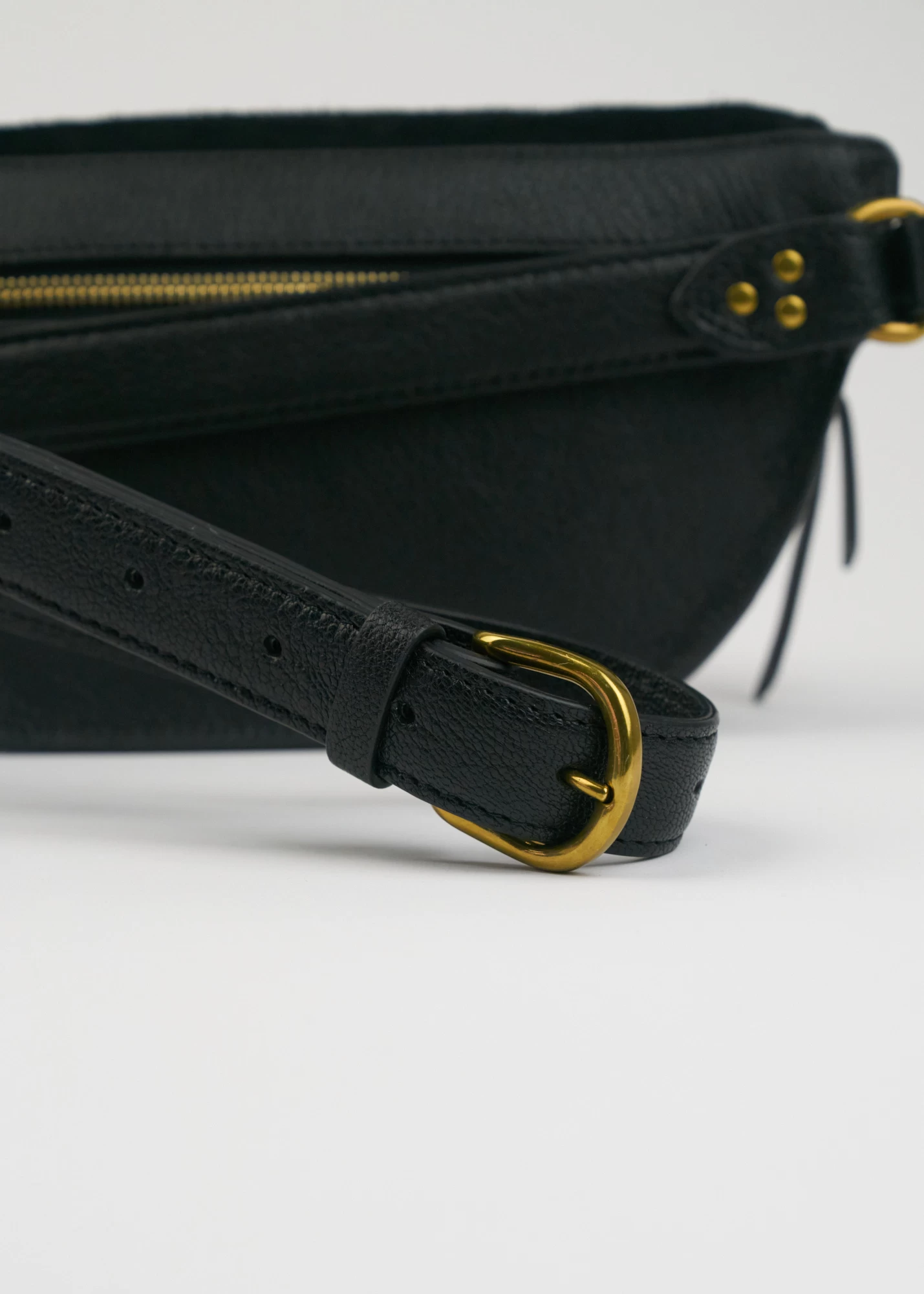 The belt bag is to wear cross-body or at the waist. It has a zipper closure on the top of the bag, an adjustable belt, one inside patch pocket, and an exterior zippered pocket.