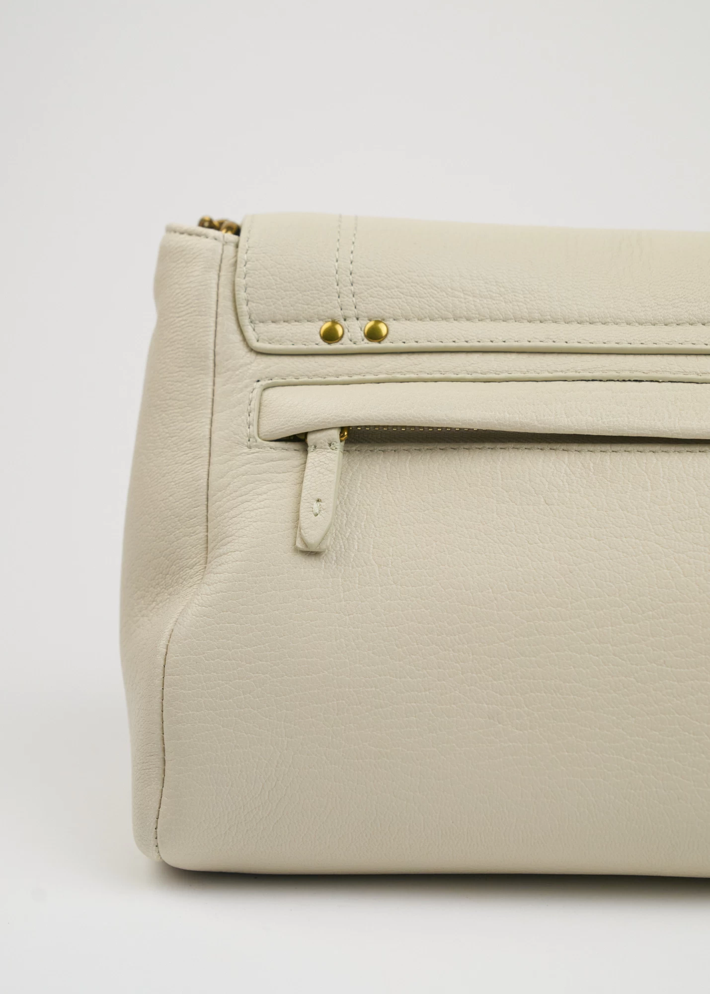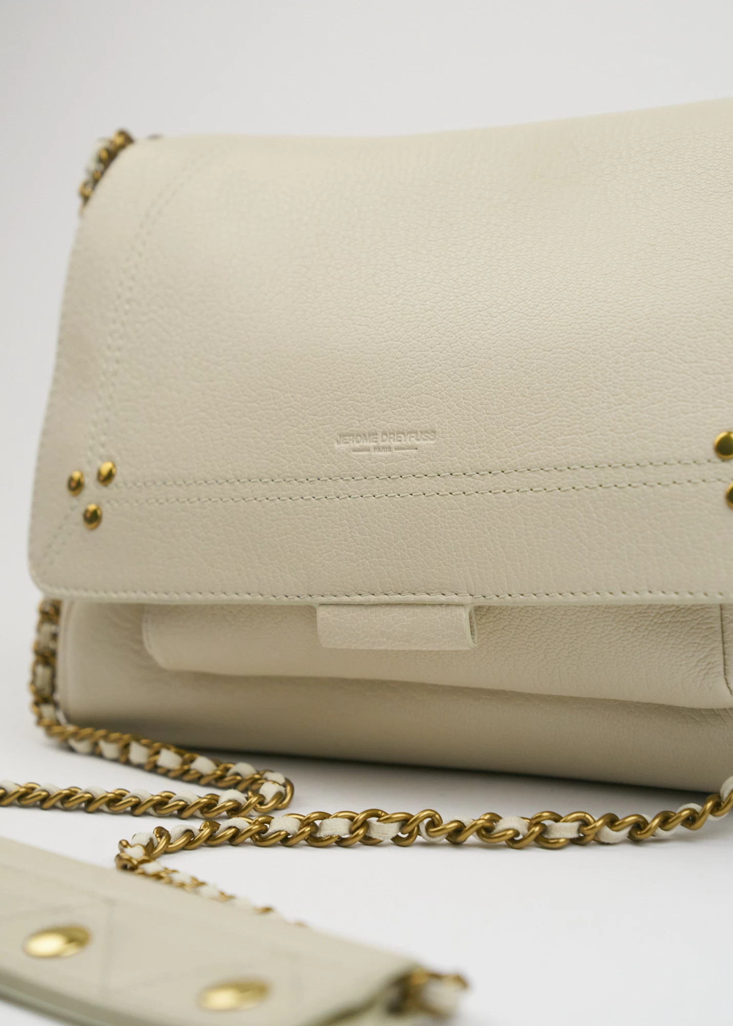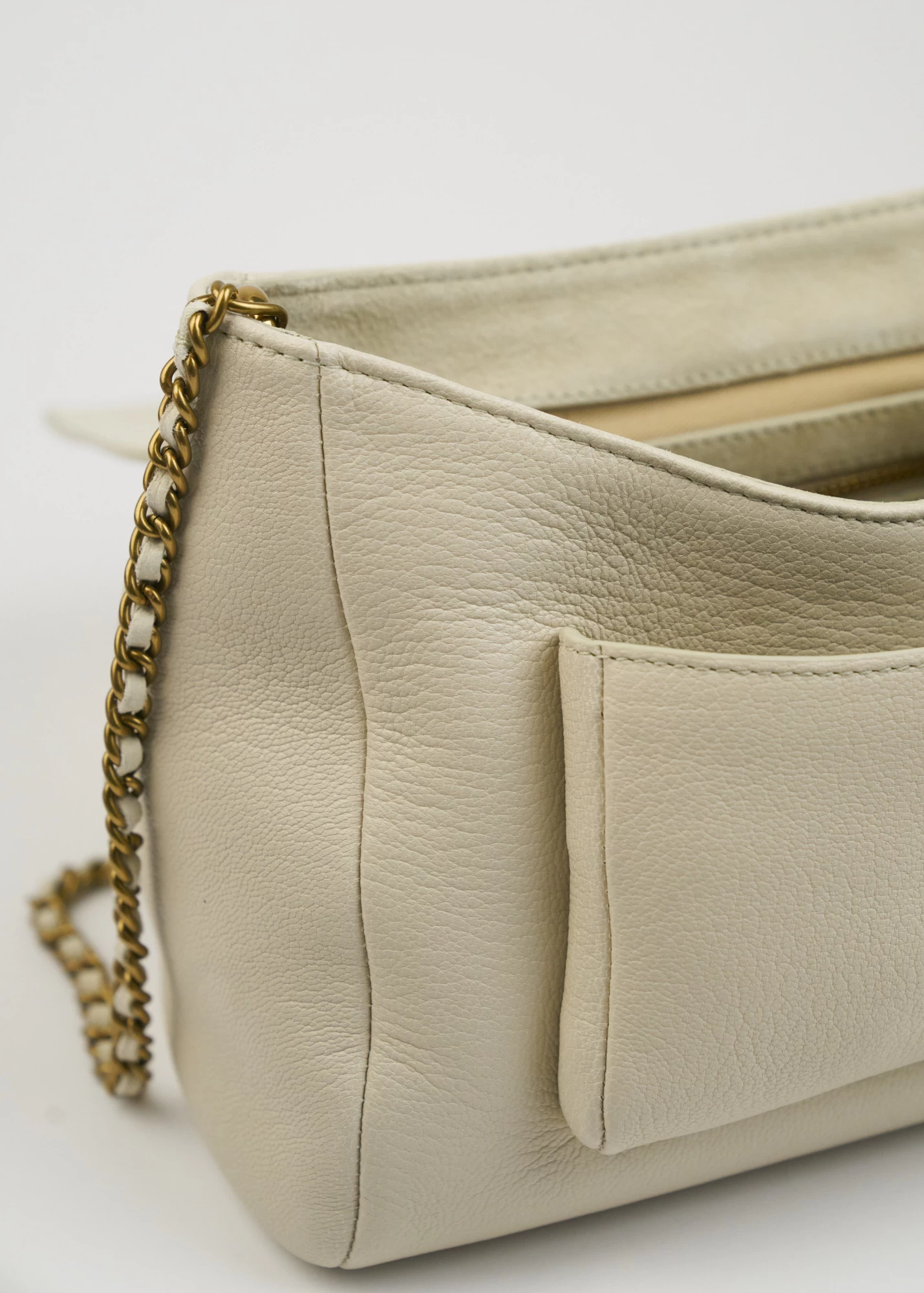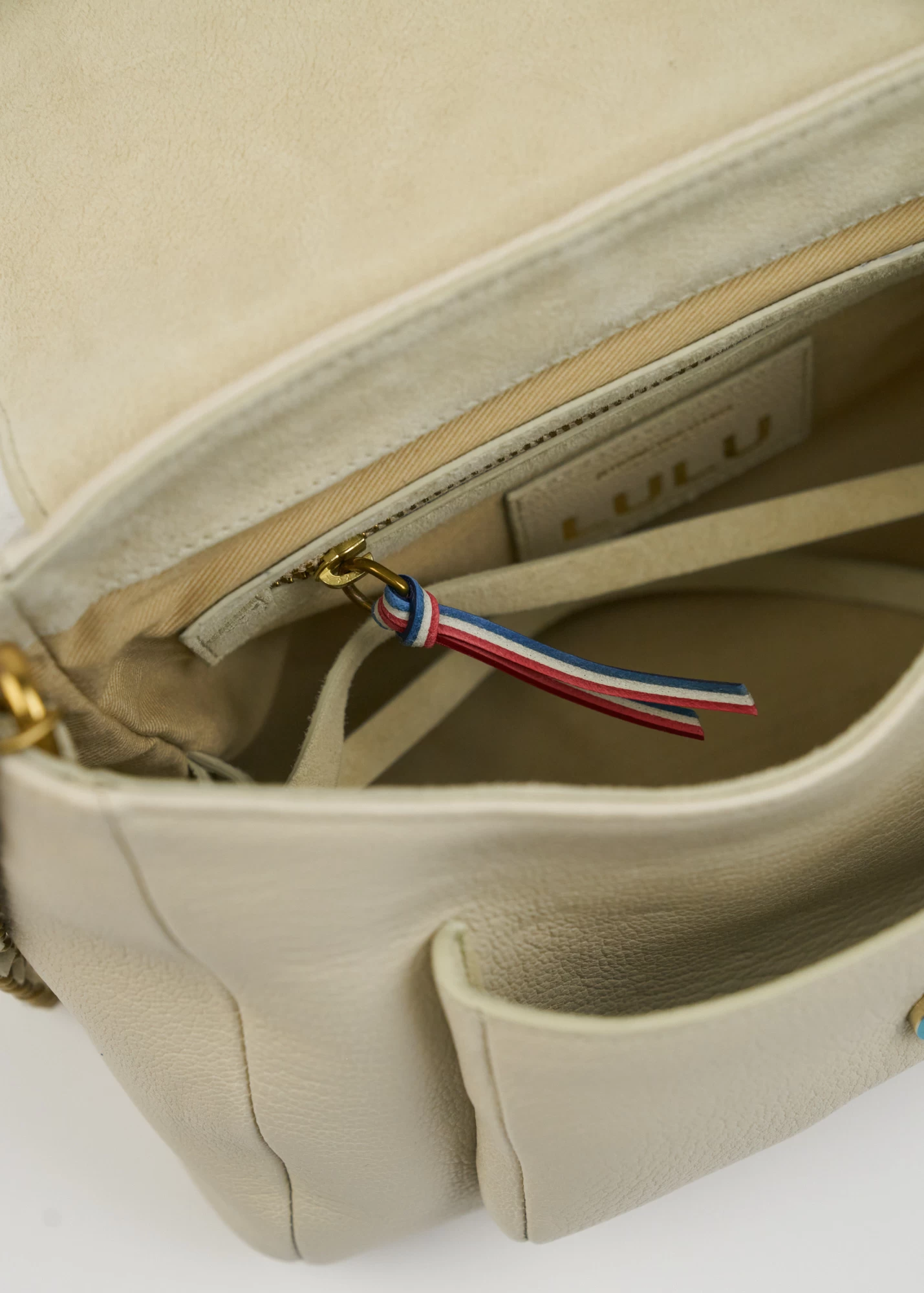 A messenger bag to wear over the shoulder or cross-body with an adjustable chain and leather shoulder strap. It has one small pocket under the flap, one exterior zipped pocket, and one interior pocket.