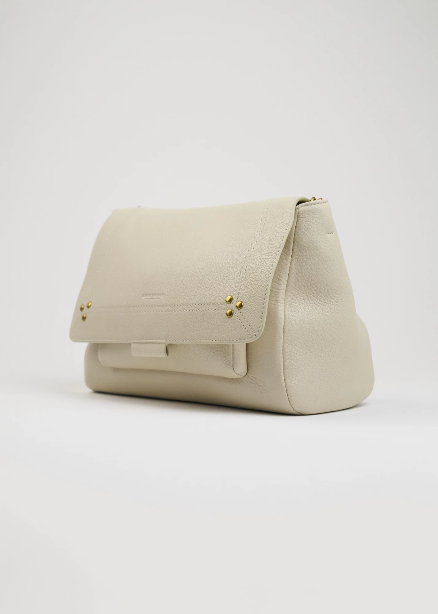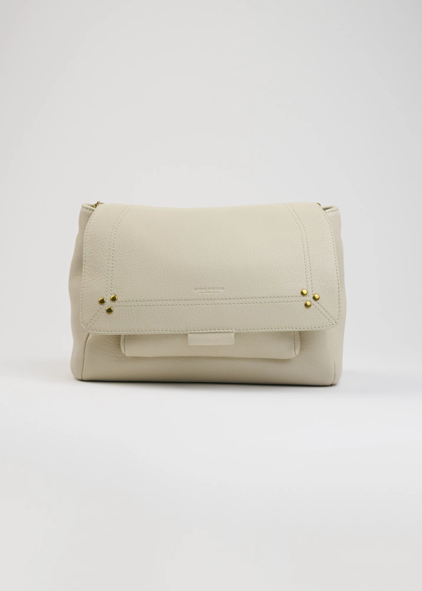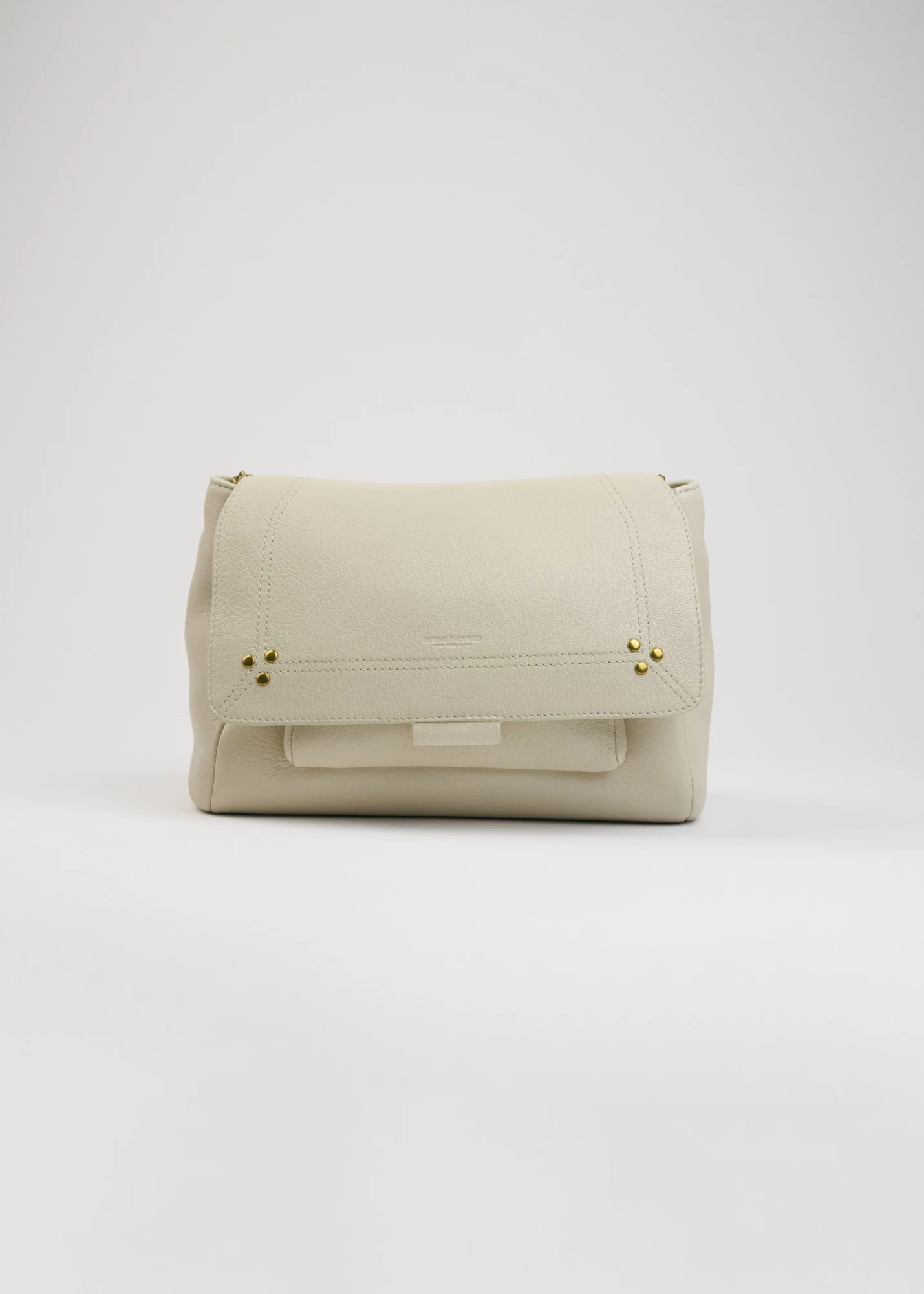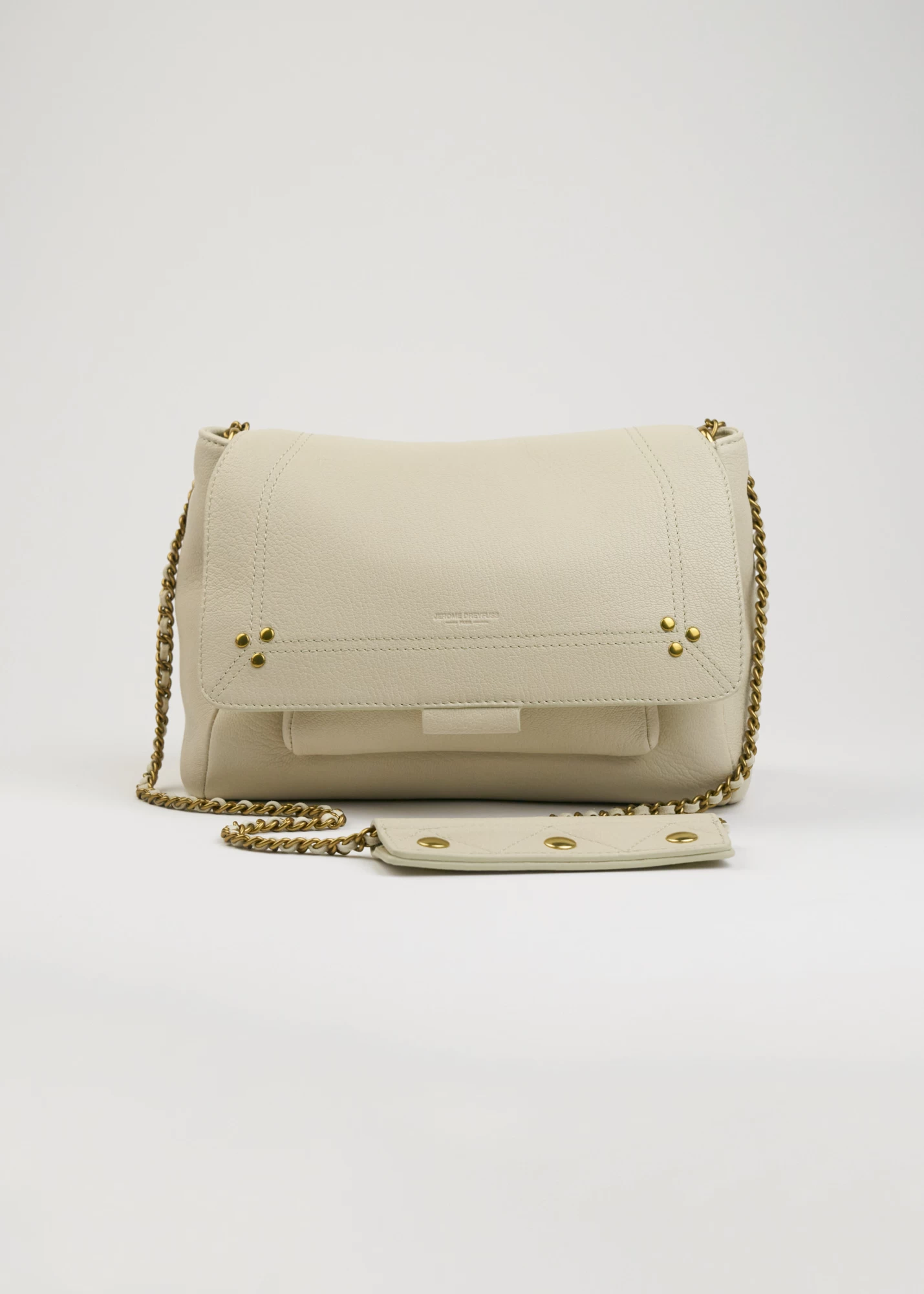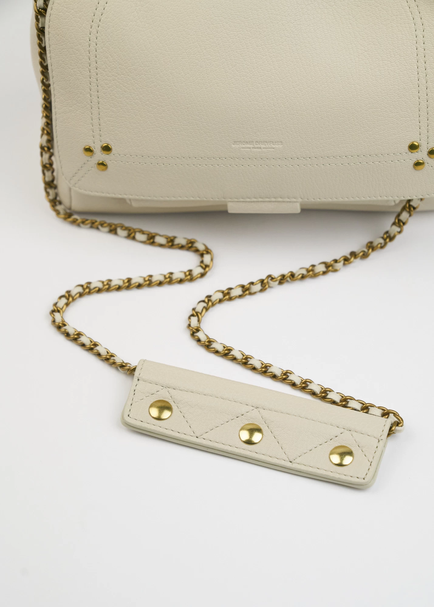 A messenger bag to wear over the shoulder or cross-body with an adjustable chain and leather shoulder strap. It has one small pocket under the flap, one exterior zipped pocket, and one interior pocket.