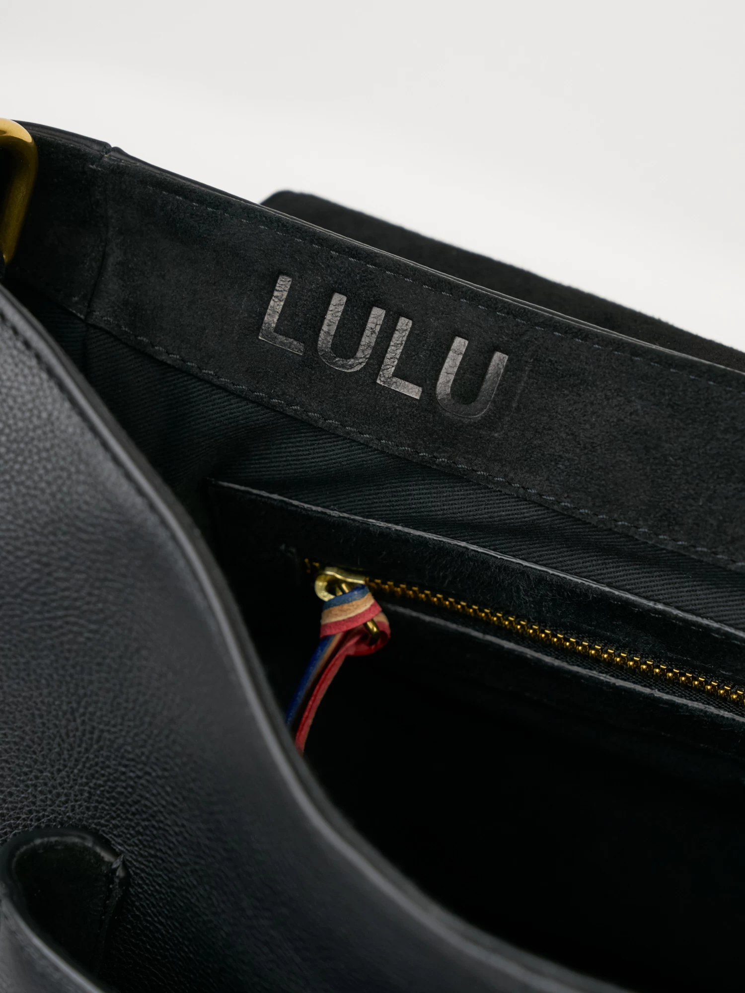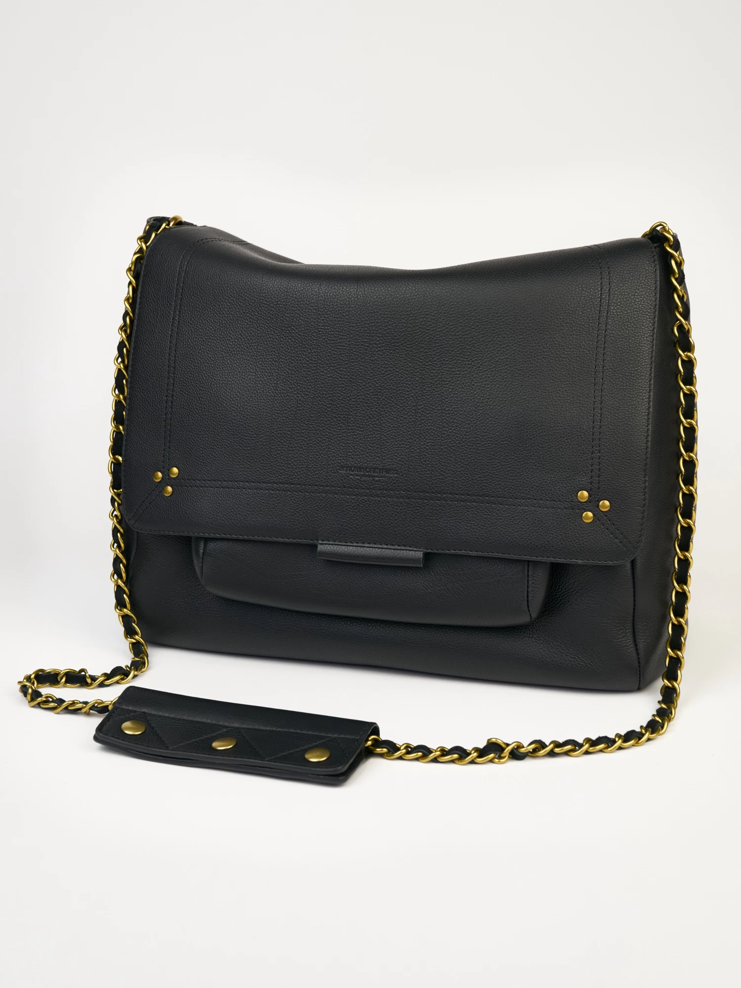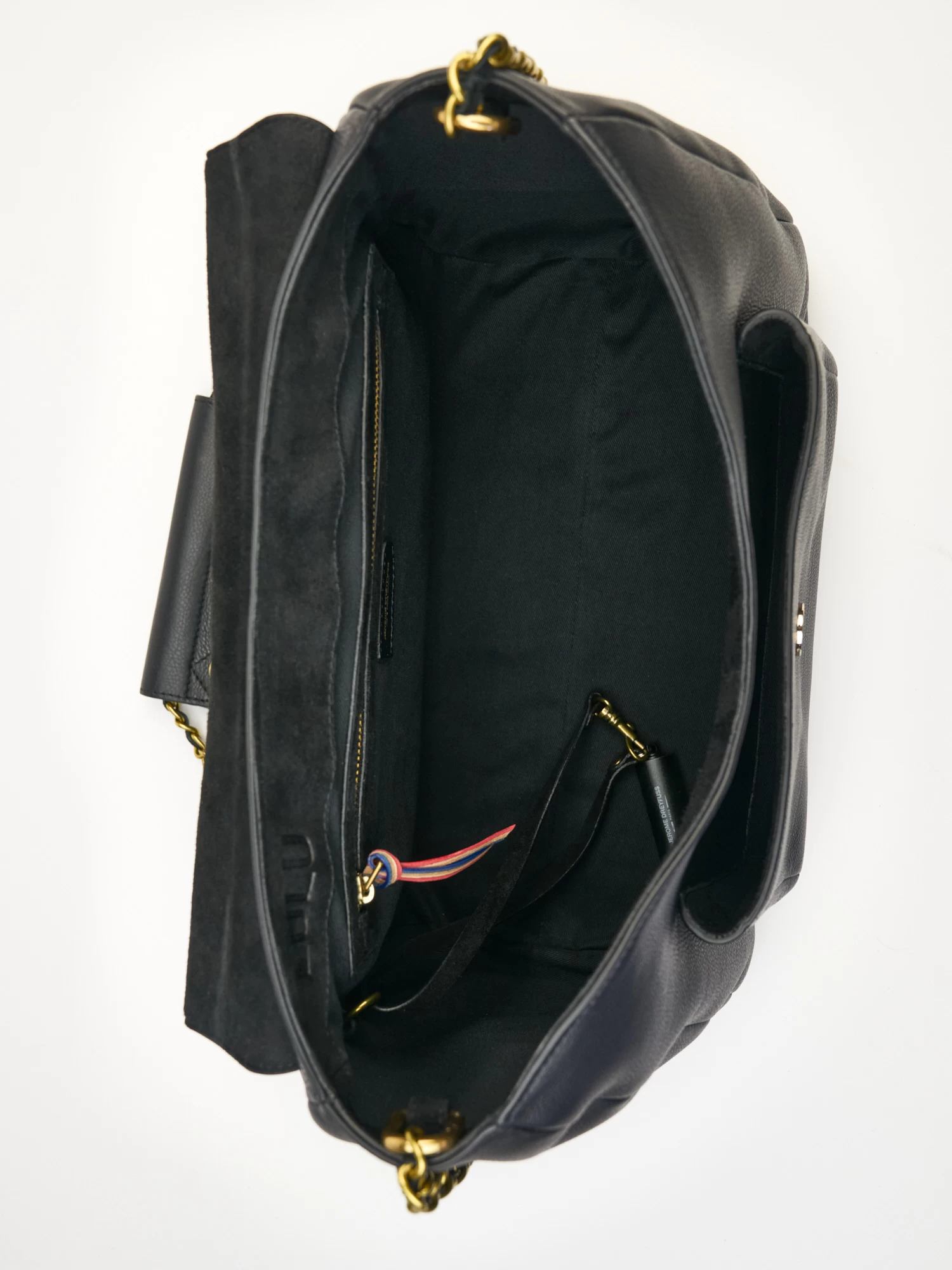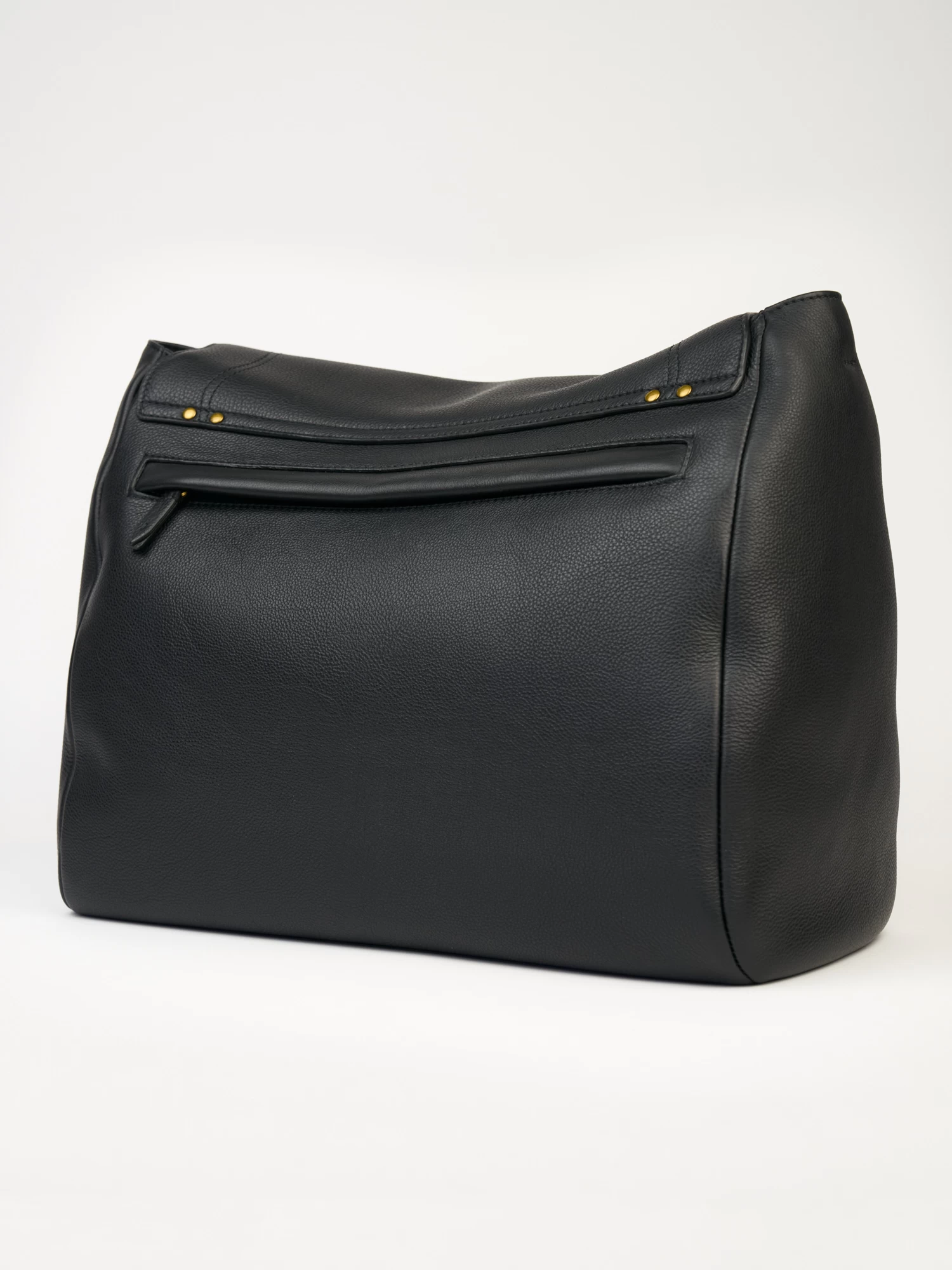 A messenger bag to wear over the shoulder or cross-body with a Wide-leg shoulder belt flap with snap button closure. It has one small pocket under the flap, one exterior zipped pocket, and one interior pocket.