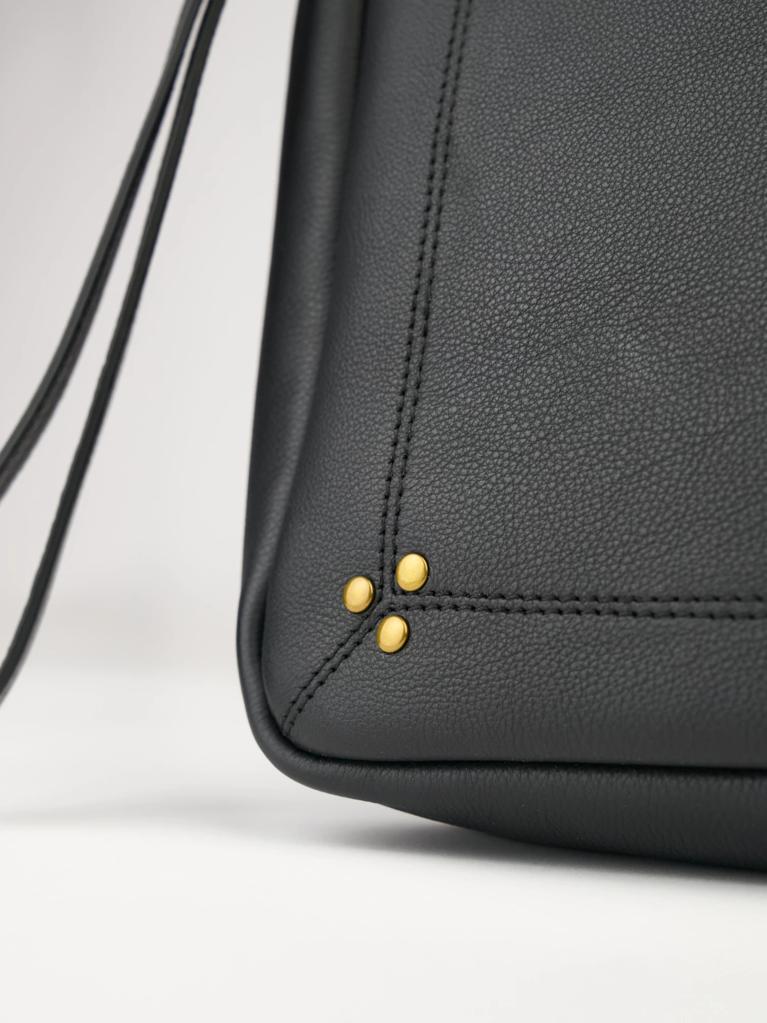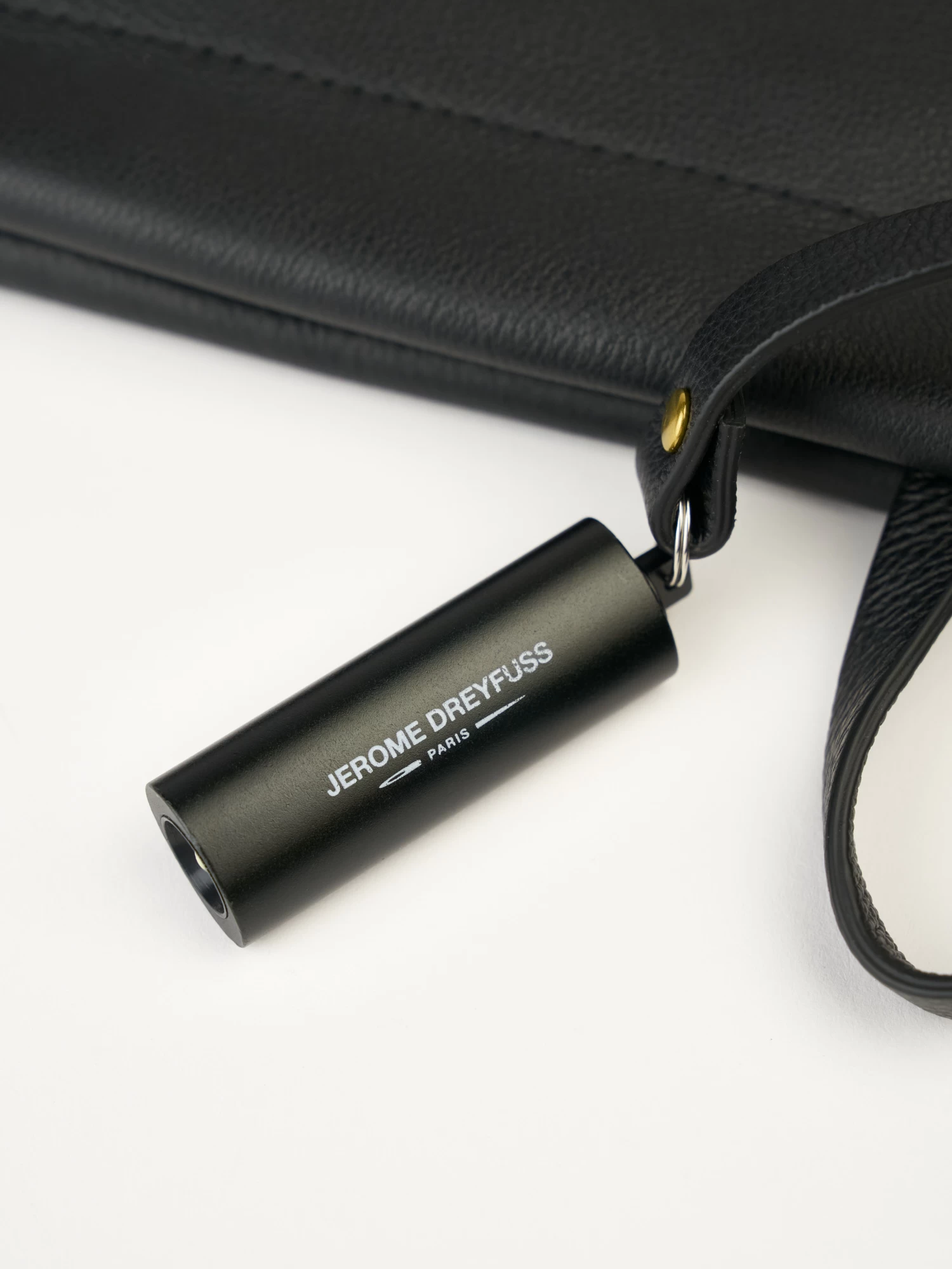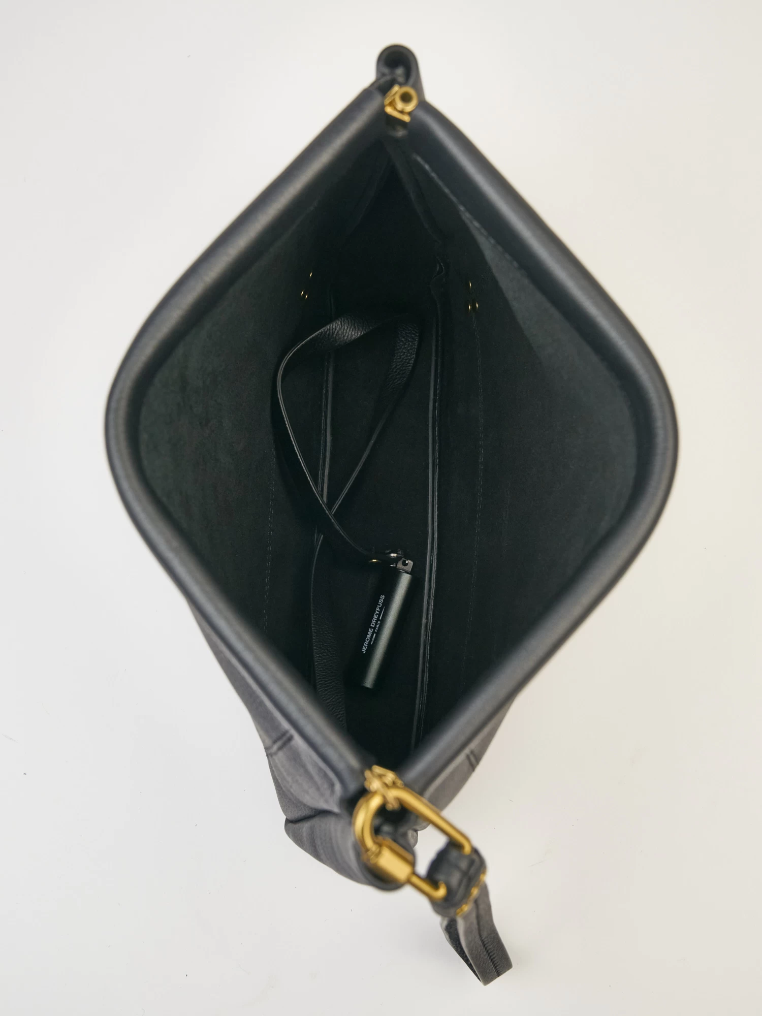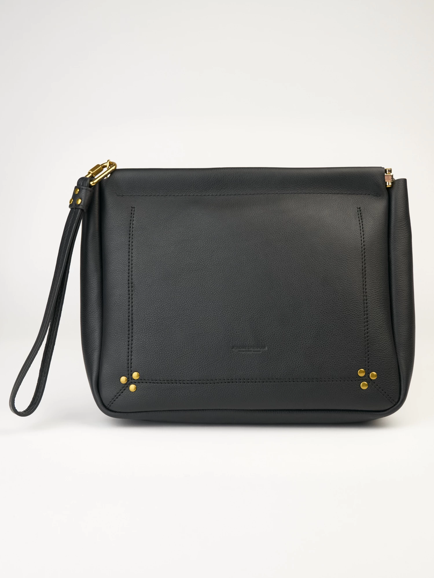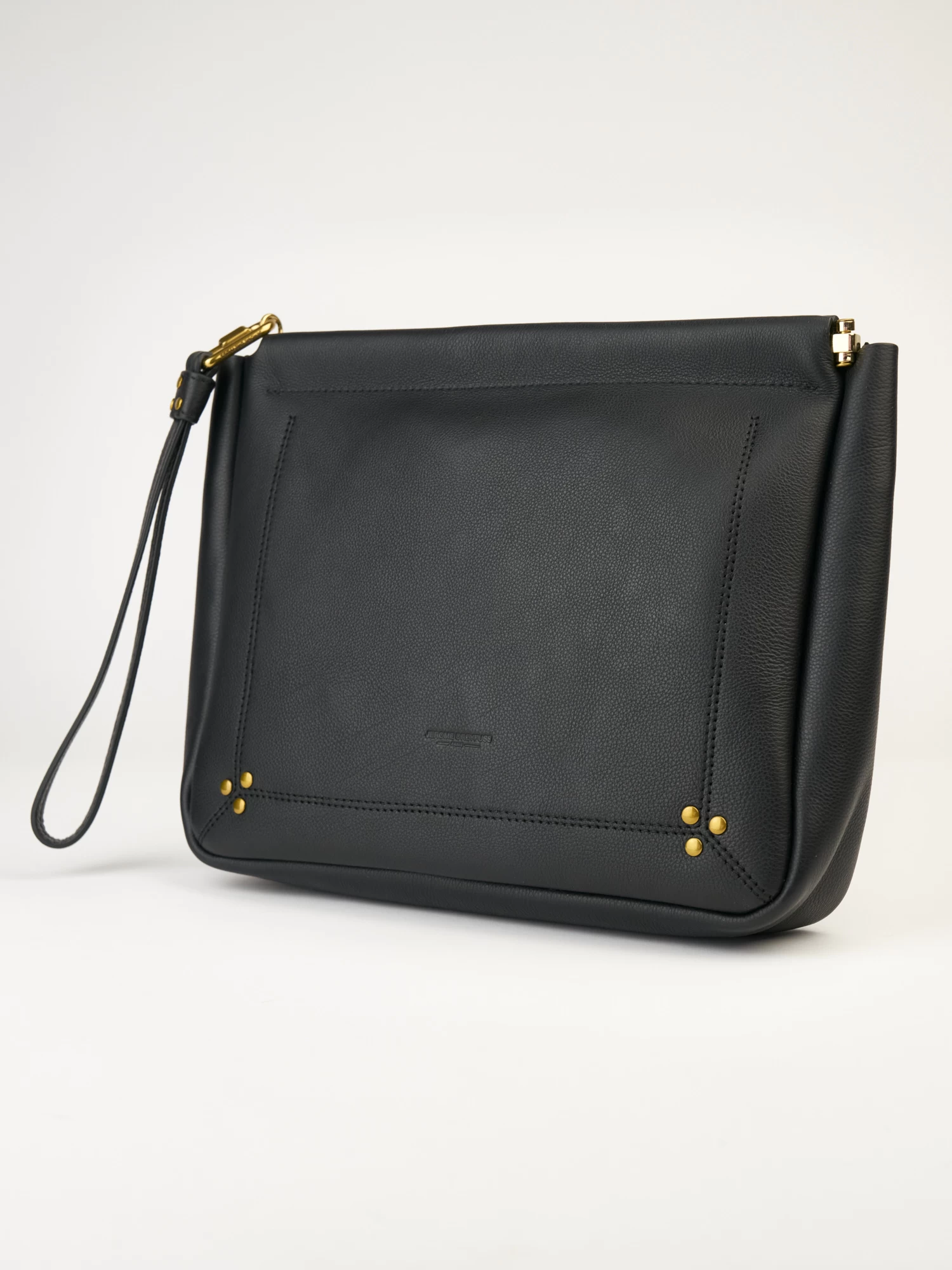 A coin pouch-inspired Noir Clic Clac clutch has a snap closure with a removable strap. Hand-held, or to slip into a large tote bag.