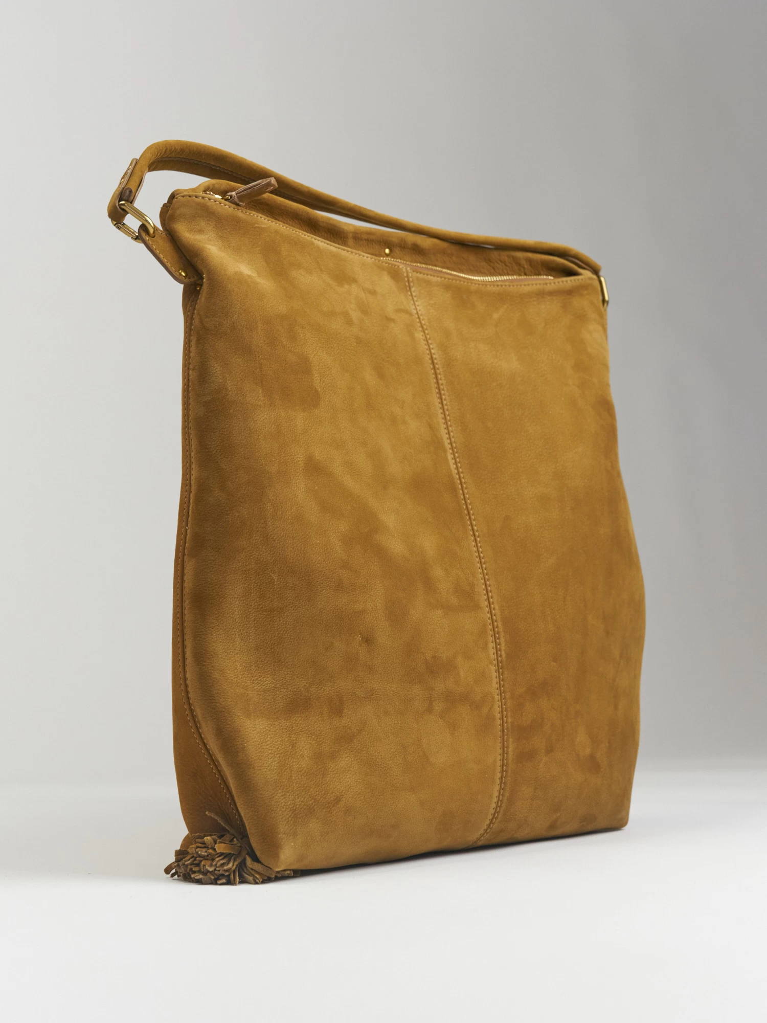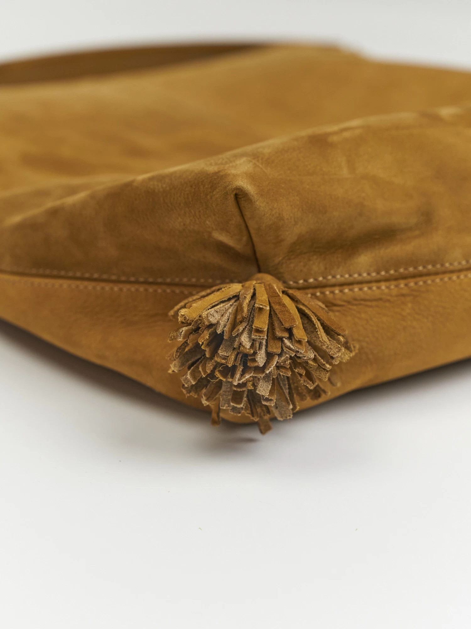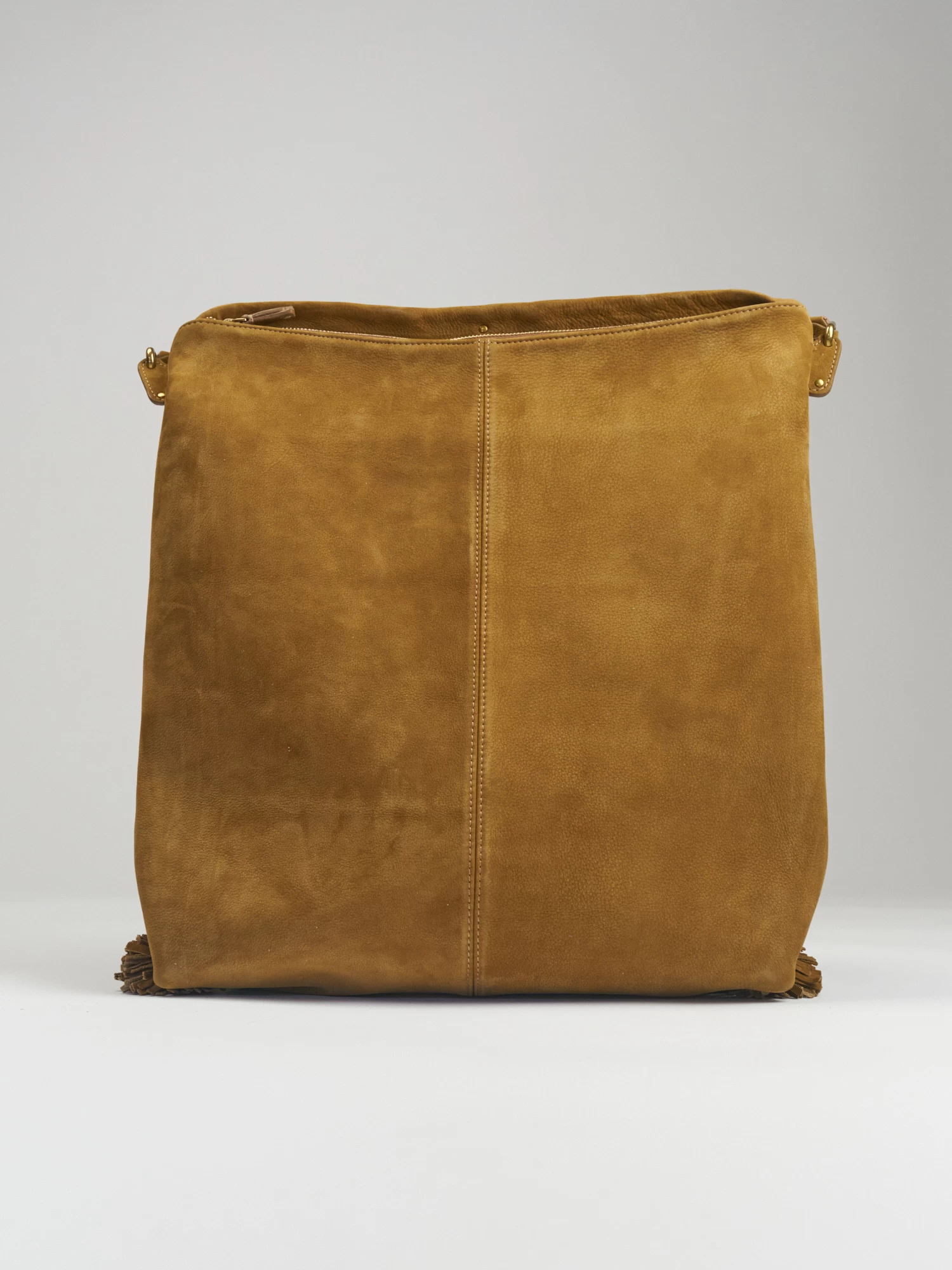 Zip-closing organized bag with a large compartment and a patch pocket. Tassels on the bottom corners of the bag
