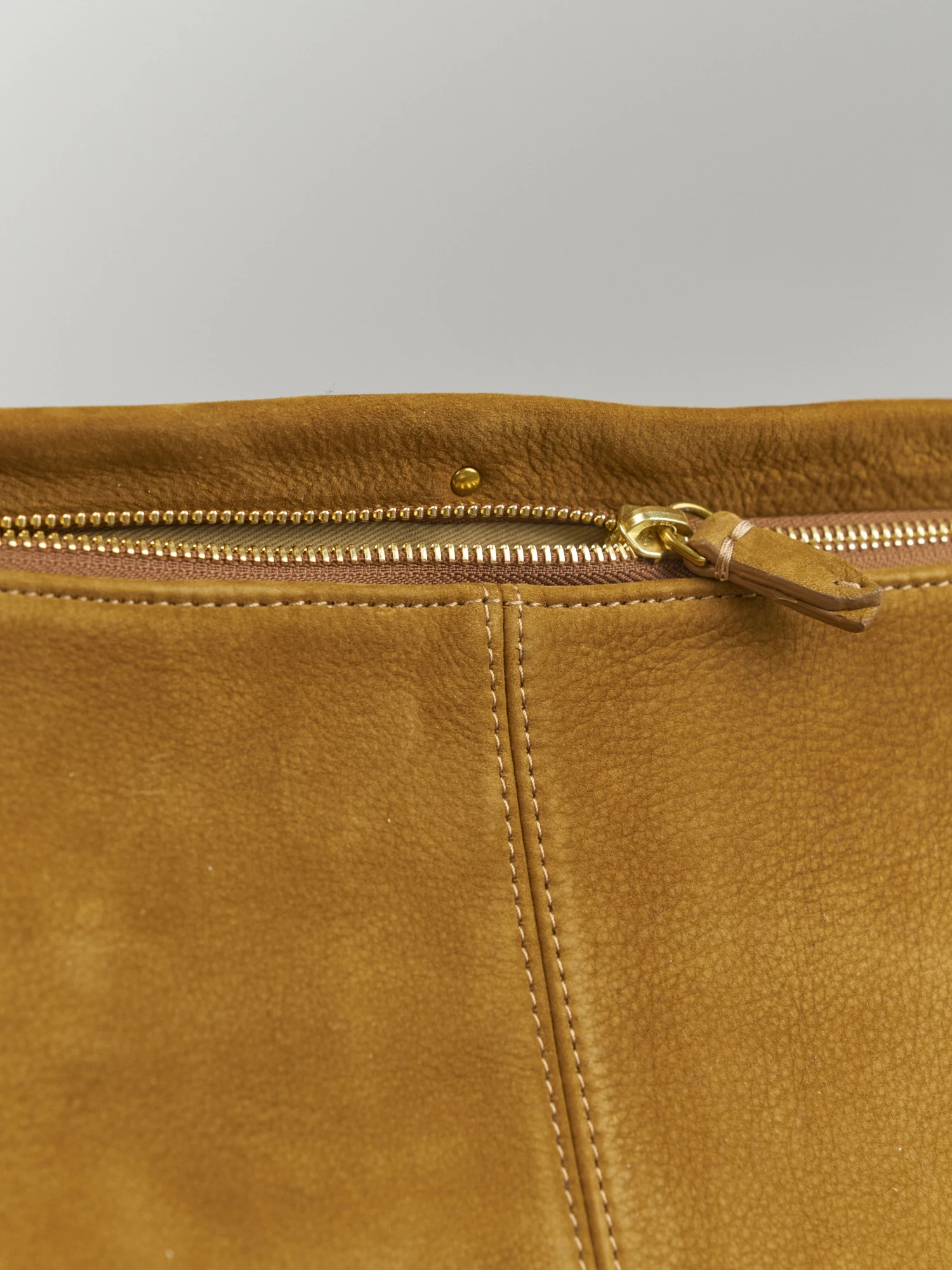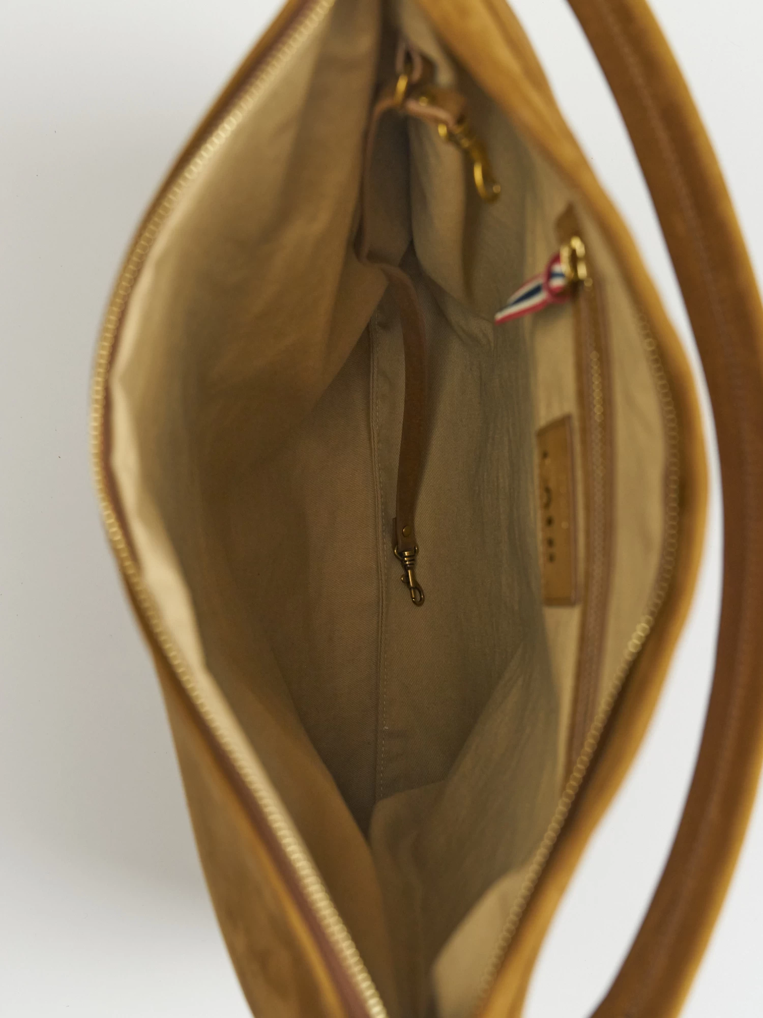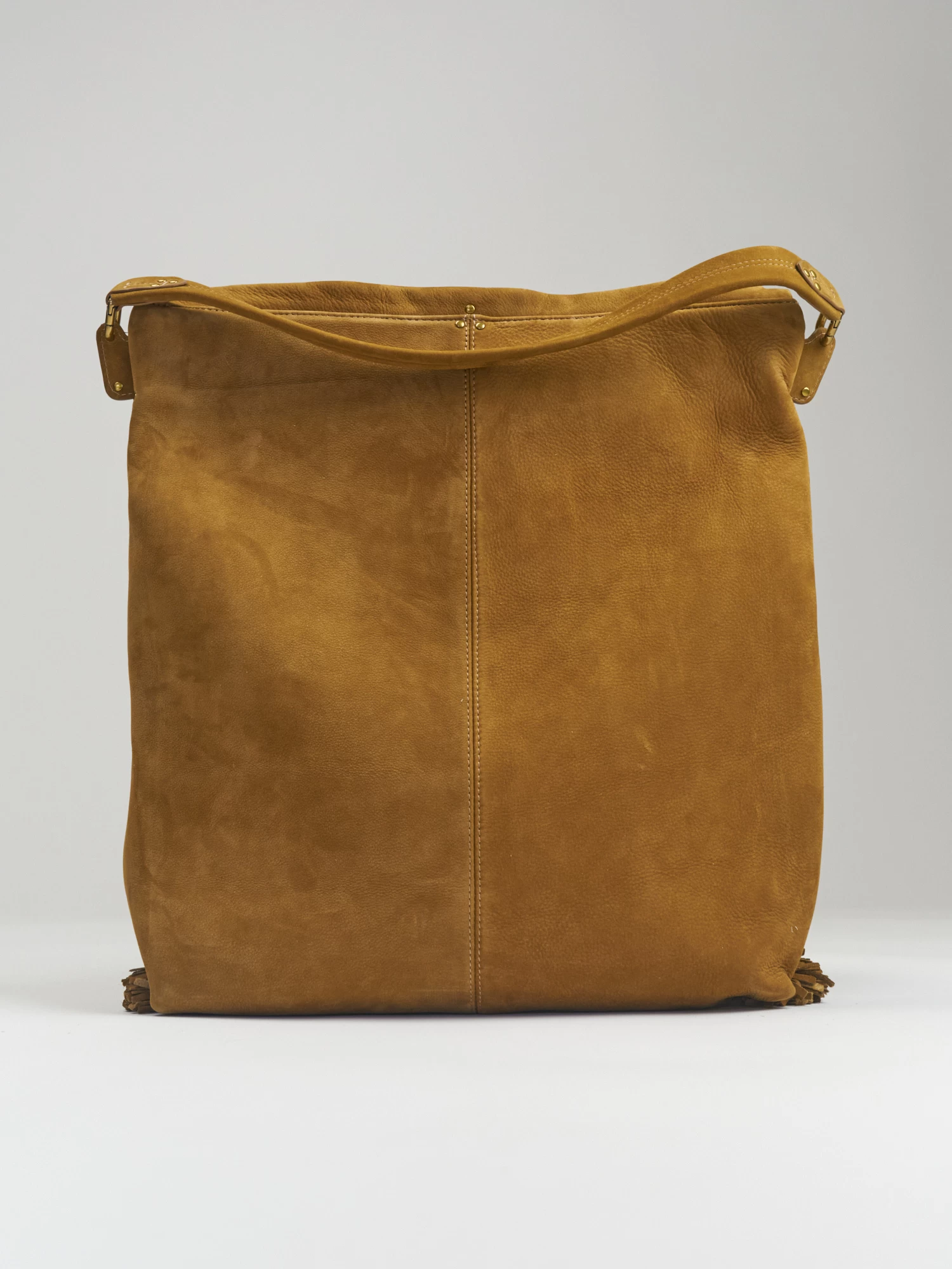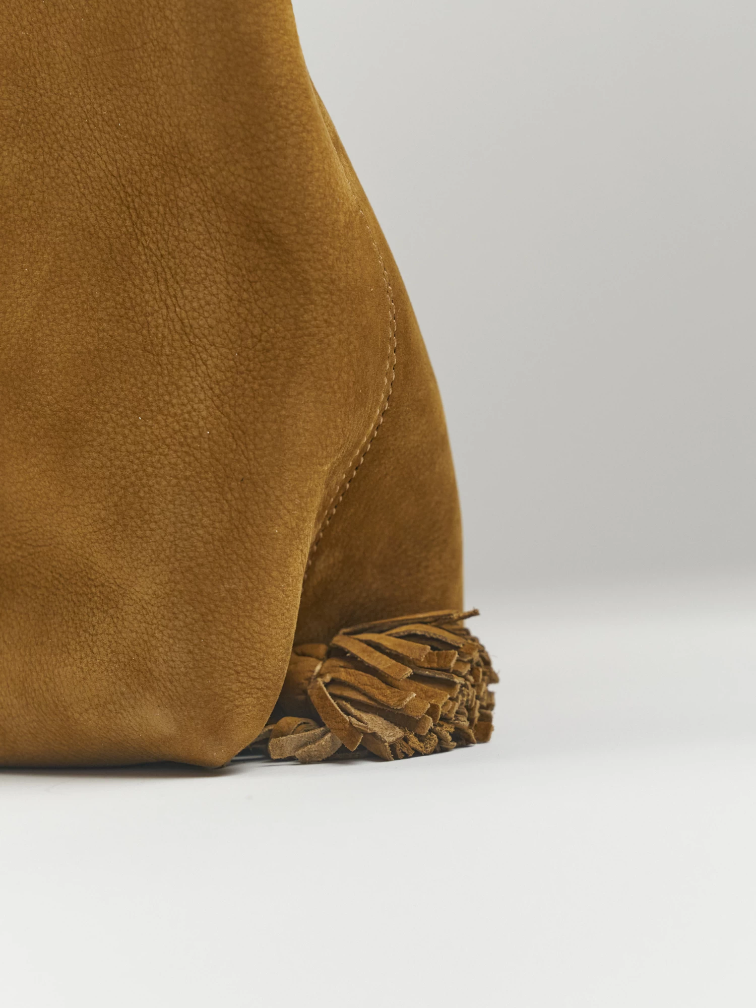 Zip-closing organized bag with a large compartment and a patch pocket. Tassels on the bottom corners of the bag