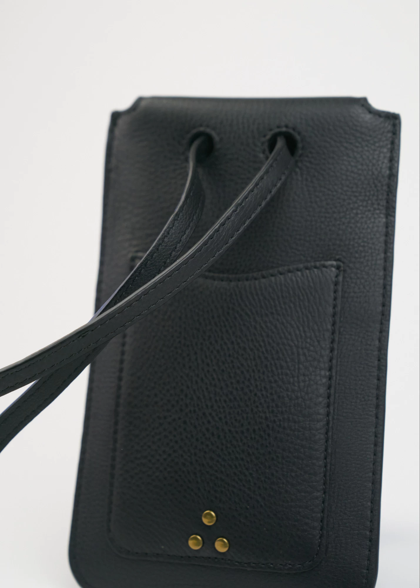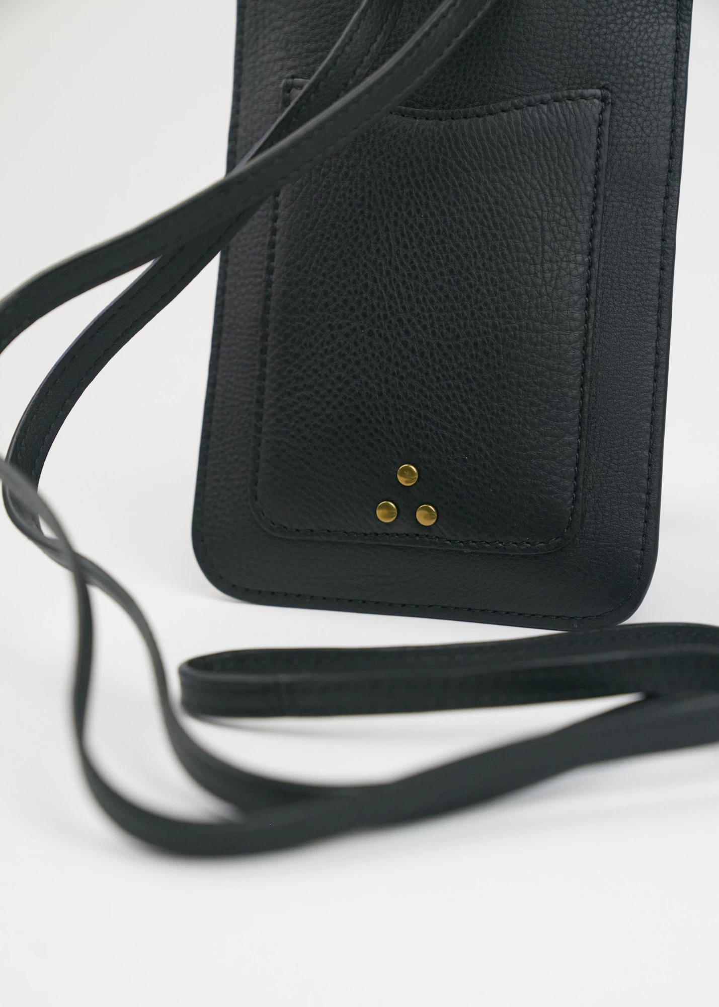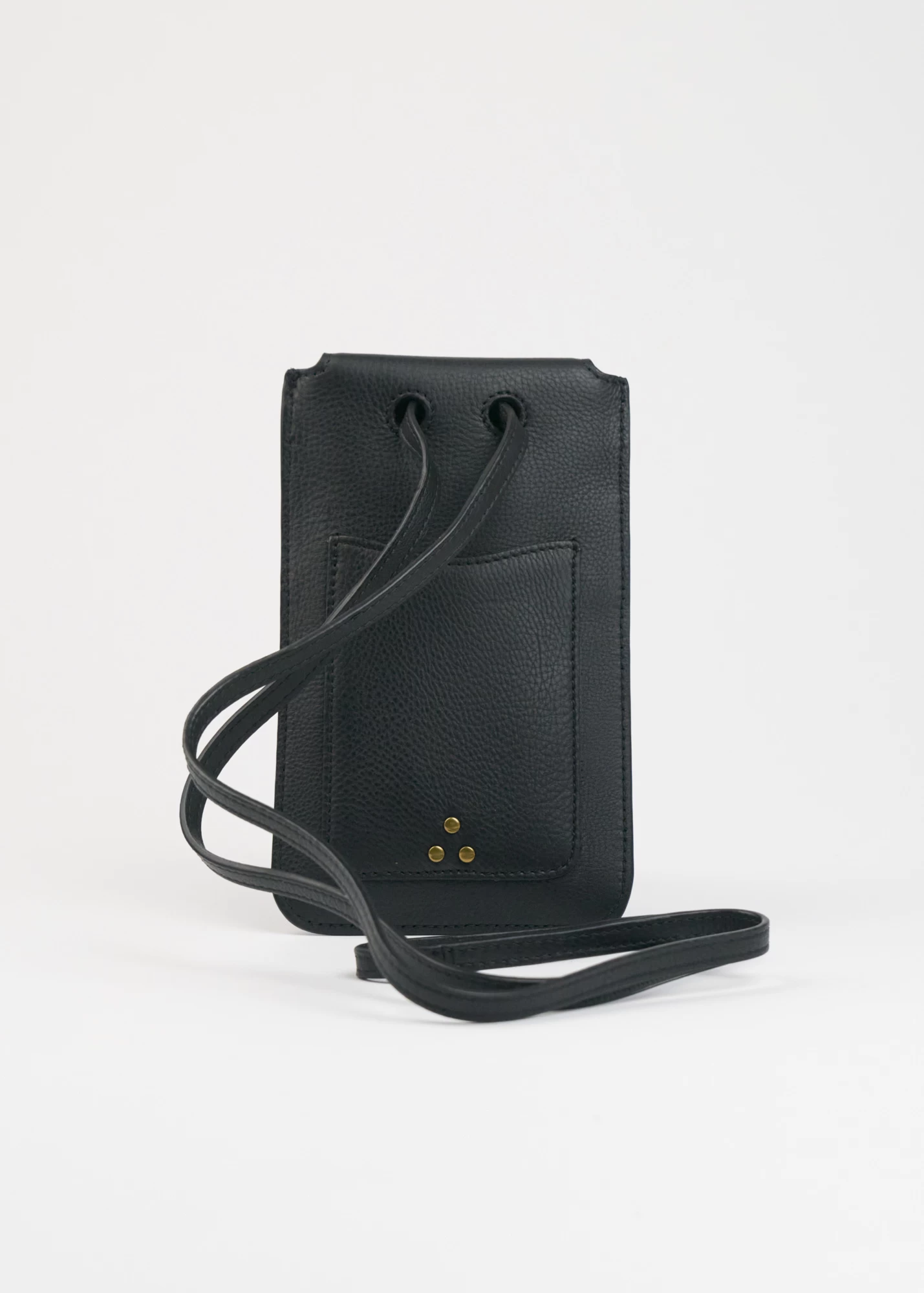 Phone case with cross-body leather shoulder strap. One external patch pocket.