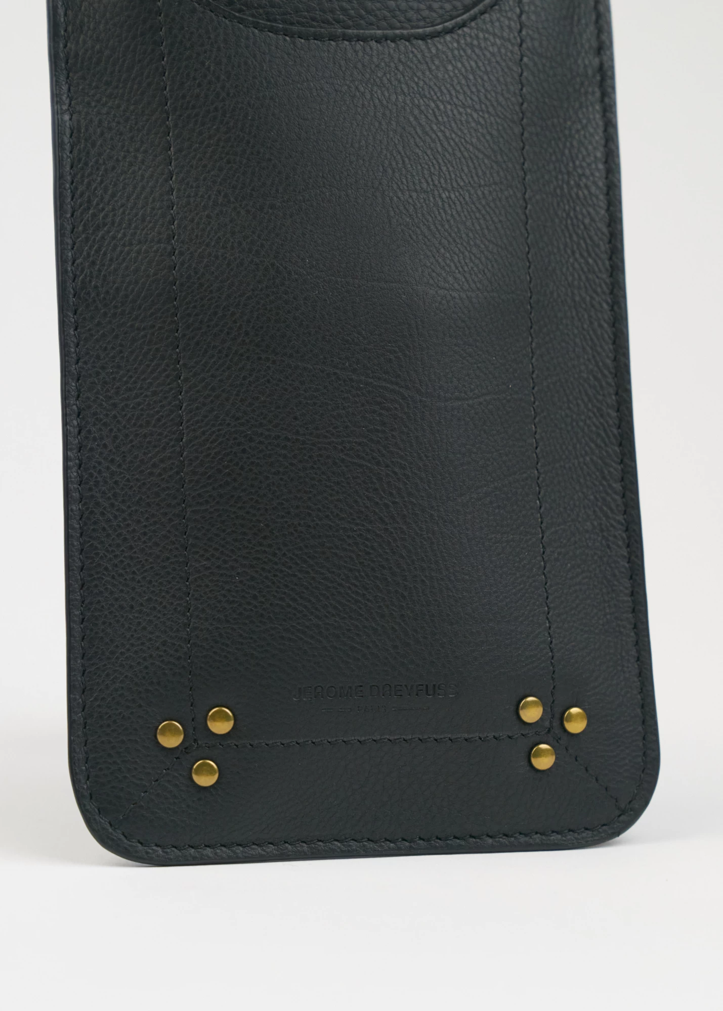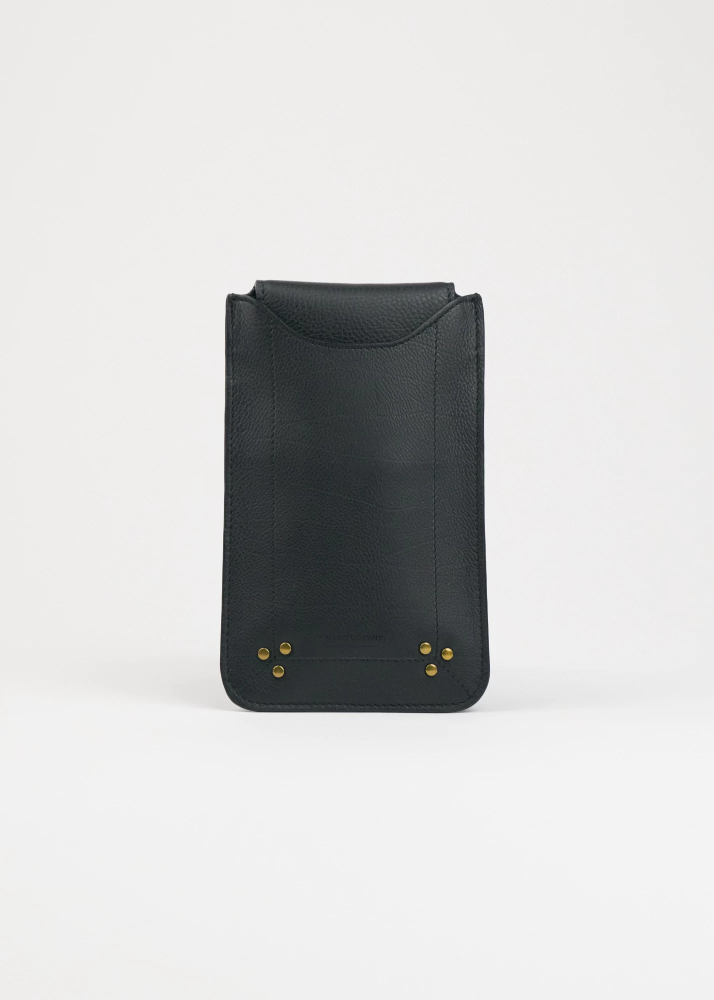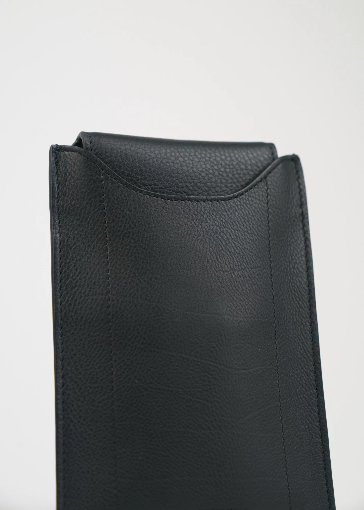Phone case with cross-body leather shoulder strap. One external patch pocket.