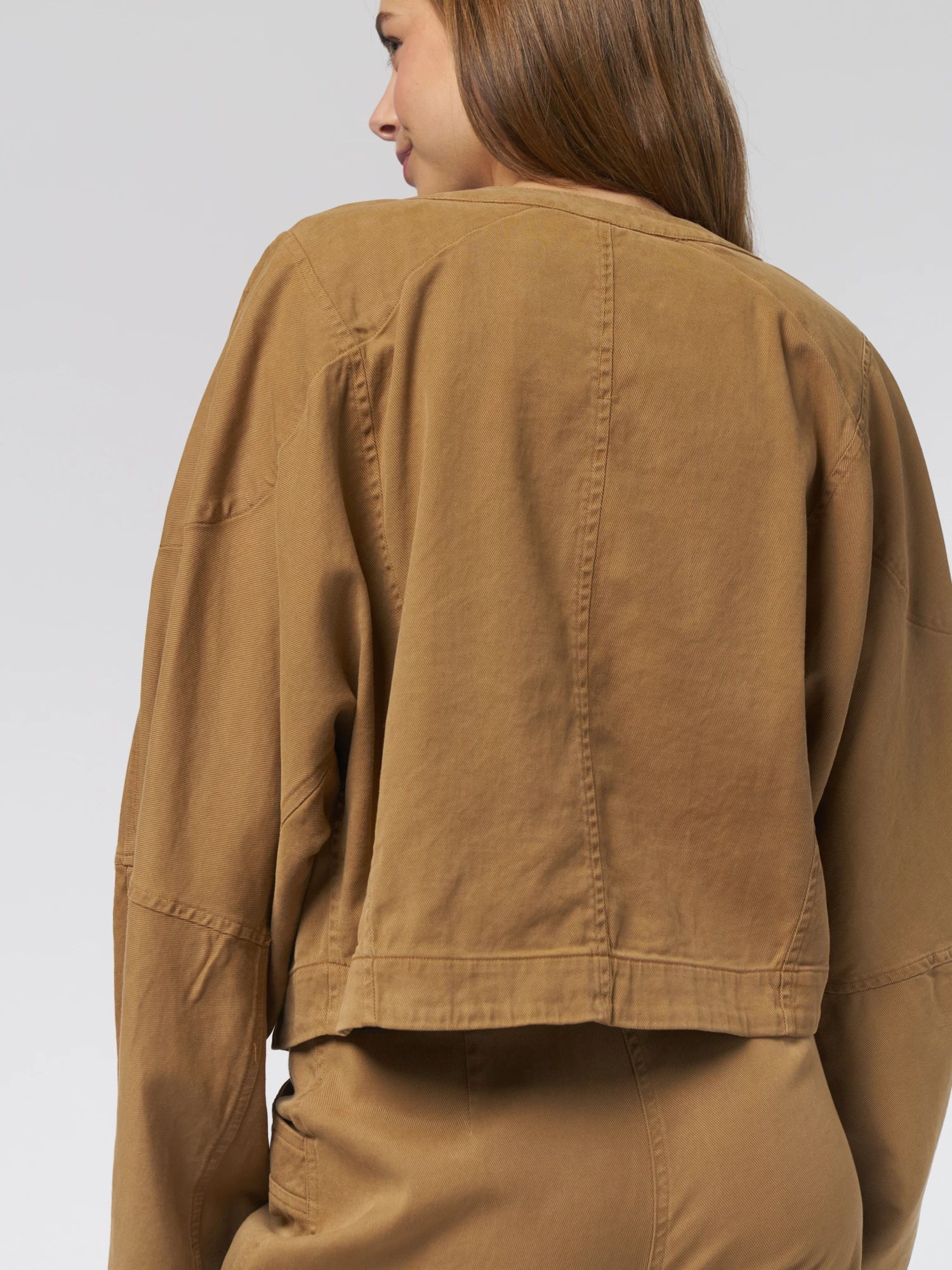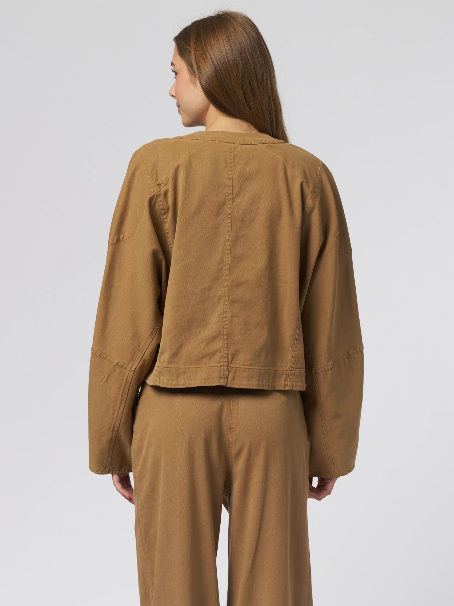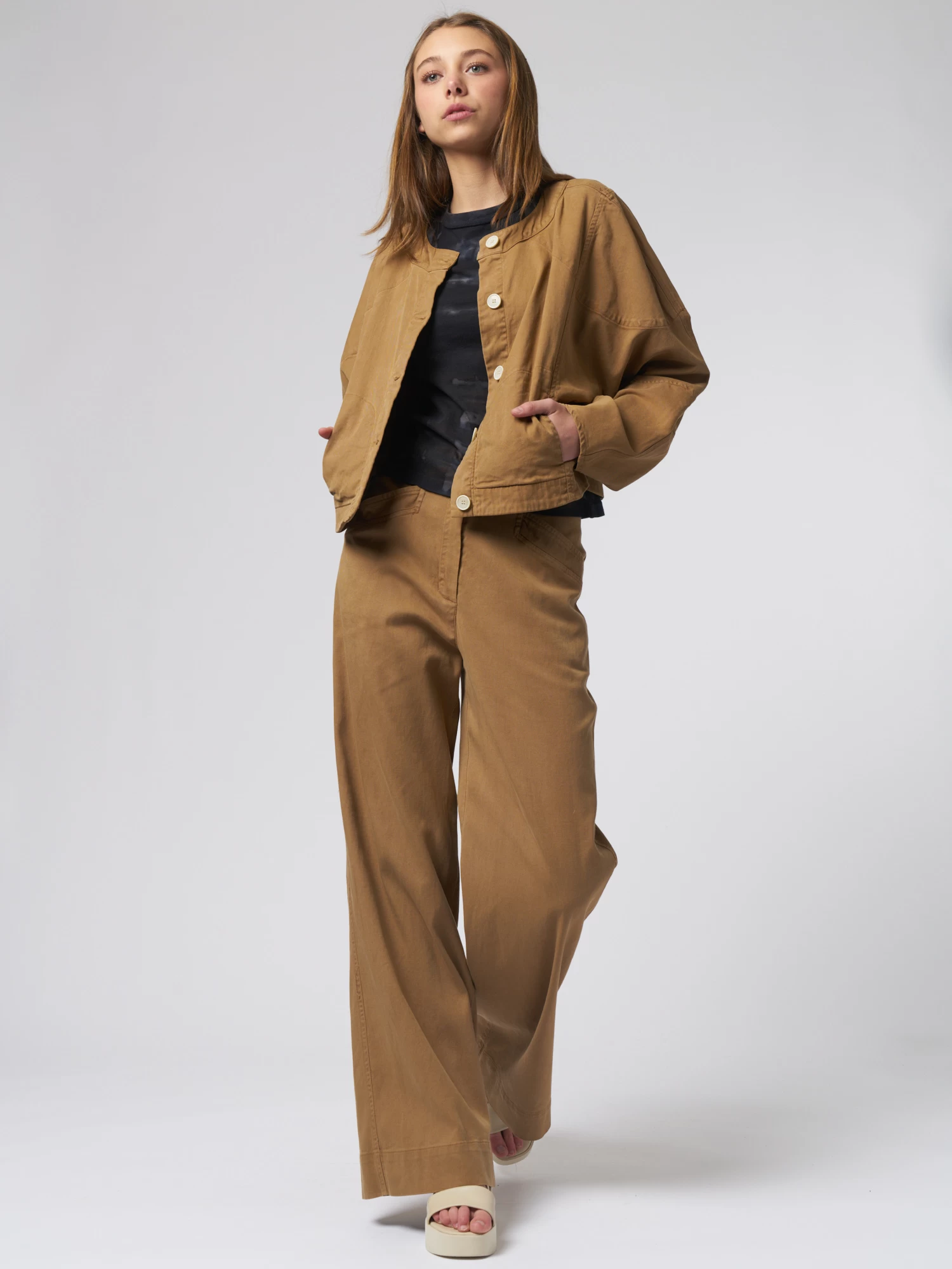 The casual silhouette features side seam pockets and the unstructured fit crops at the waist.