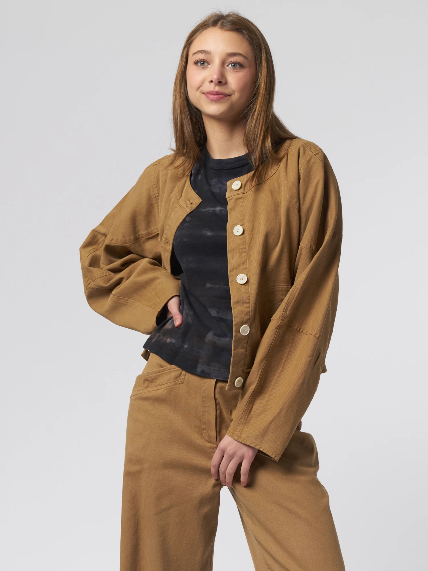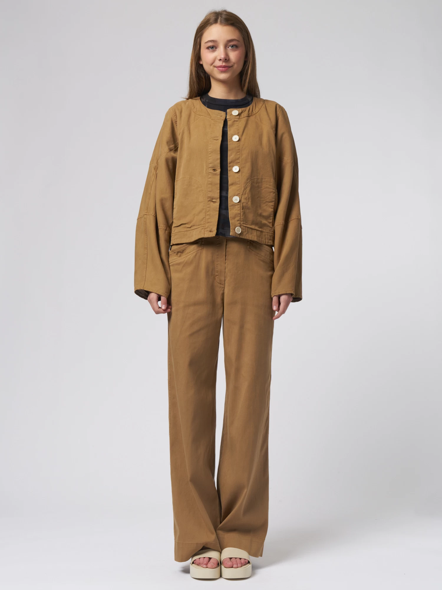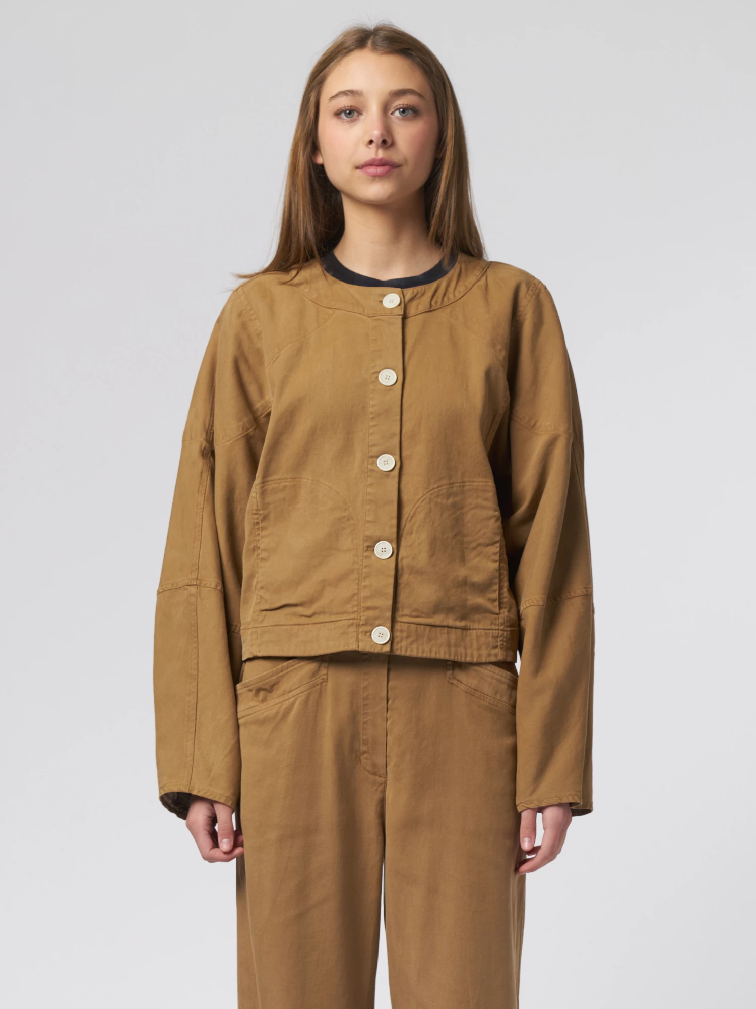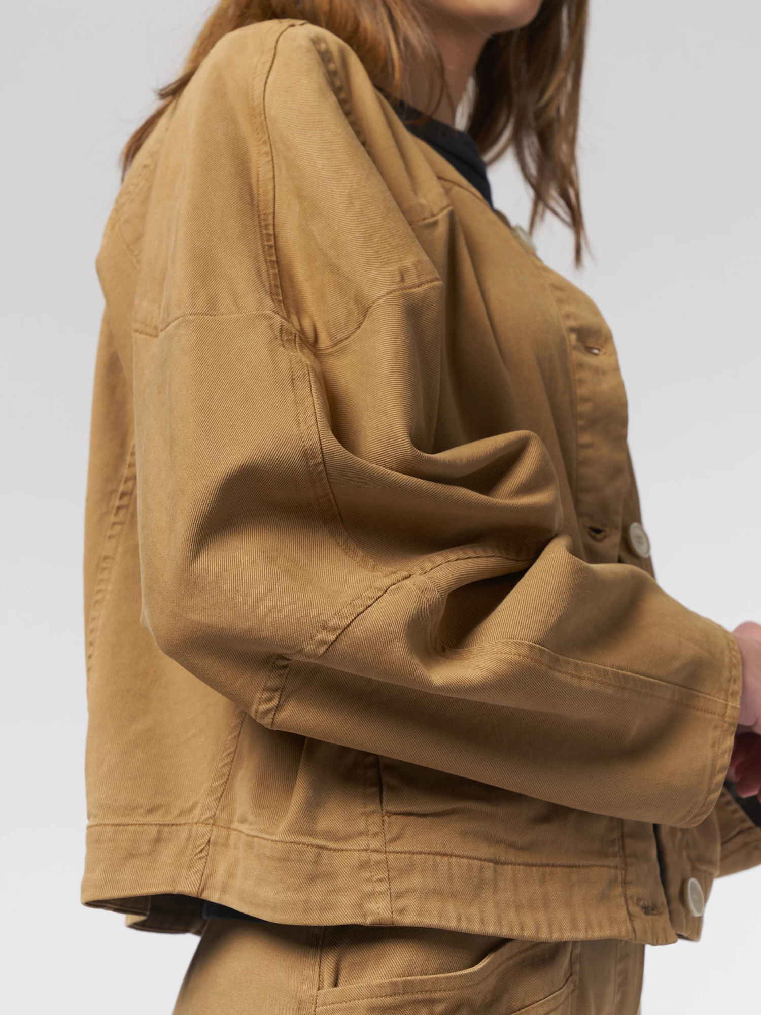 The casual silhouette features side seam pockets and the unstructured fit crops at the waist.