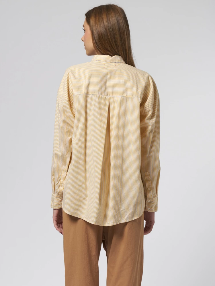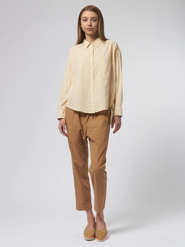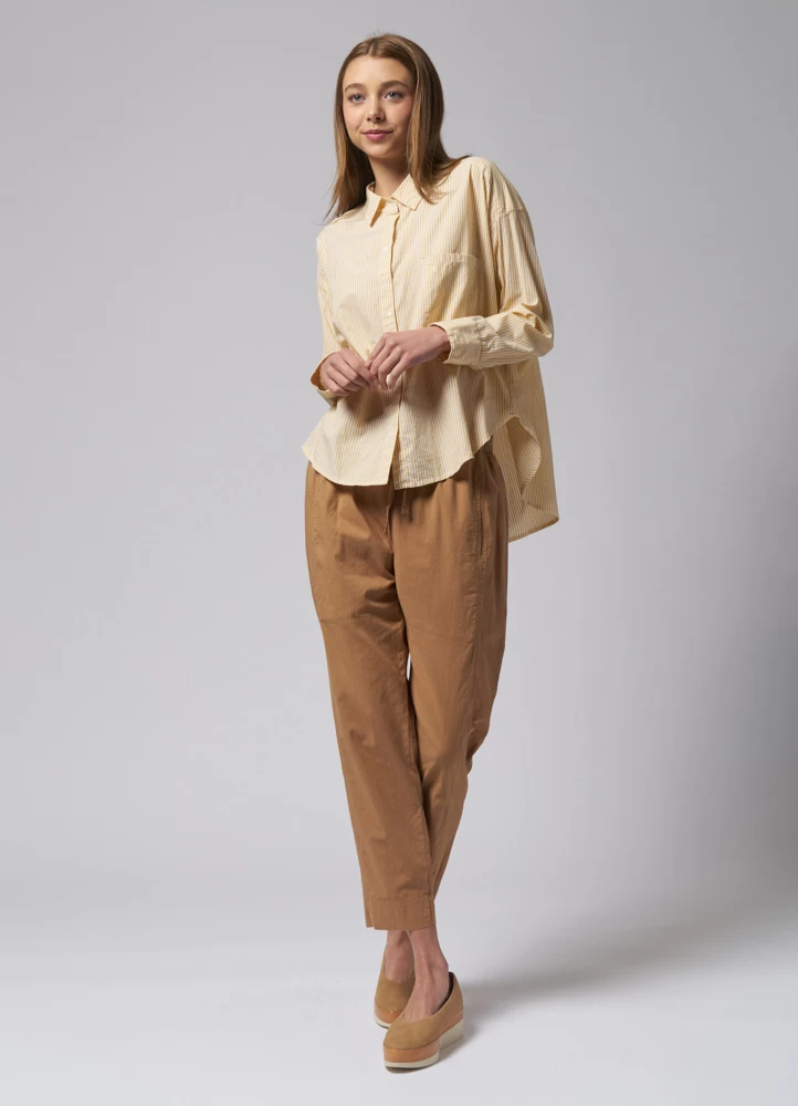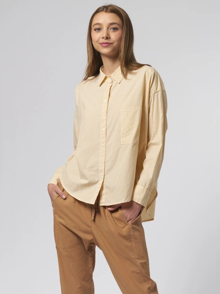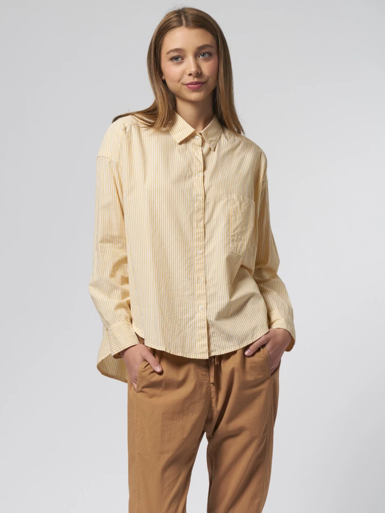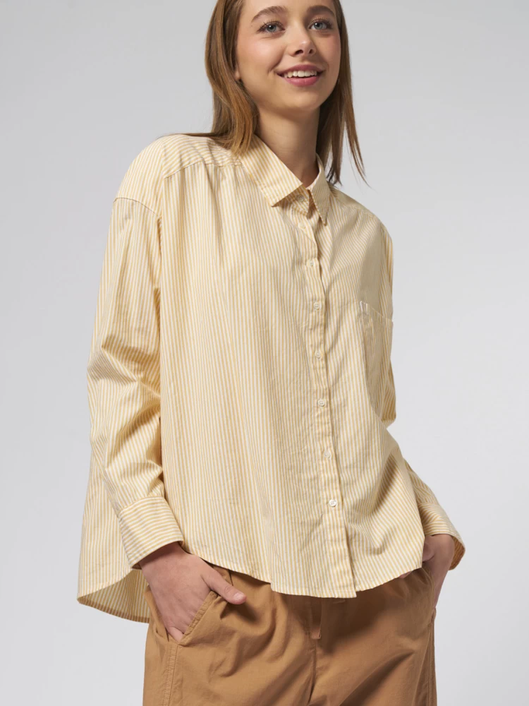 Crisp cotton pencil stripe button-front shirt with a boxy fit, left chest pocket, and high low shirttail hem.