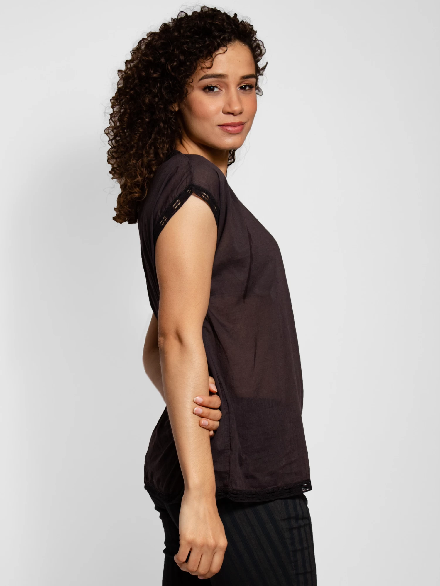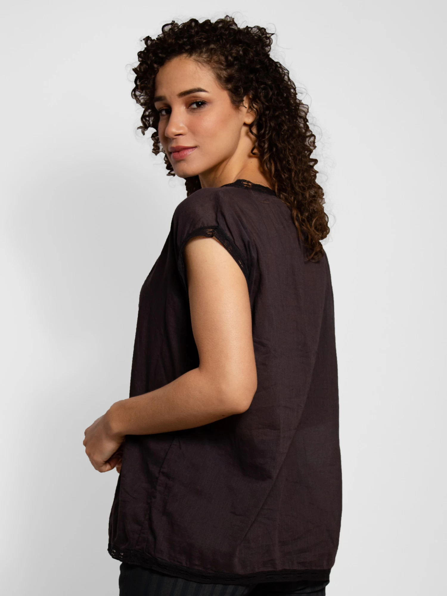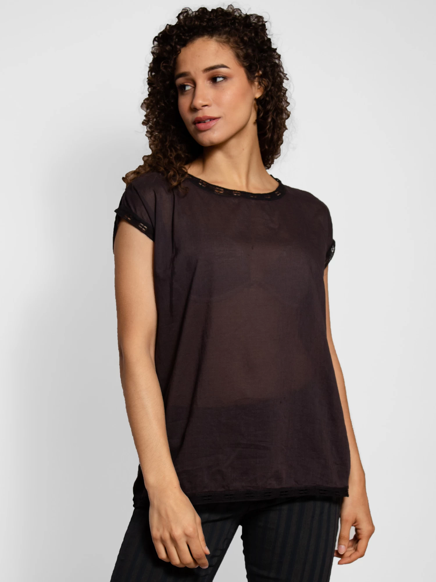Boat Neck black cotton top with drop sleeves in cotton lace finish.