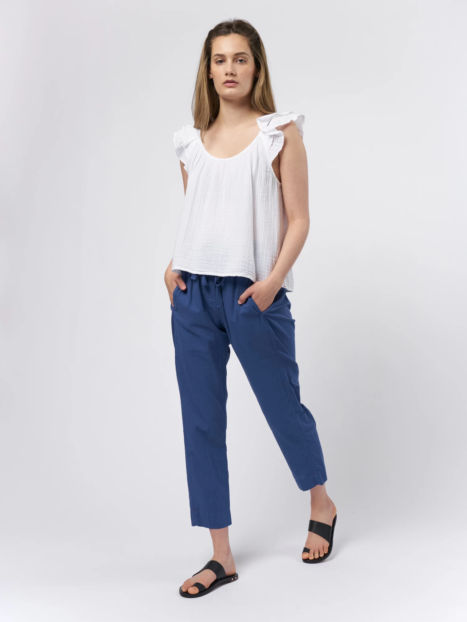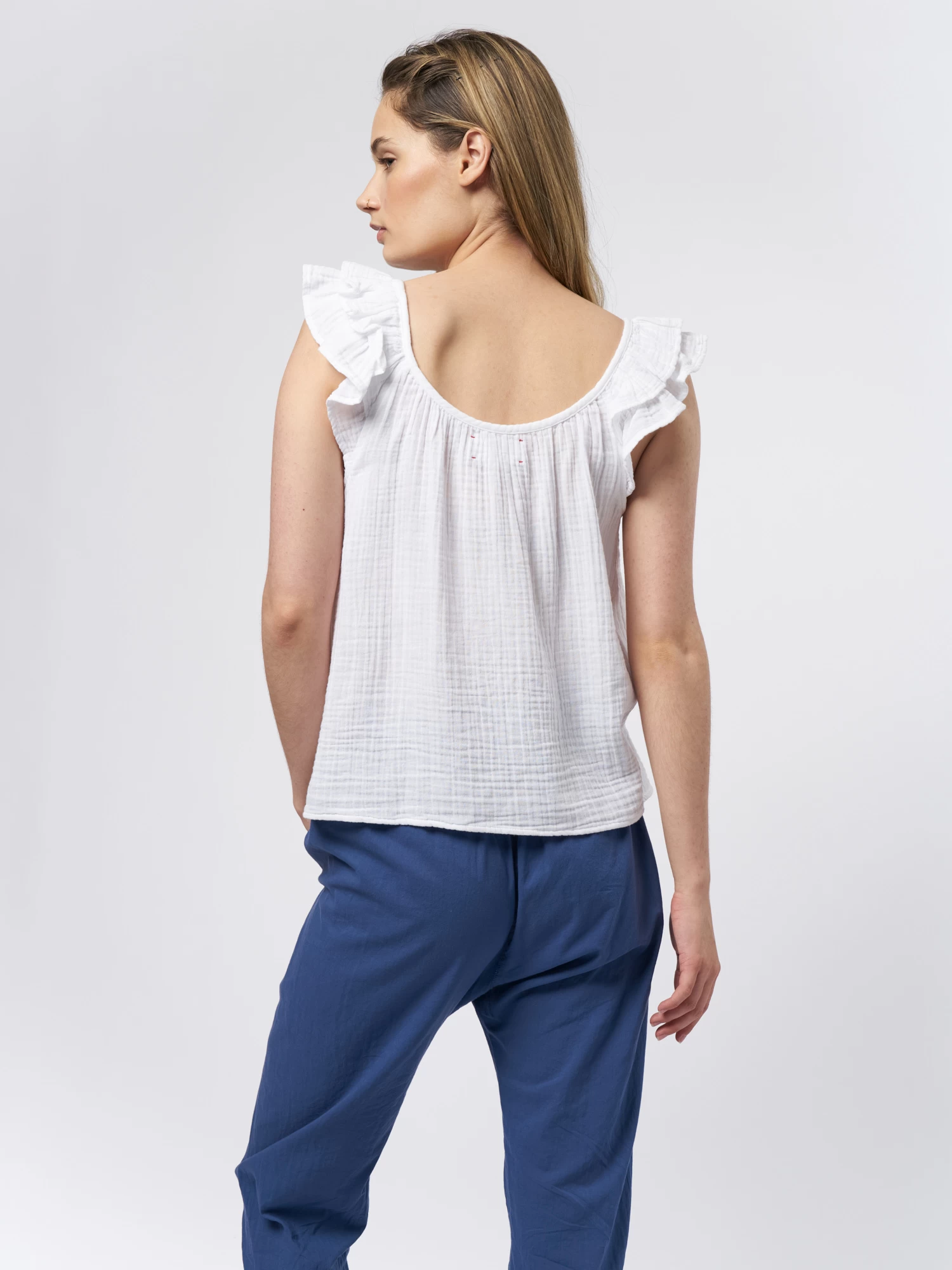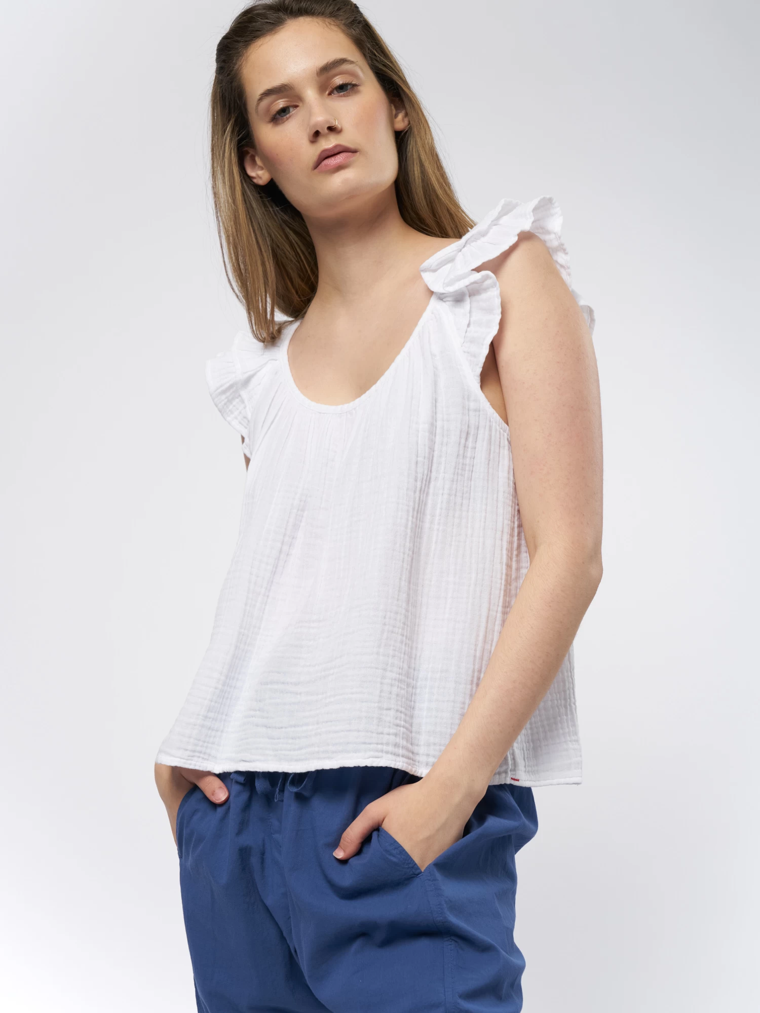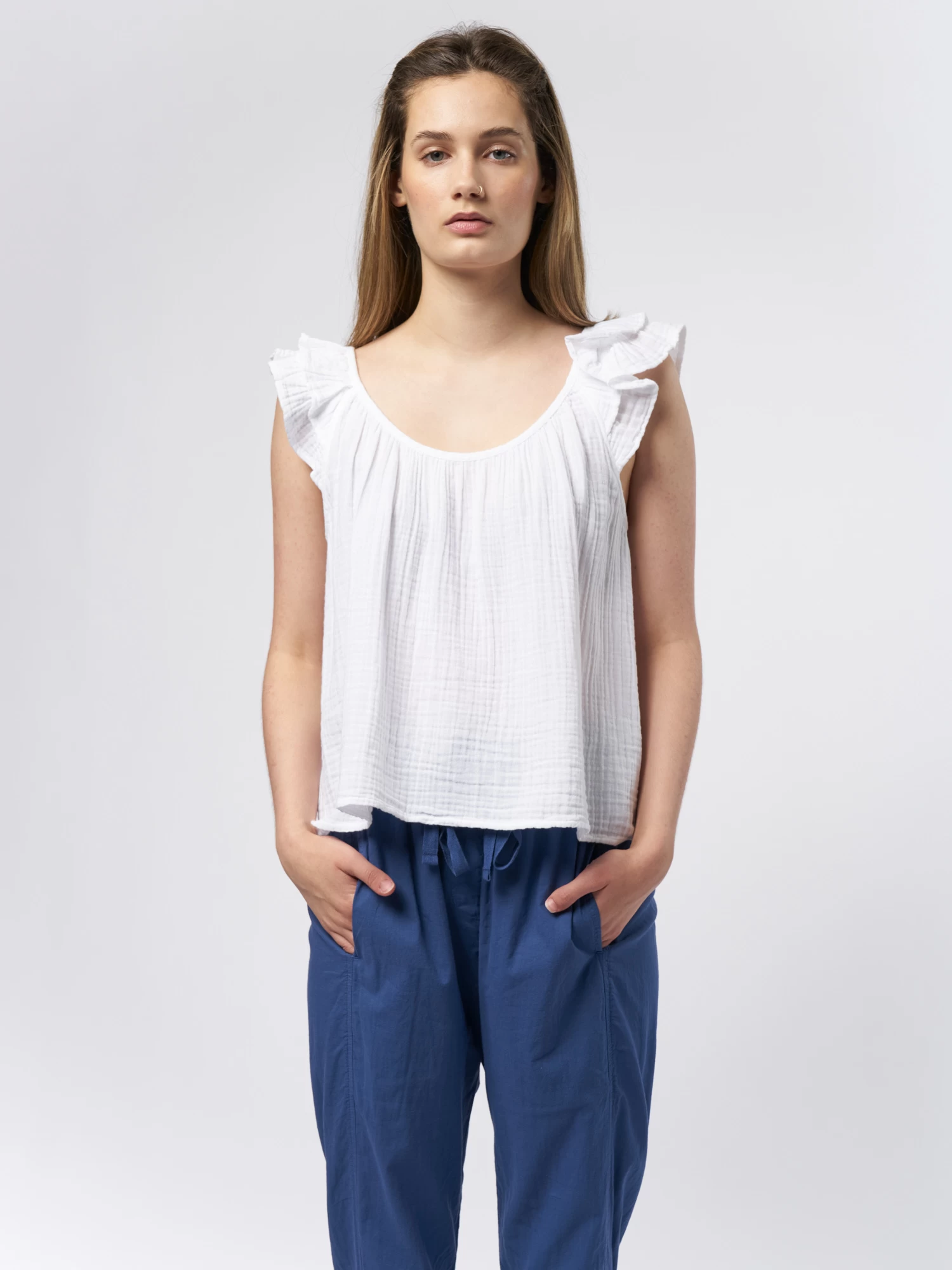 An easy tank top in Chelsea Gauze with a scoop neck, flutter sleeves, and a relaxed fit.