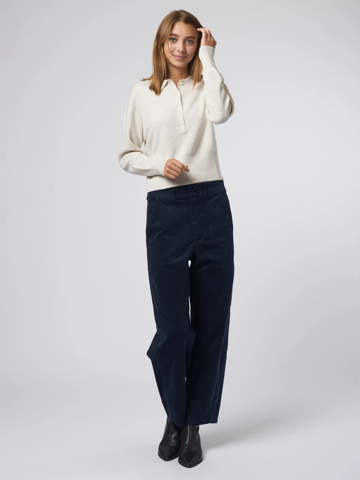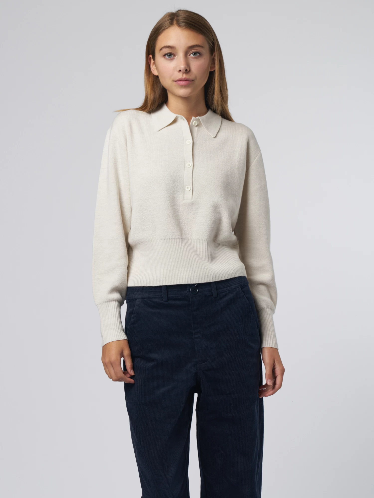An easy fit and super soft merino wool sweater has a collar, a placket with four button closures, a ribbed hem