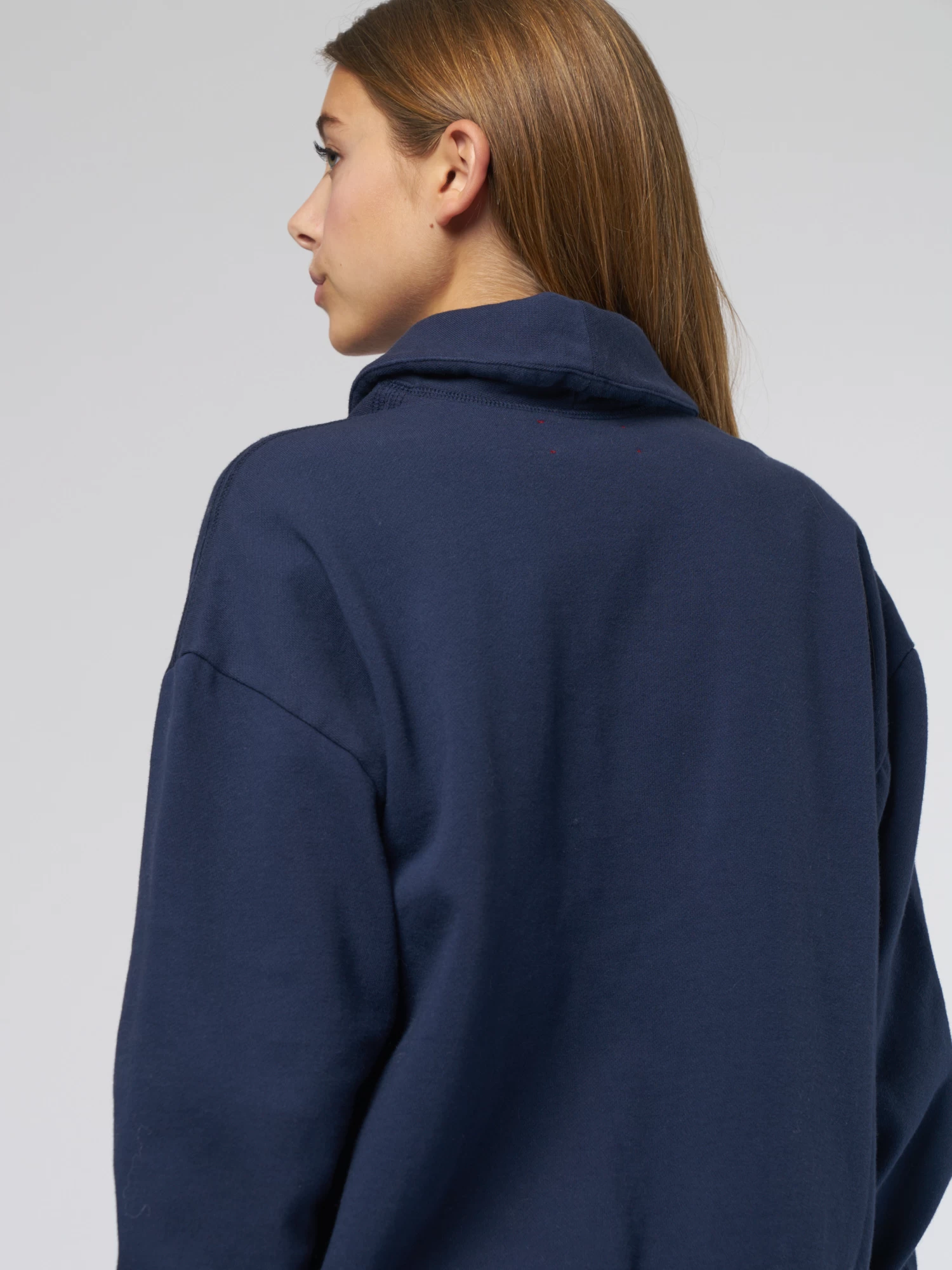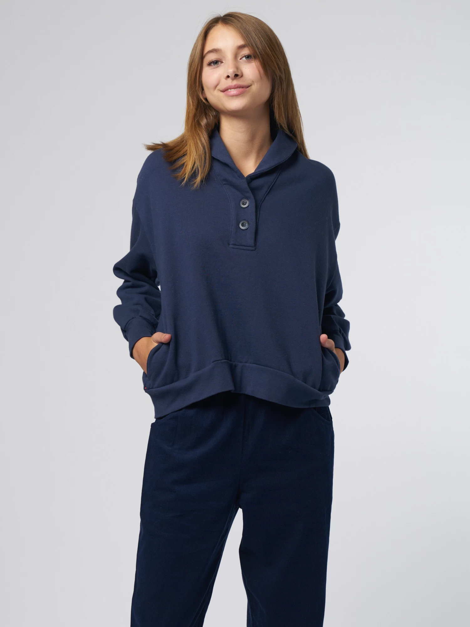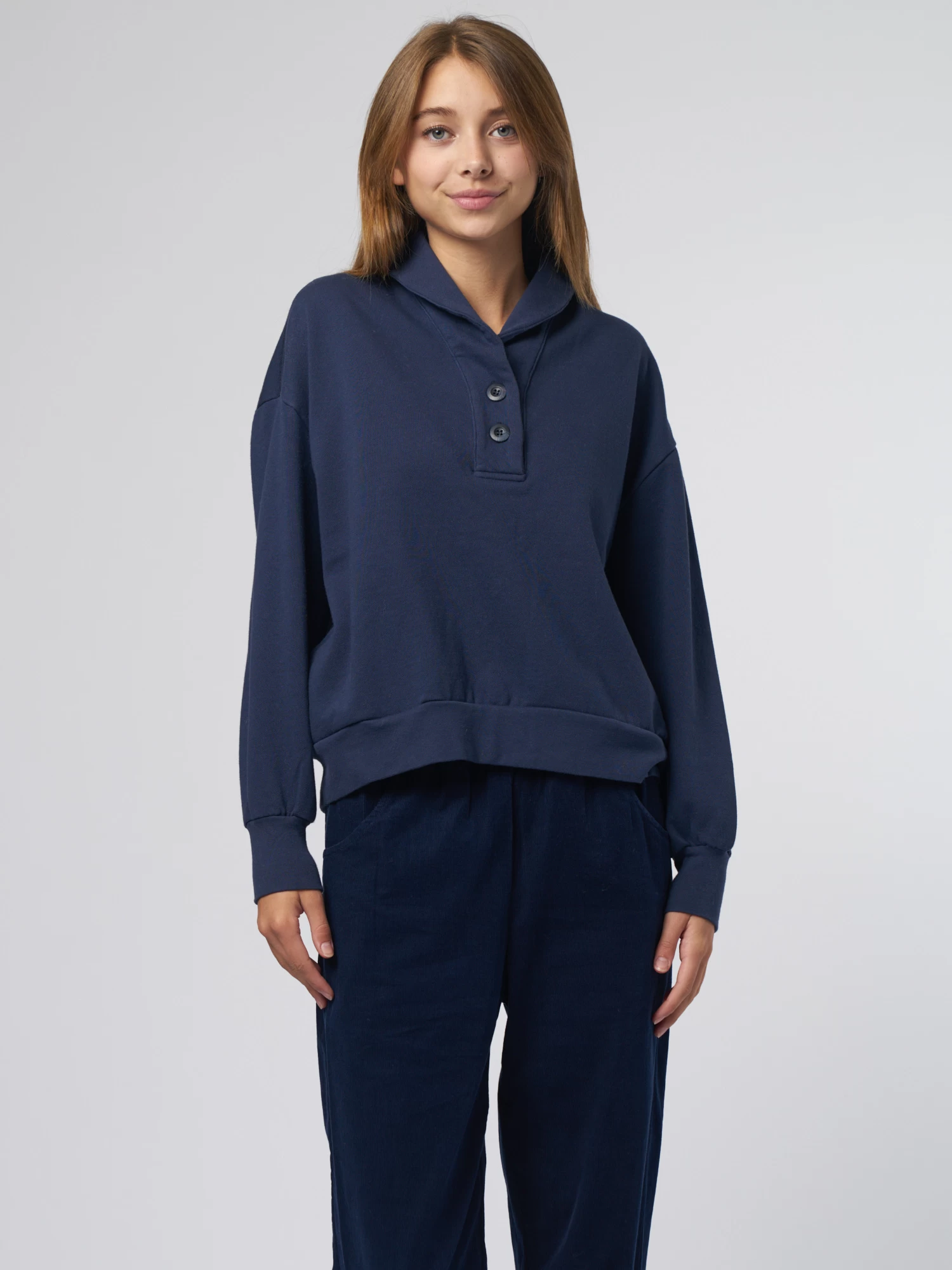 A vintage-inspired sweatshirt has a shawl collar and dropped shoulder,