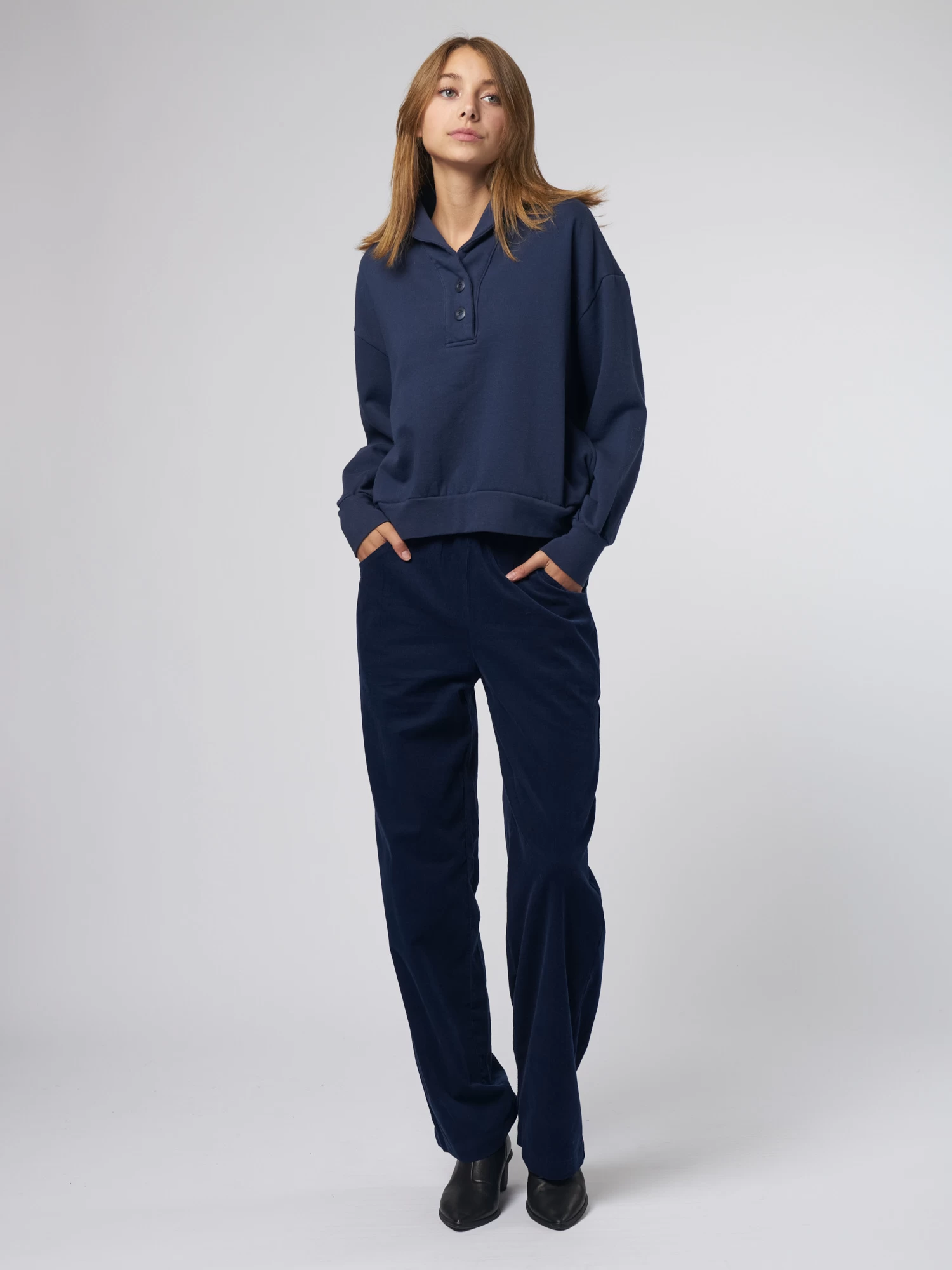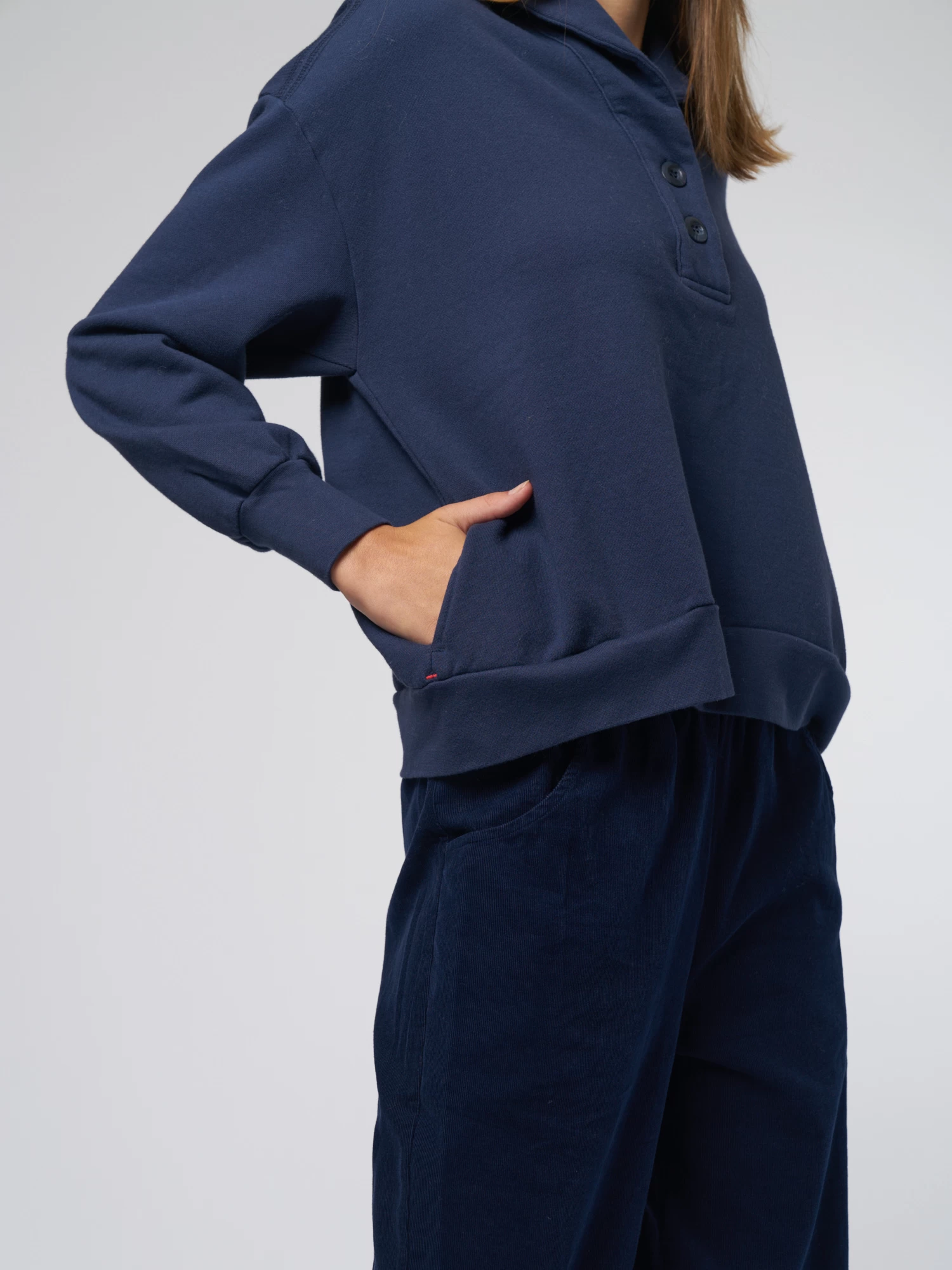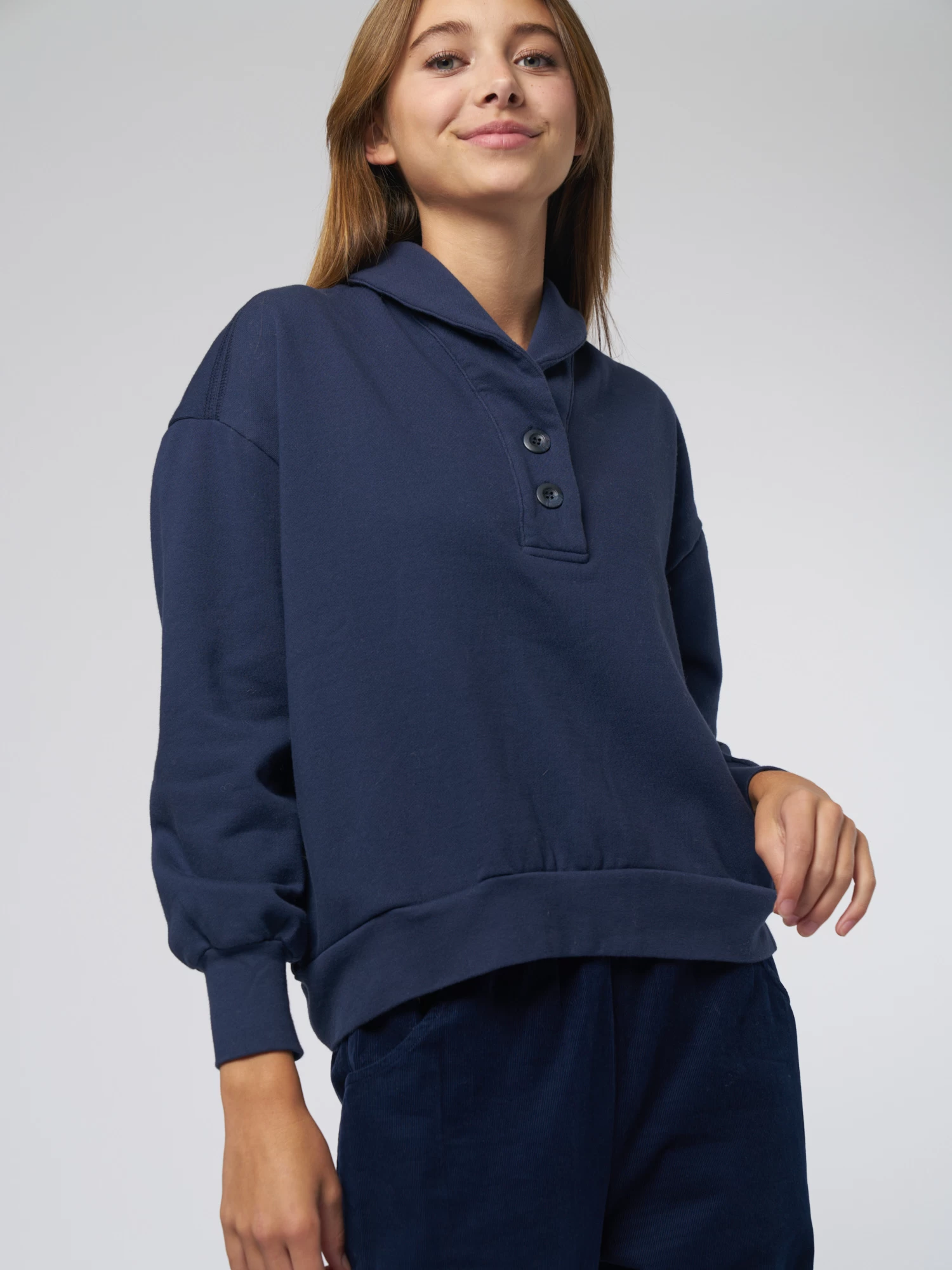 A vintage-inspired sweatshirt has a shawl collar and dropped shoulder,