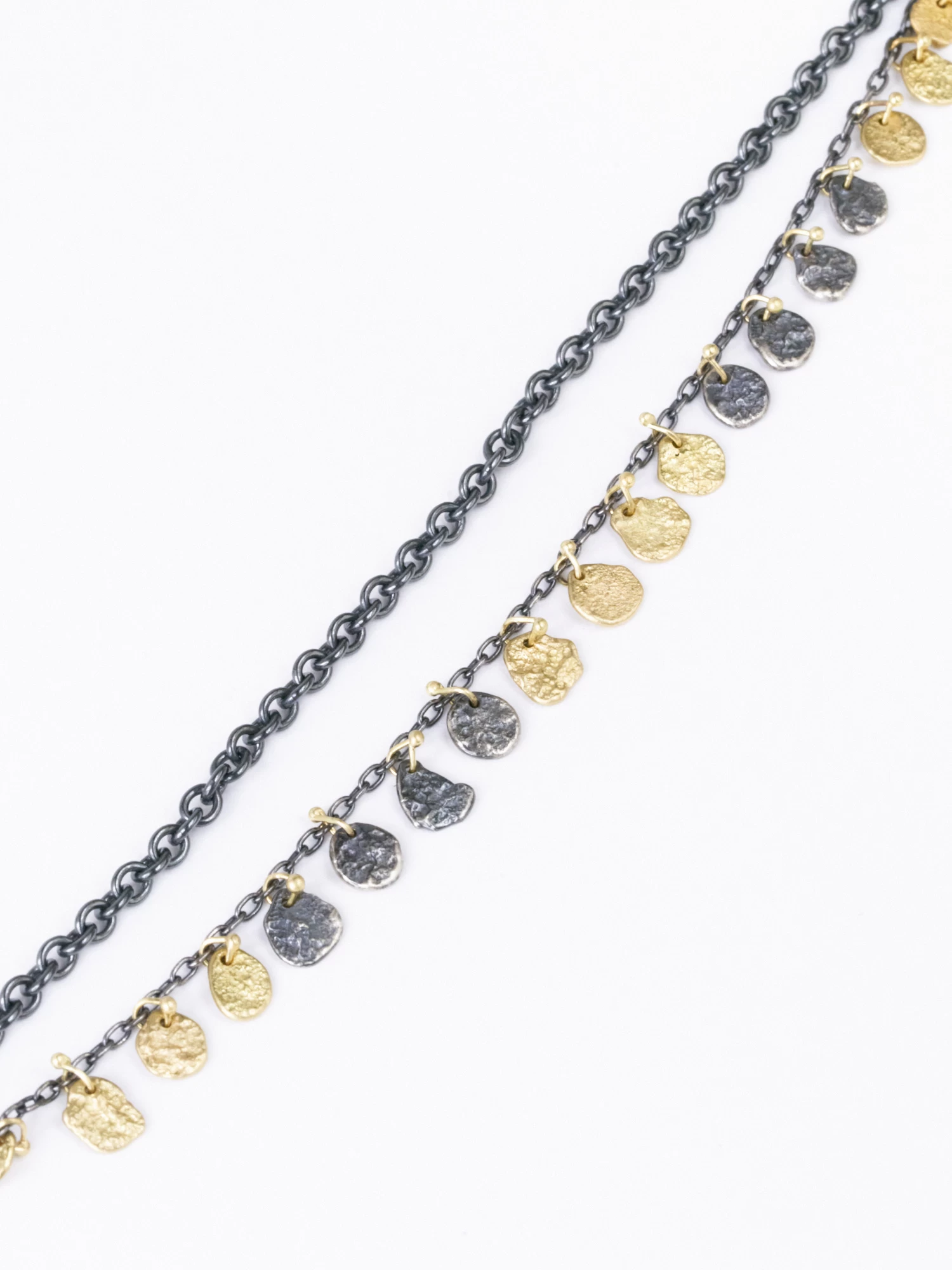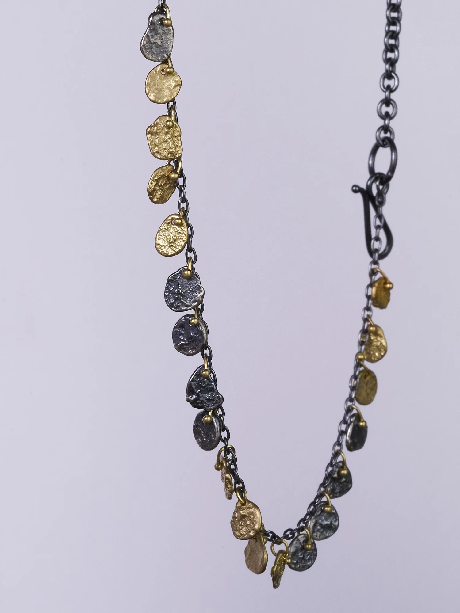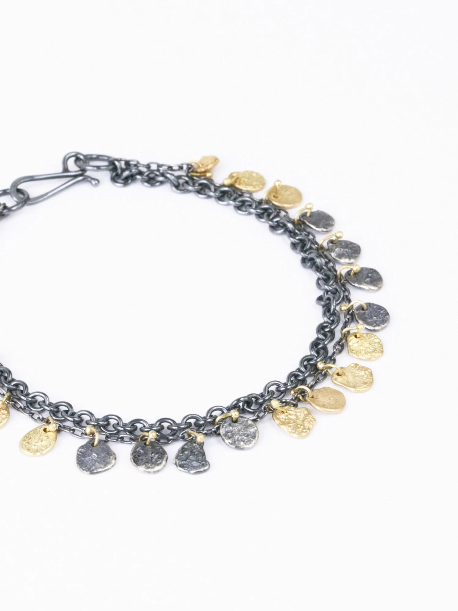 Bracelet has a cascade of handmade 18k and oxidized silver charms held by 18k gold bead rings.