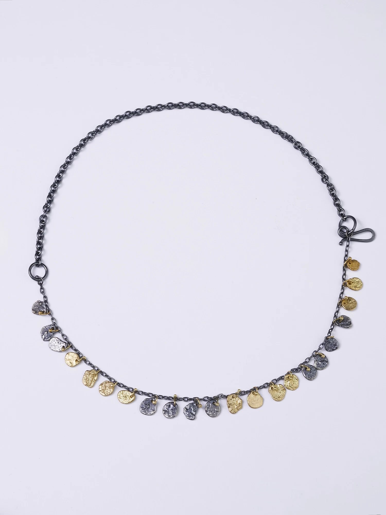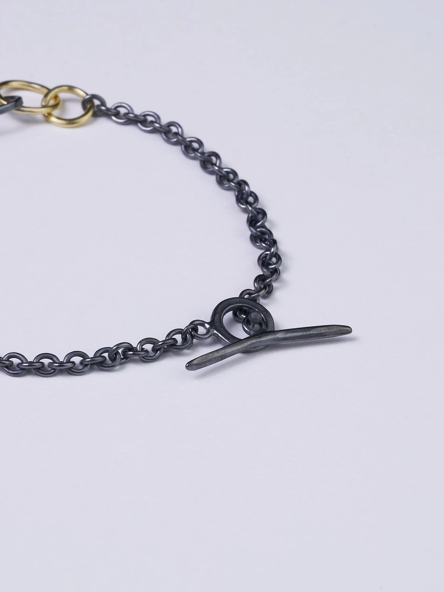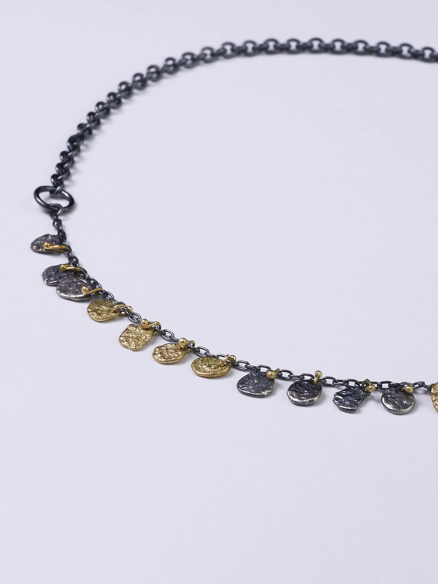 Bracelet has a cascade of handmade 18k and oxidized silver charms held by 18k gold bead rings.