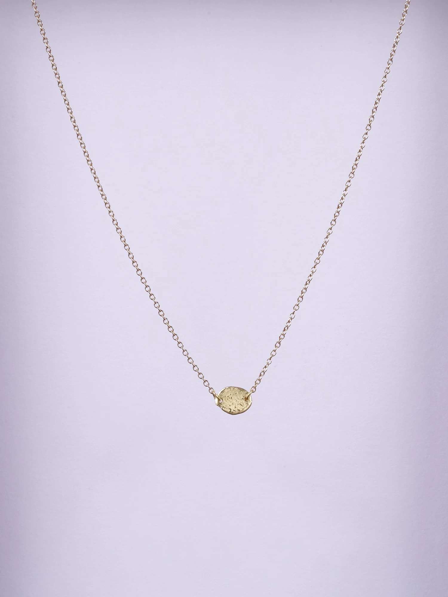 A handmade charm of 18k gold, attached to a 14k gold chain via 18k bead rings.