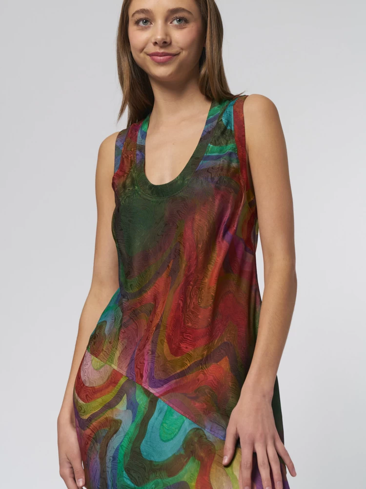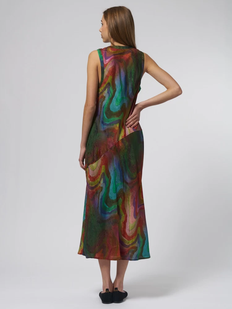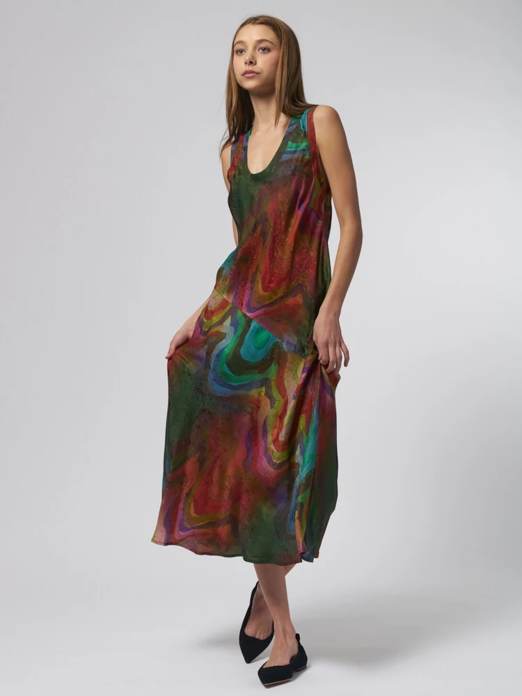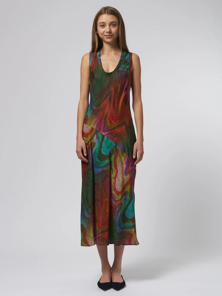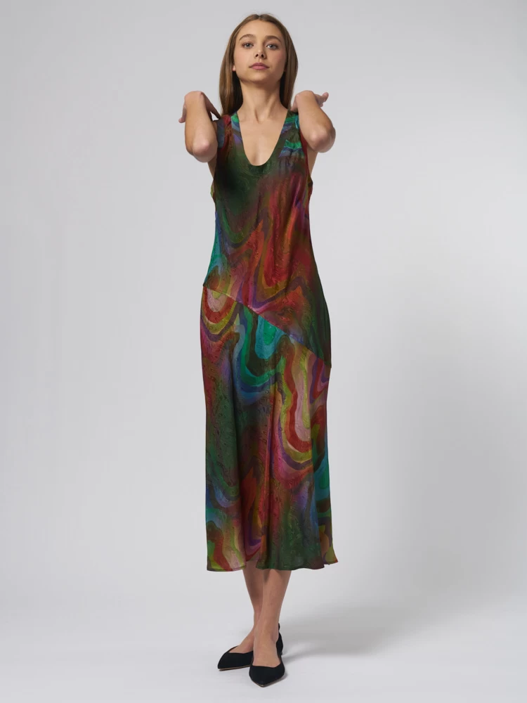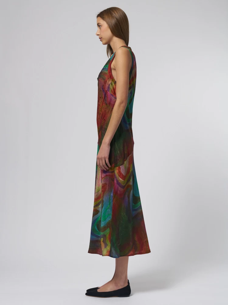 Flattering bias-cut in silk abstract graphic, it drapes elegantly over the body and feels effortless