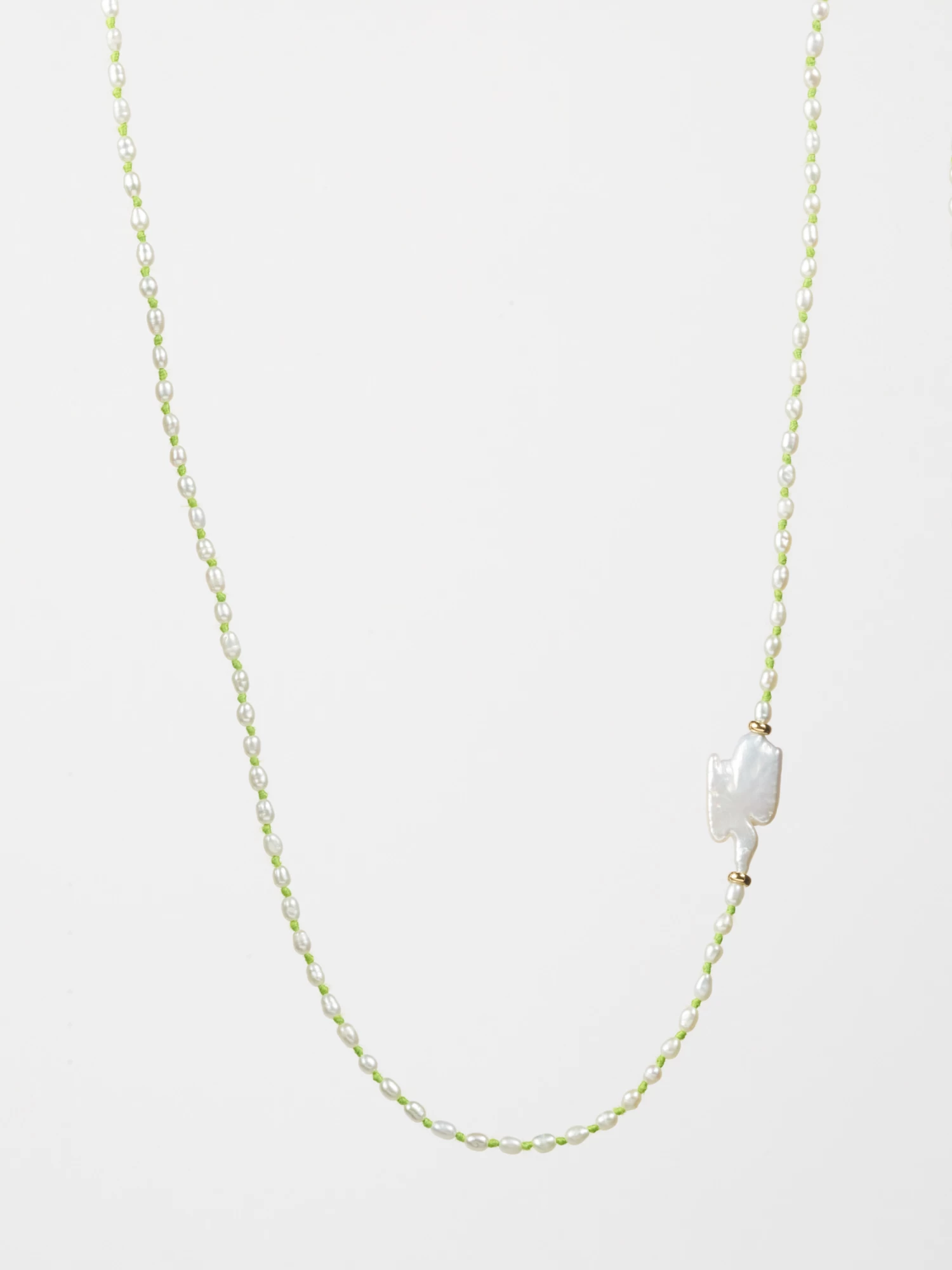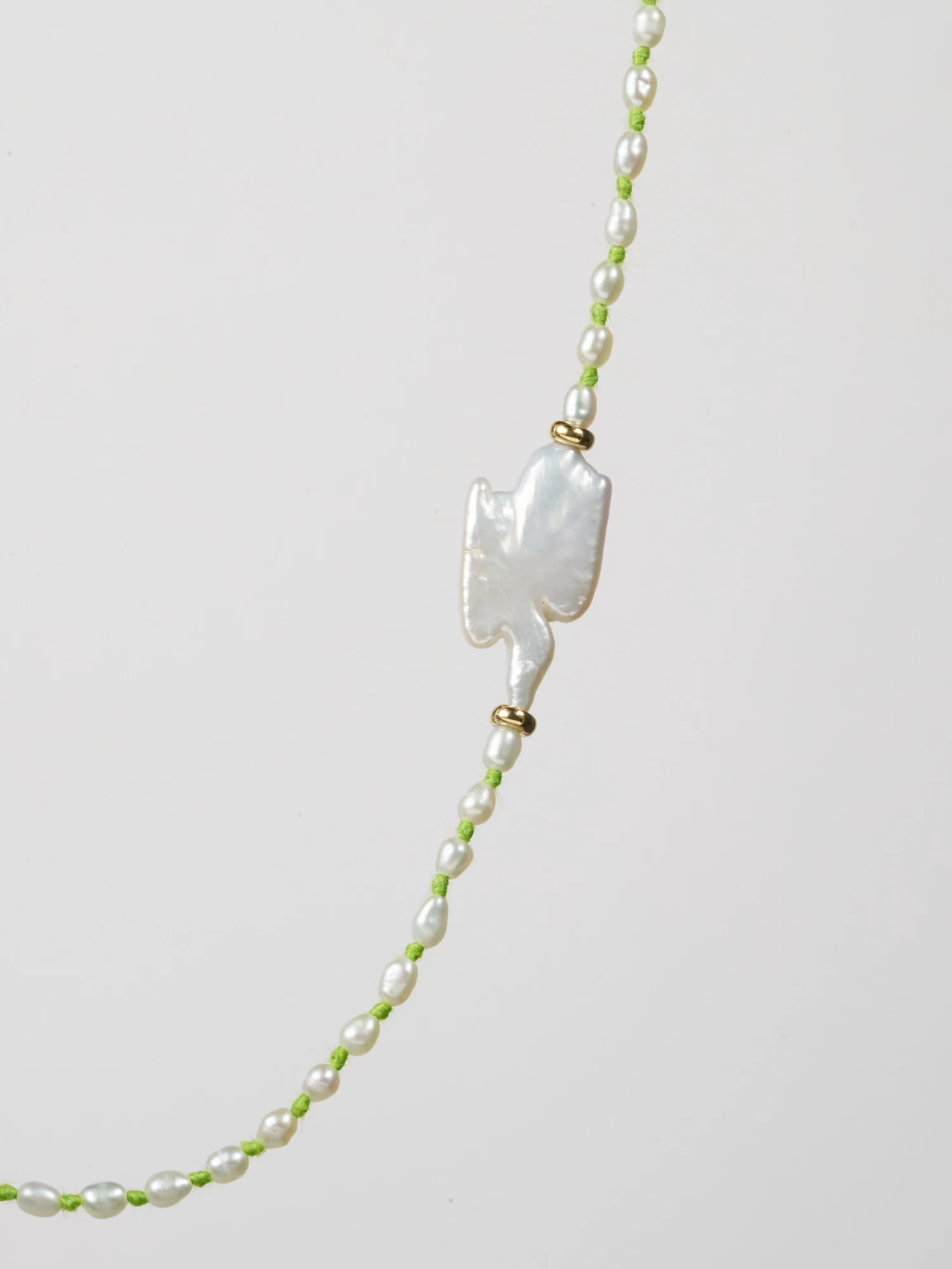 Mini Pearls knotted with green cotton thread.